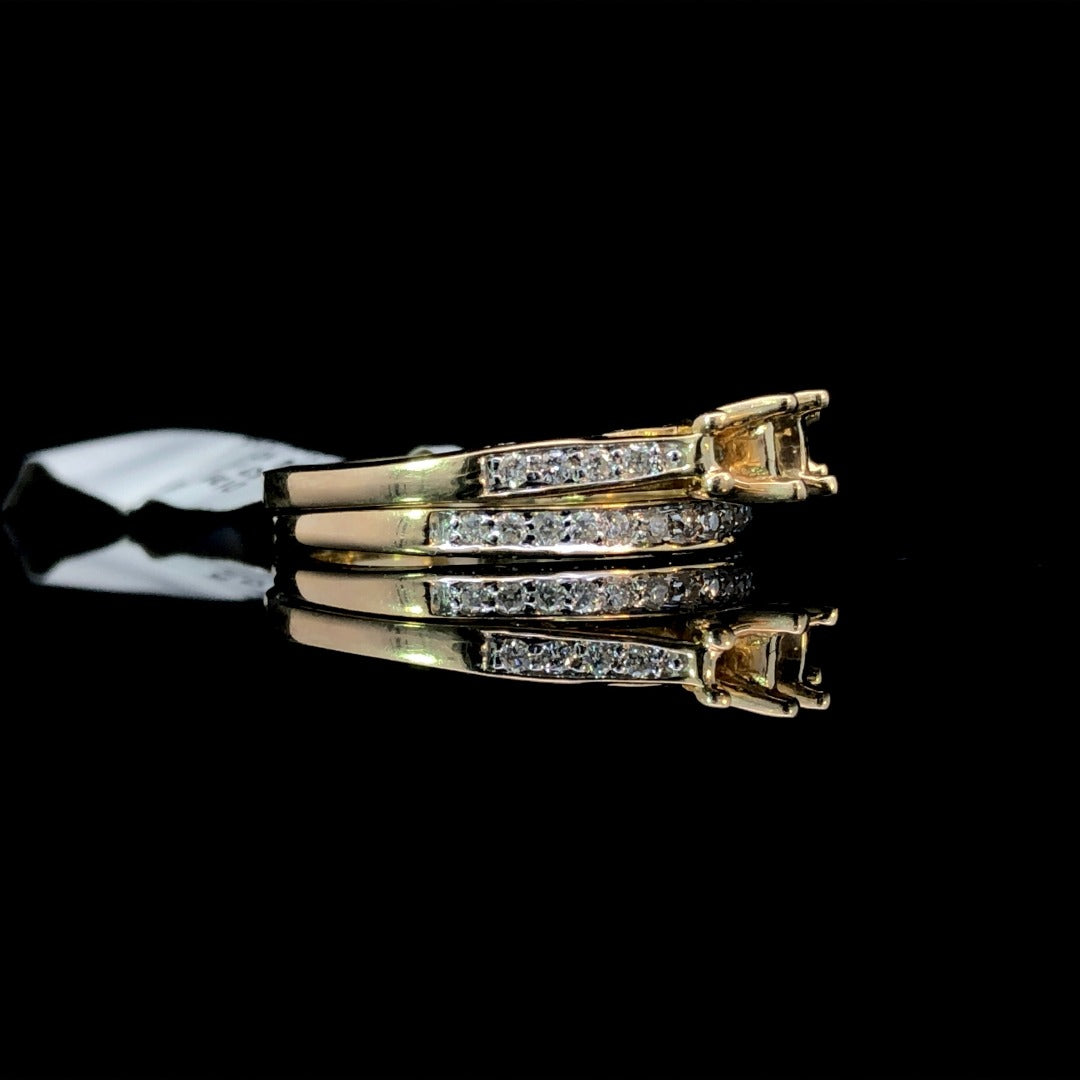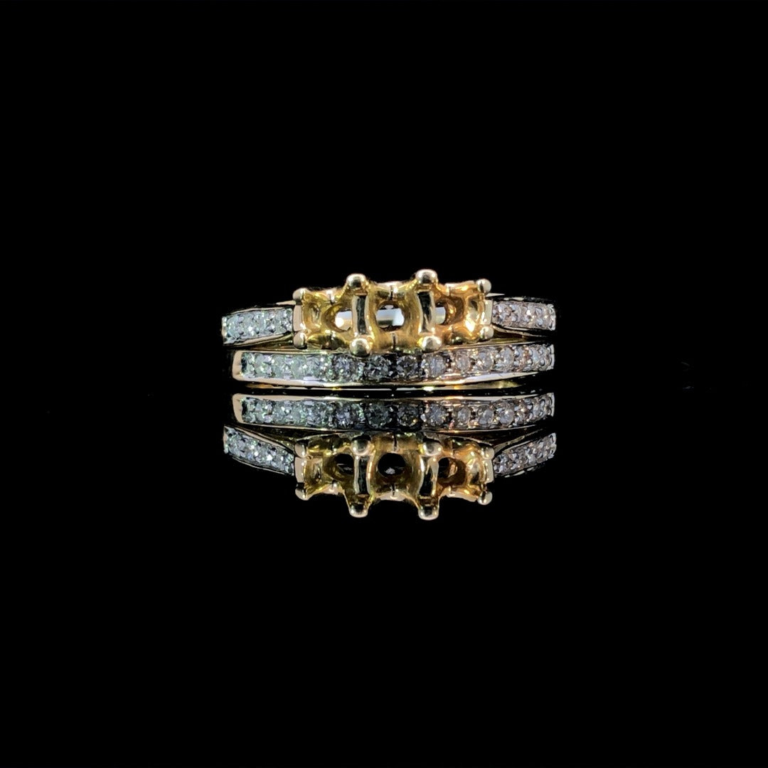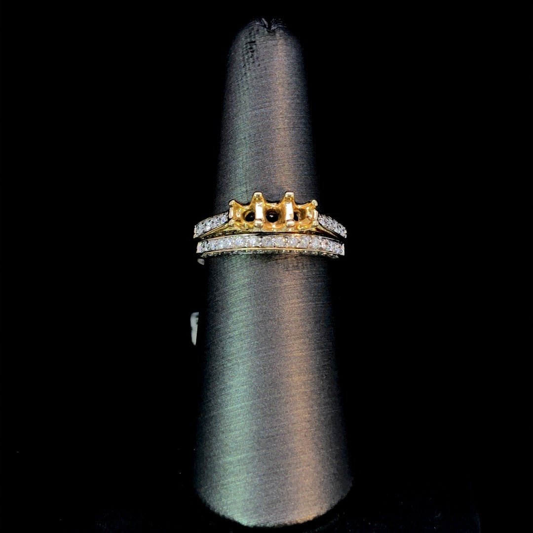 This stunning 3 stone semi and band set is sure to make a statement. The open center allows for customization with your choice of center stones from our vast selection. The warm 14kt yellow gold setting is accented by .53ctw of sparkling round diamonds. Elevate your style with this classic and elegant choice. Price is for the semi and band only. Center stones will be added at an additional cost. This ring is a size 7. If that size is not a perfect fit, first time sizing is free at the time of purchase. Additional sizing fees may apply.