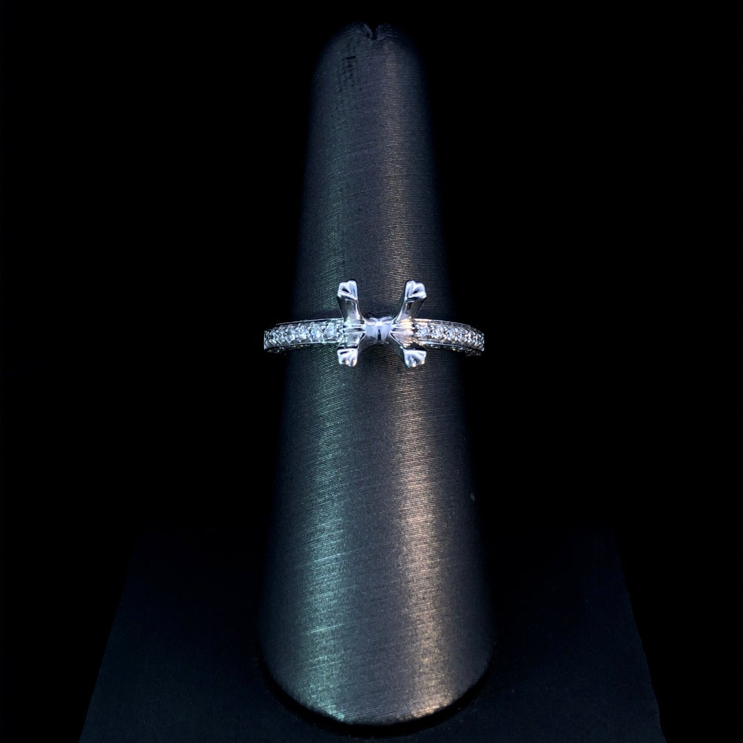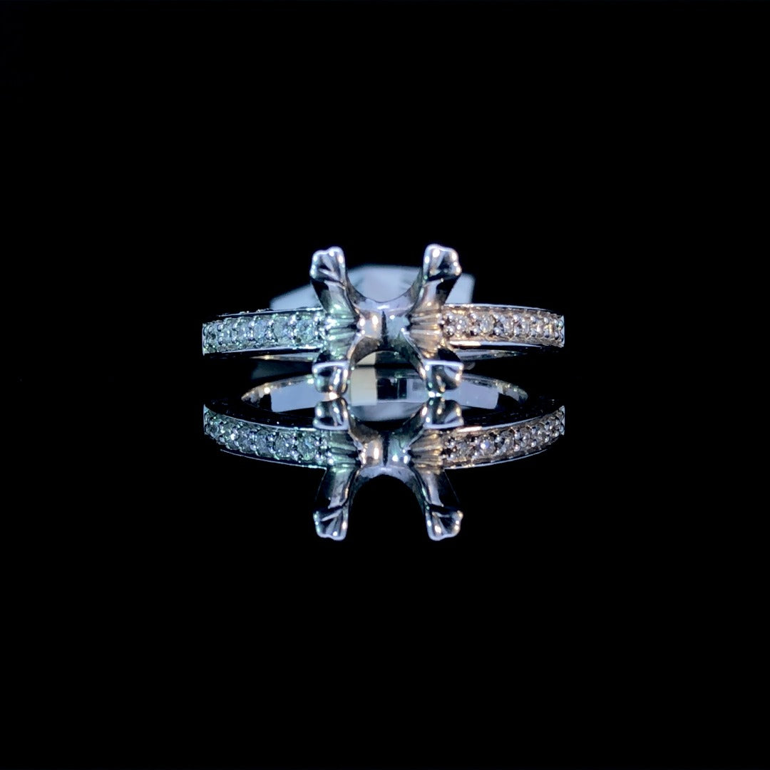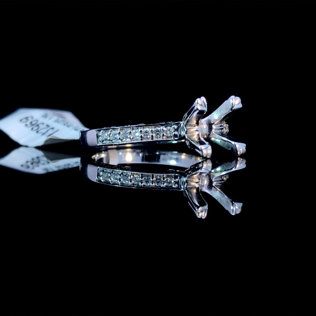 Create a breathtaking piece with this beautifully detailed semi mount. Intricate details, such as diamonds lining the band, a scallop design with 2 diamonds in each scallop, and .23ctw of round diamonds, add unique charm. Choose from our unmatched selection of center stones for a complete look. In 14kt white gold. Price is for the semi mount only. Center stone will be added at an additional cost. This ring is a size 6.5. If that size is not a perfect fit, first time sizing is free at the time of purchase. Additional sizing fees may apply.