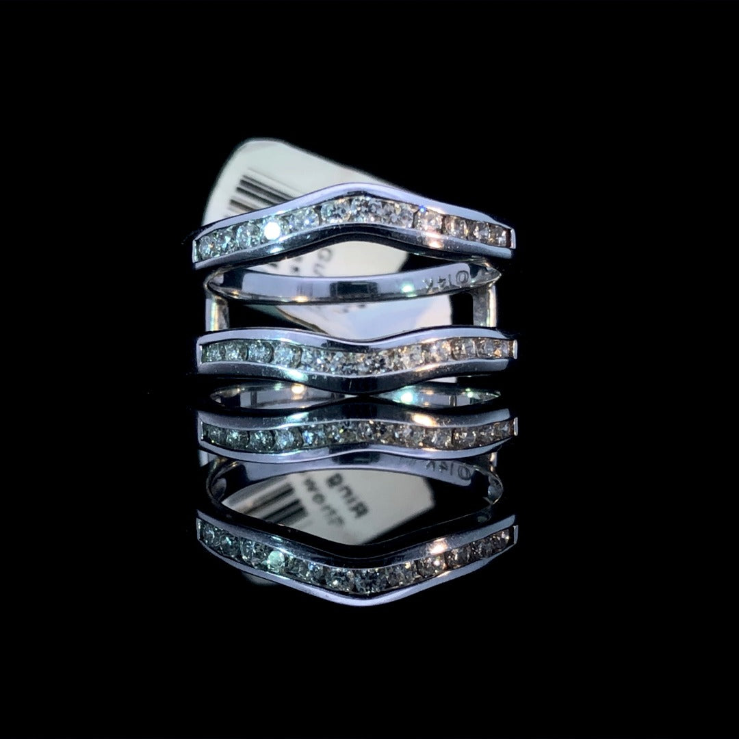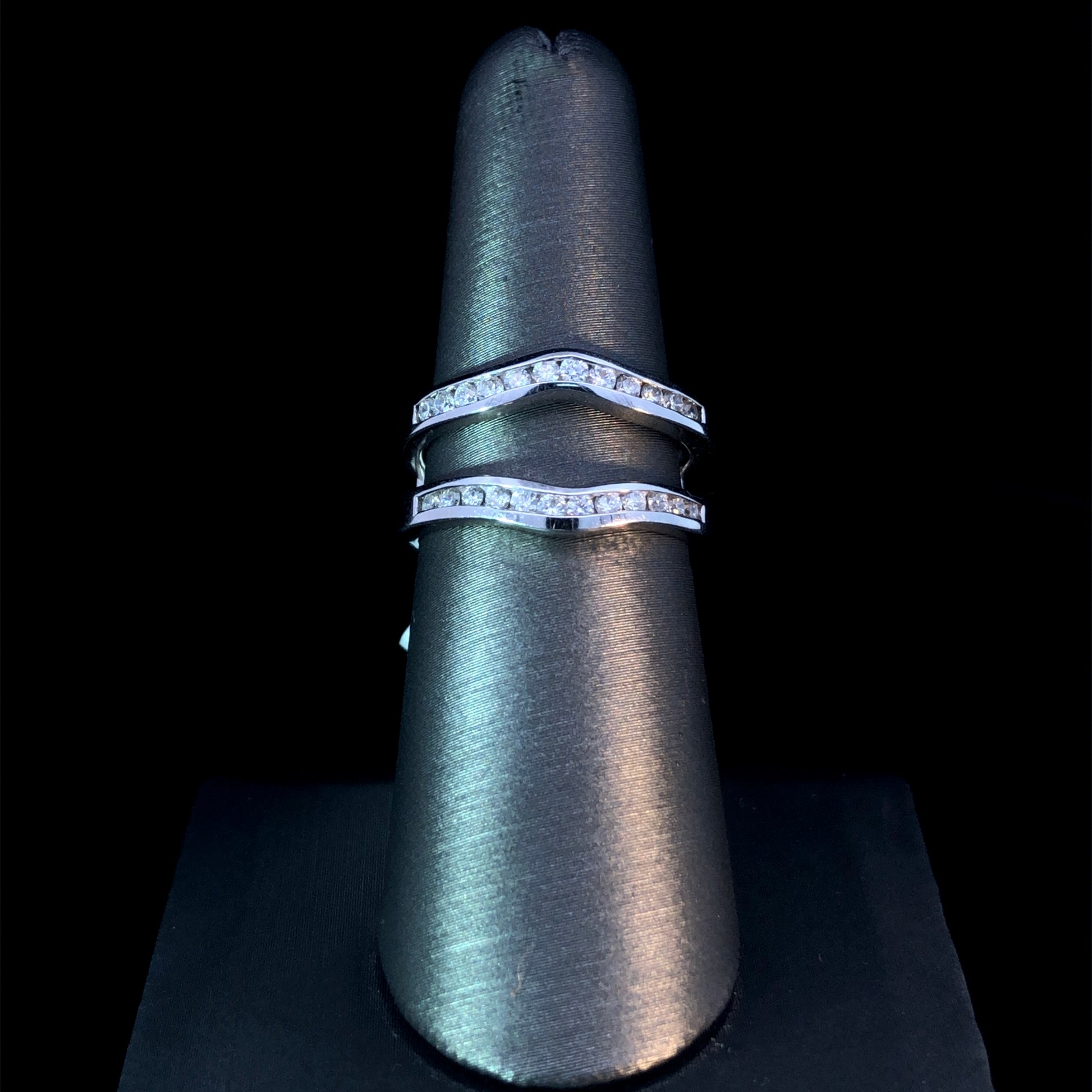 Illuminate your finger with timeless elegance. Our 14kt white gold diamond ring guard is studded with .50ctw of round diamond accents that sparkle against its lustrous finish. Feel the luxury of this classic piece and elevate any look with sophisticated brilliance. This ring is a size 7. If that size is not a perfect fit, first time sizing is free at the time of purchase. Additional sizing fees may apply.