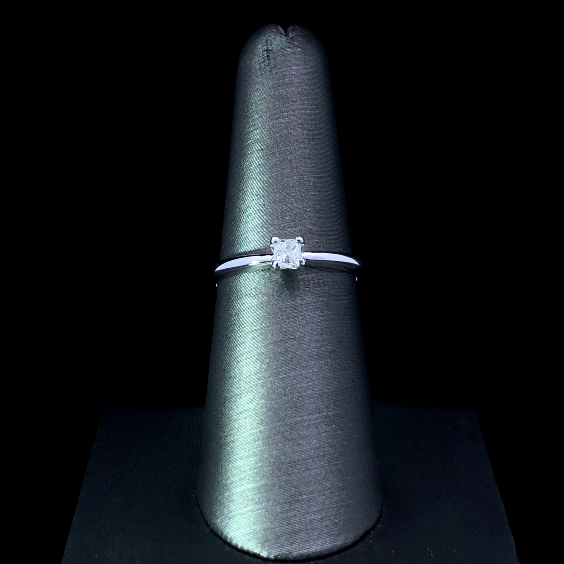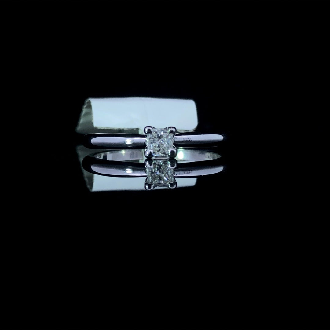 Undeniably elegant, this classic diamond solitaire ring will make you sparkle! Set in luxurious 14kt white gold, the princess cut diamond of .26 carats shines brightly, perfect for any occasion. Feel your most glamorous with this timeless ring. This ring is a size 7. If that size is not a perfect fit, first time sizing is free at the time of purchase. Additional sizing fees may apply.