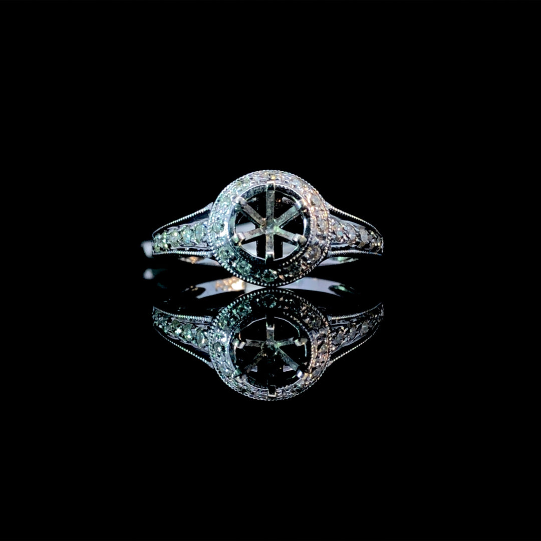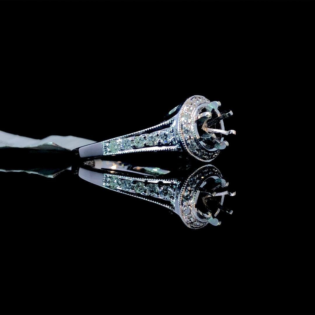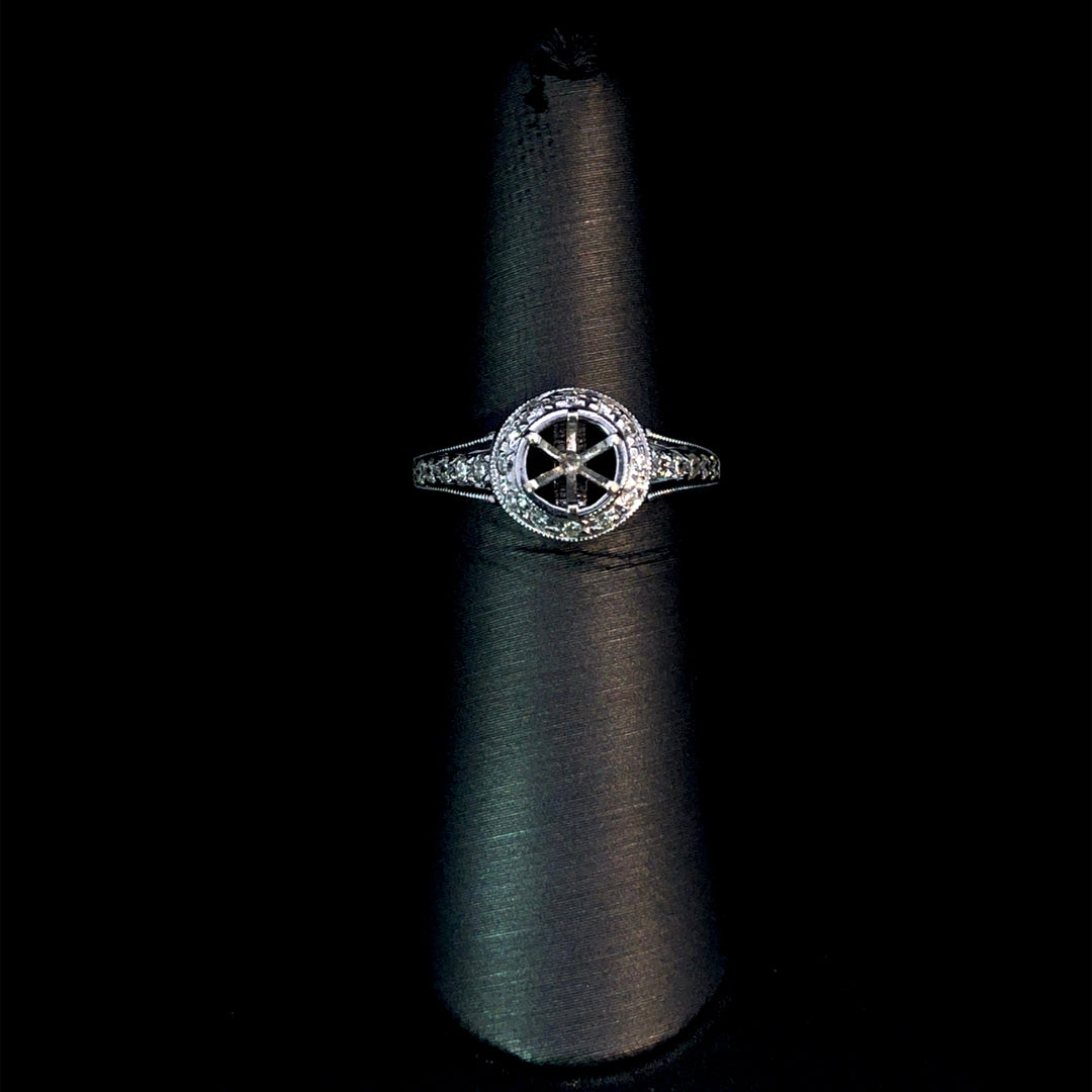 This elegant diamond semi mount ring features a round halo and delicate diamonds cascading along the band, totaling 0.32 ctw. Crafted in 14kt white gold with milgrain detailing, it offers a vintage-inspired charm. Personalize this beautiful piece by selecting your ideal center stone from our extensive collection of loose stones to create a truly unique symbol of your love. Price is for the semi mount only. Center stone will be added at an additional cost. This ring is a size 6. If that size is not a perfect fit, it can be sized up 2 sizes for free at the time of purchase. Additional sizing fees may apply.