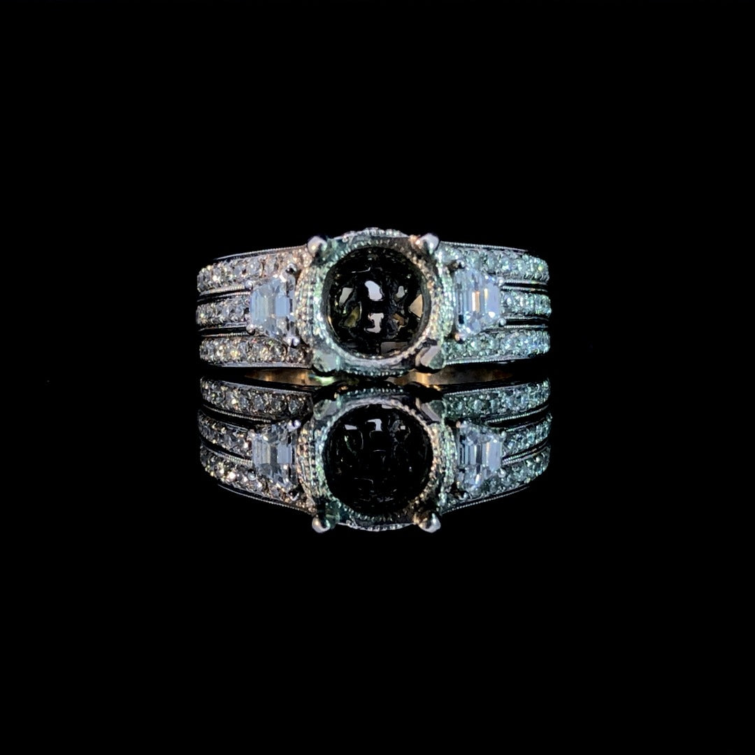 Indulge in elegance with our .75 ctw diamond semi mount. Adorned with 2 emerald cut side stones and a triple row of sparkling round diamonds, this 14kt white gold piece features intricate etchings for added allure. Select your own center stone for a truly bespoke look. Luxurious and exquisite. Price is for the semi mount only. Center stone will be added at an additional cost. This ring is a size 5.5. If that size is not a perfect fit, first time sizing is free at the time of purchase. Additional sizing fees may apply.