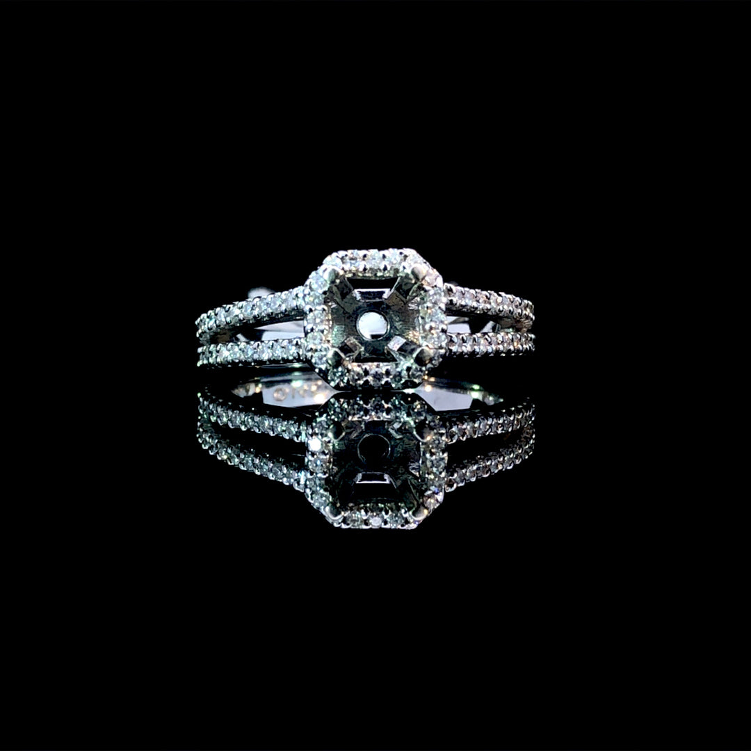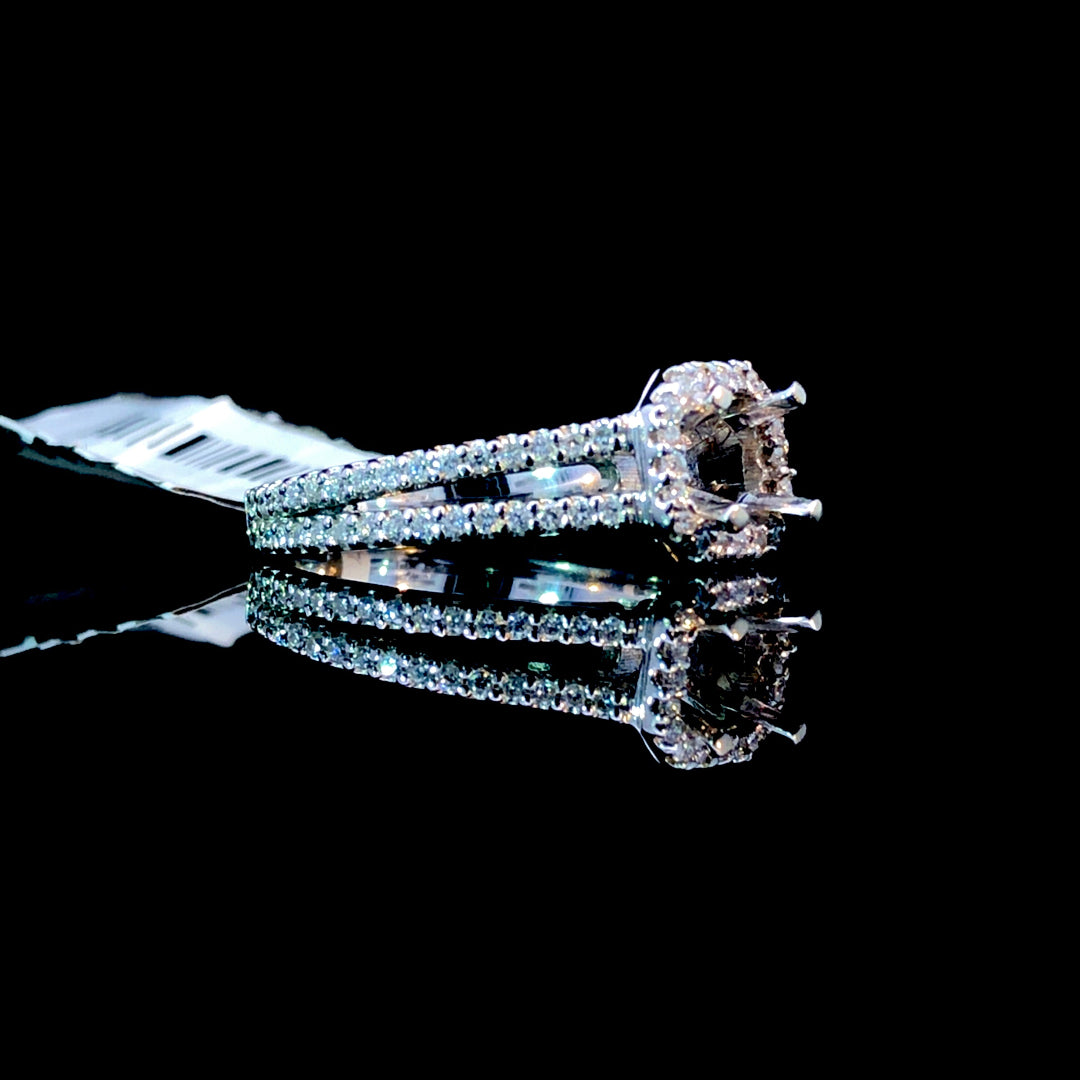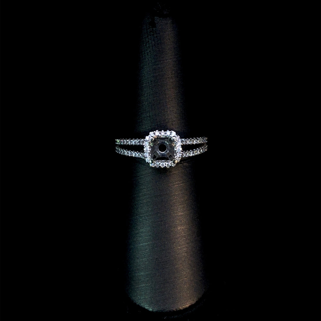This exquisite diamond semi-mount offers a stunning foundation for your perfect engagement ring. Featuring a halo and split shank adorned with .40ctw of round diamonds set in 14kt white gold, it sparkles beautifully from every angle. Customize it by selecting your ideal center stone from our extensive loose diamond collection to create a ring that truly reflects your unique love story. Price is for the semi mount only. Center stone will be added at an additional cost. This ring is a size 7. If that size is not a perfect fit, first time sizing is free at the time of purchase. Additional sizing fees may apply.