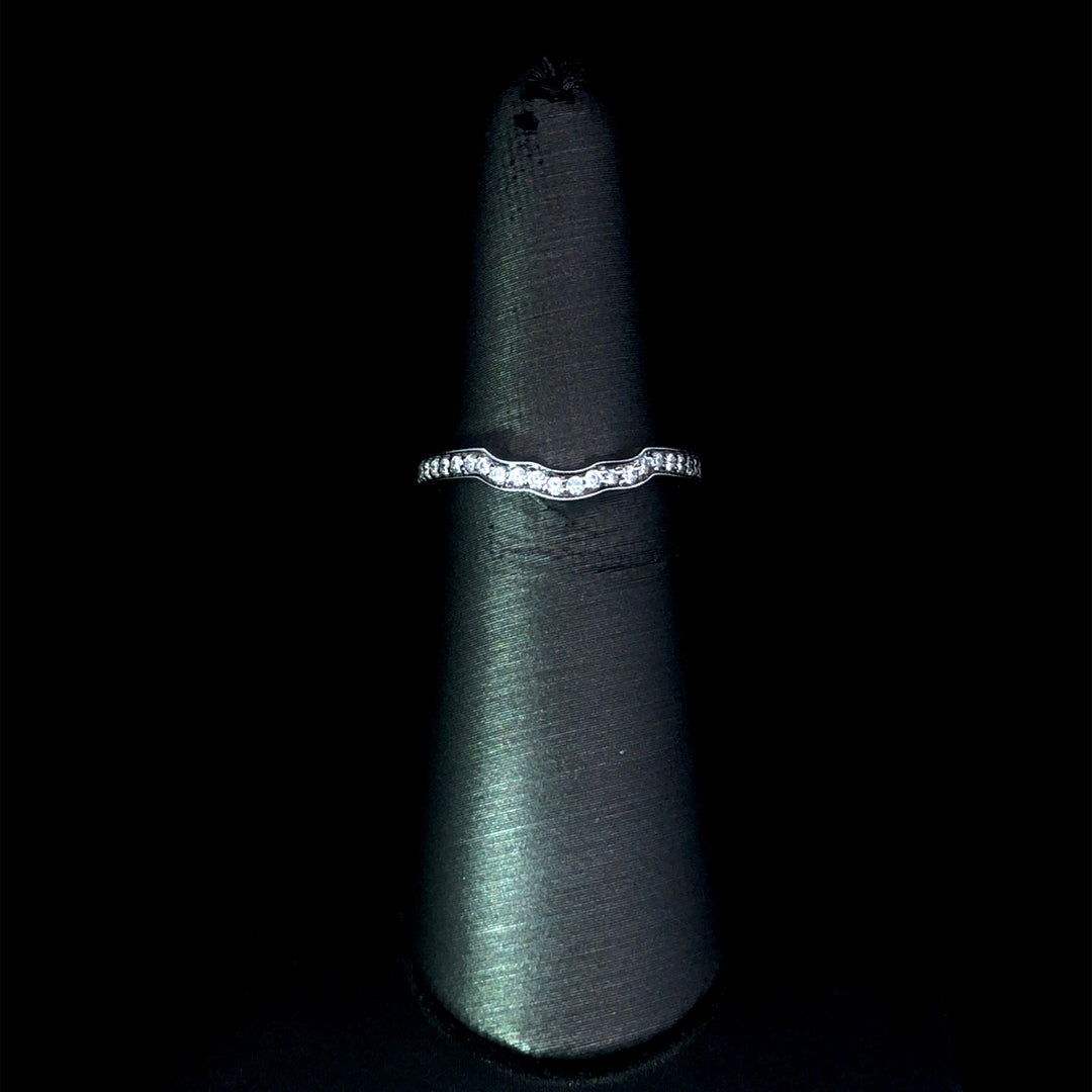 Add a touch of elegance to your jewelry collection with this diamond contour band. Made of 14kt white gold and accented with .19ctw of round diamonds, this band is perfect for any special occasion. Its unique design beautifully highlights the diamonds, adding a sparkle to any outfit. This ring is a size 6. If that size is not a perfect fit, first time sizing is free at the time of purchase. Additional sizing fees may apply.
