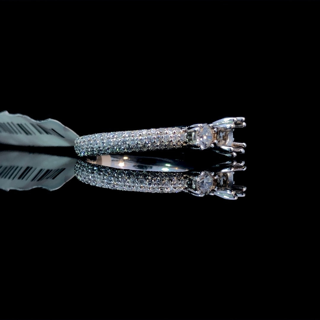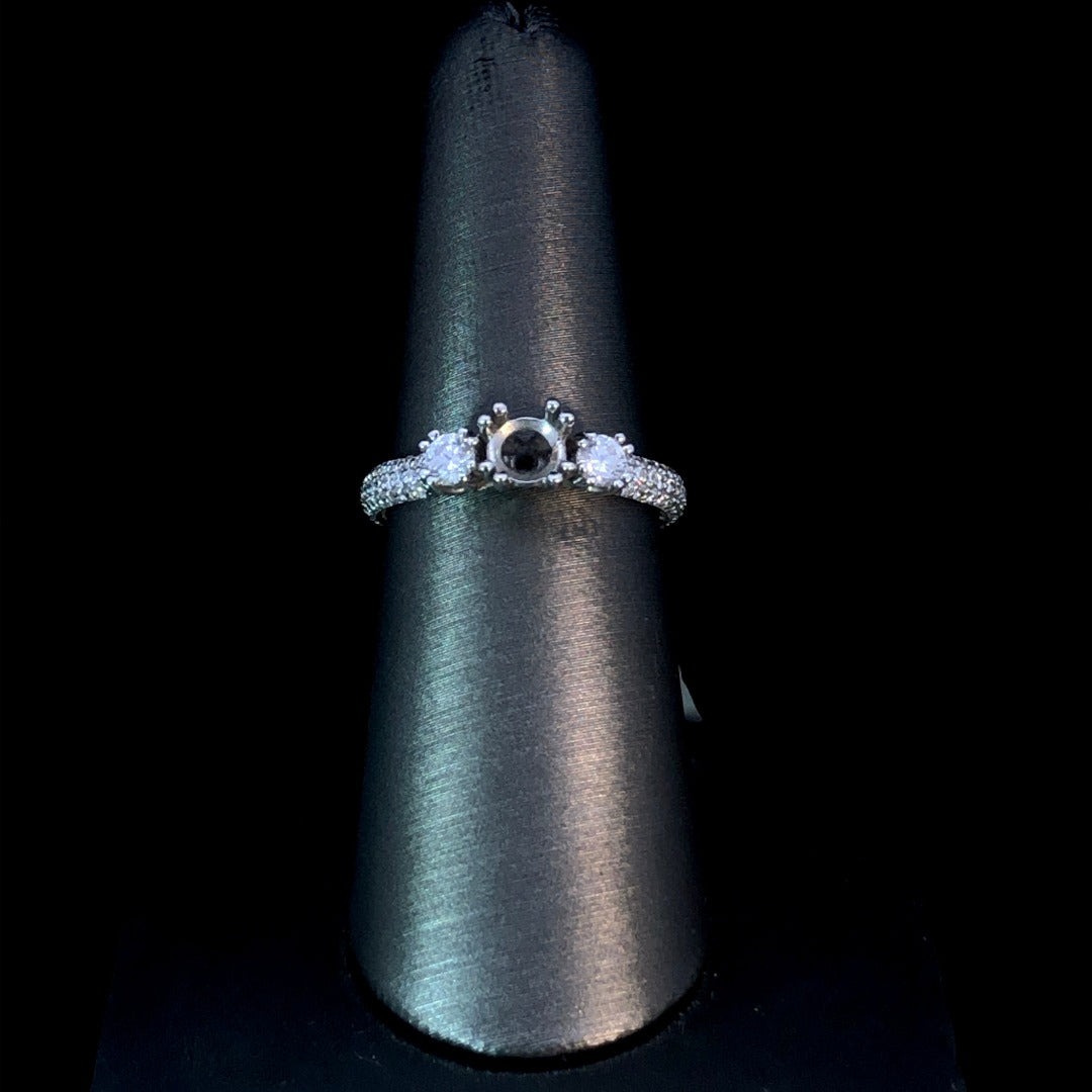 This beautiful diamond semi mount is crafted in gleaming 14kt white gold, featuring a space for a round center stone with 2 round side stones and smaller diamonds pave set down the band. With a total diamond weight of .73ctw, this piece is sure to be admired! Add your own center stone to make it uniquely yours. Eye-catching and elegant, this is a must-have item for any jewelry lover! Price is for the semi mount only. Center stone will be added at an additional cost. This ring is a size 7. If that size is not a perfect fit, first time sizing is free at the time of purchase. Additional sizing fees may apply.