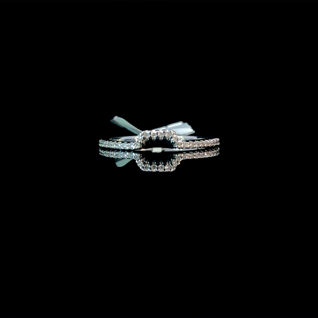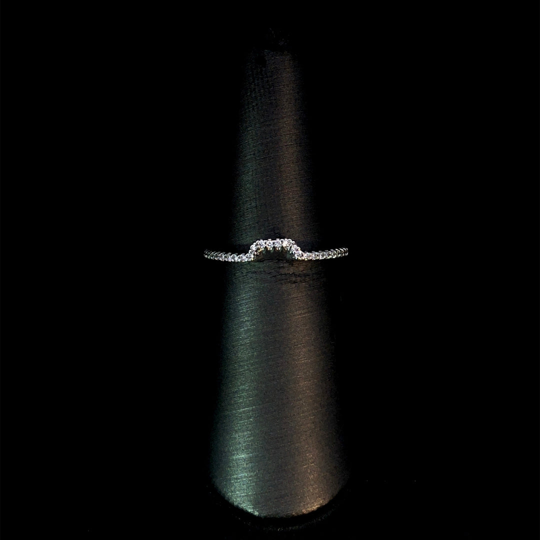 Complete your engagement ring with this stunning curved diamond band. Made with 14kt white gold and featuring .19ctw of round diamonds, this band is designed to fit seamlessly against certain styles of engagement rings for a flawless look. This ring is a size 7. If that size is not a perfect fit, first time sizing is free at the time of purchase. Additional sizing fees may apply.