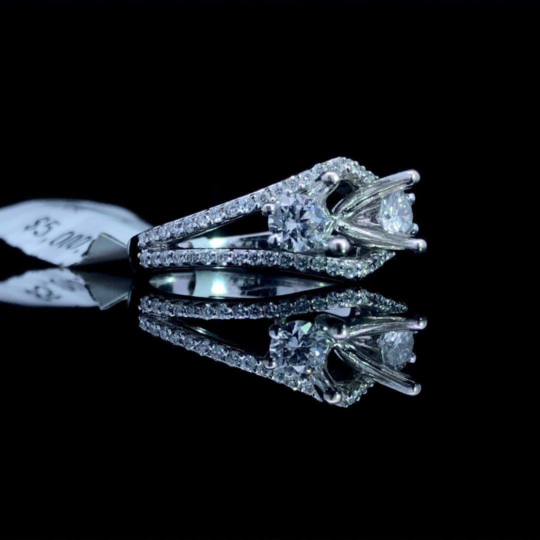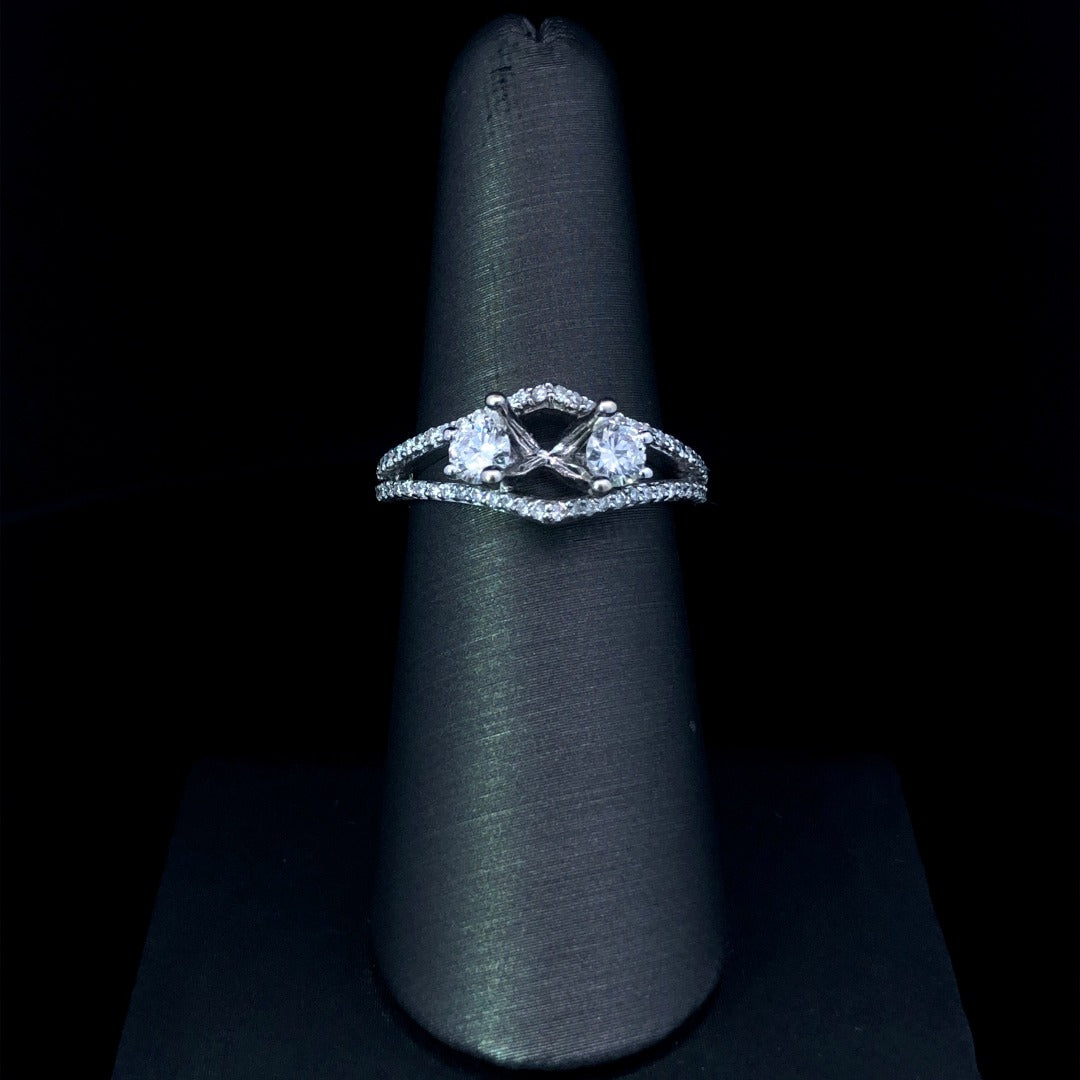 Indulge in a unique and classic style with this gorgeous diamond semi mount. 2 round larger side stones and diamonds along the split shank create a stunning .74ctw of diamond weight. Made with 14kt white gold, add your desired center stone from our selection to complete this gorgeous piece! Price is for the semi mount only. Center stone will be added at an additional cost. This ring is a size 6.5. If that size is not a perfect fit, first time sizing is free at the time of purchase. Additional sizing fees may apply.