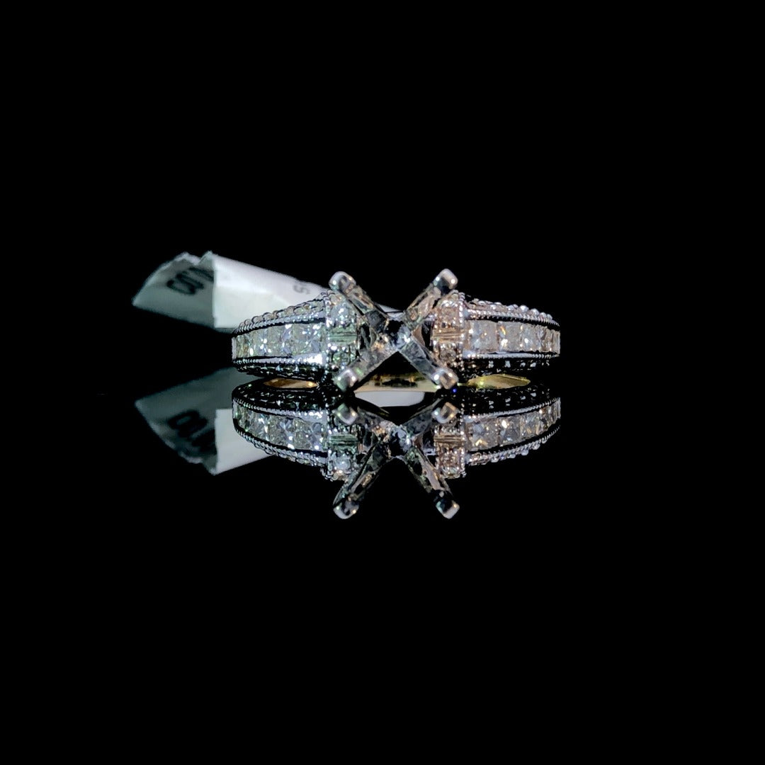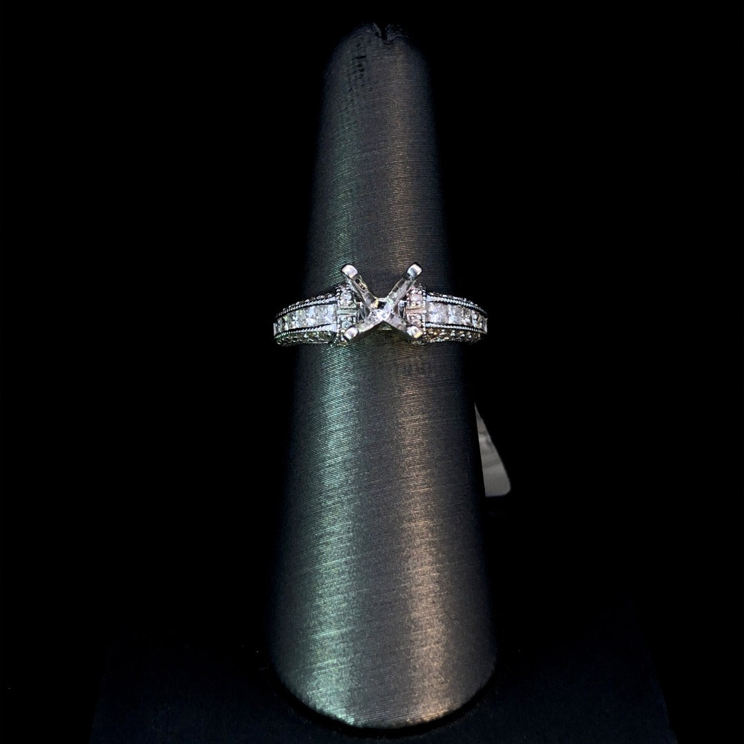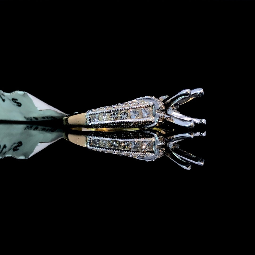 Indulge in luxury with this stunning diamond semi mount. The 2-tone design, .78ctw round diamond accents, and delicate milgrain detailing all add a touch of elegance and sophistication. Personalize this piece with your choice of center stone and shine from every angle. Price is for the semi mount only. Center stone will be added at an additional cost. This ring is a size 6.5. If that size is not a perfect fit, first time sizing is free at the time of purchase. Additional sizing fees may apply.
