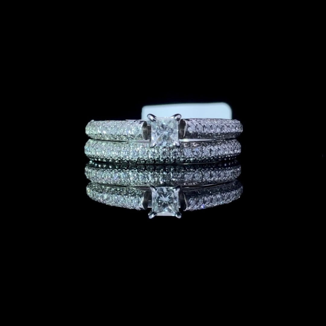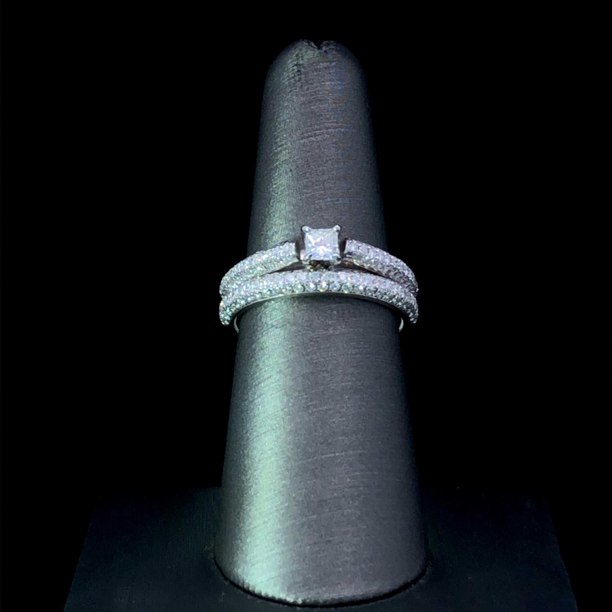 This breathtaking bridal set radiates with beauty. The princess-cut diamond in the center is perfectly complemented by the dazzling diamond pavé set diamonds that line the entire band and gives a spark of sophistication. The accompanying wedding band features the same exquisite craftsmanship for a combined diamond weight of 1.00ctw, all beautifully set in 14kt white gold. Capture memories for a lifetime with this stunning set. This is a size 7. If that size is not a perfect fit, first time sizing is free at the time of purchase. Additional sizing fees may apply.