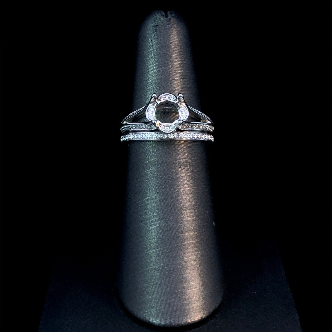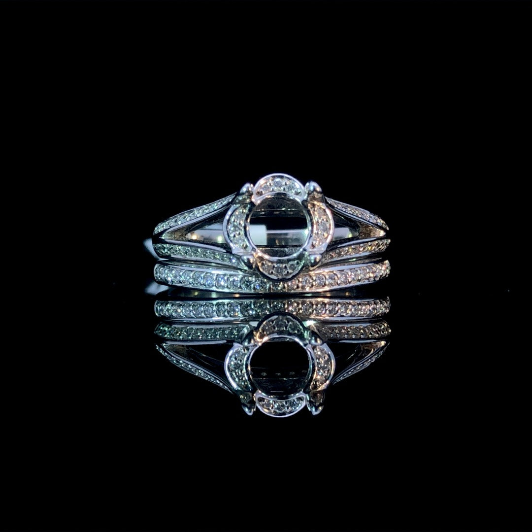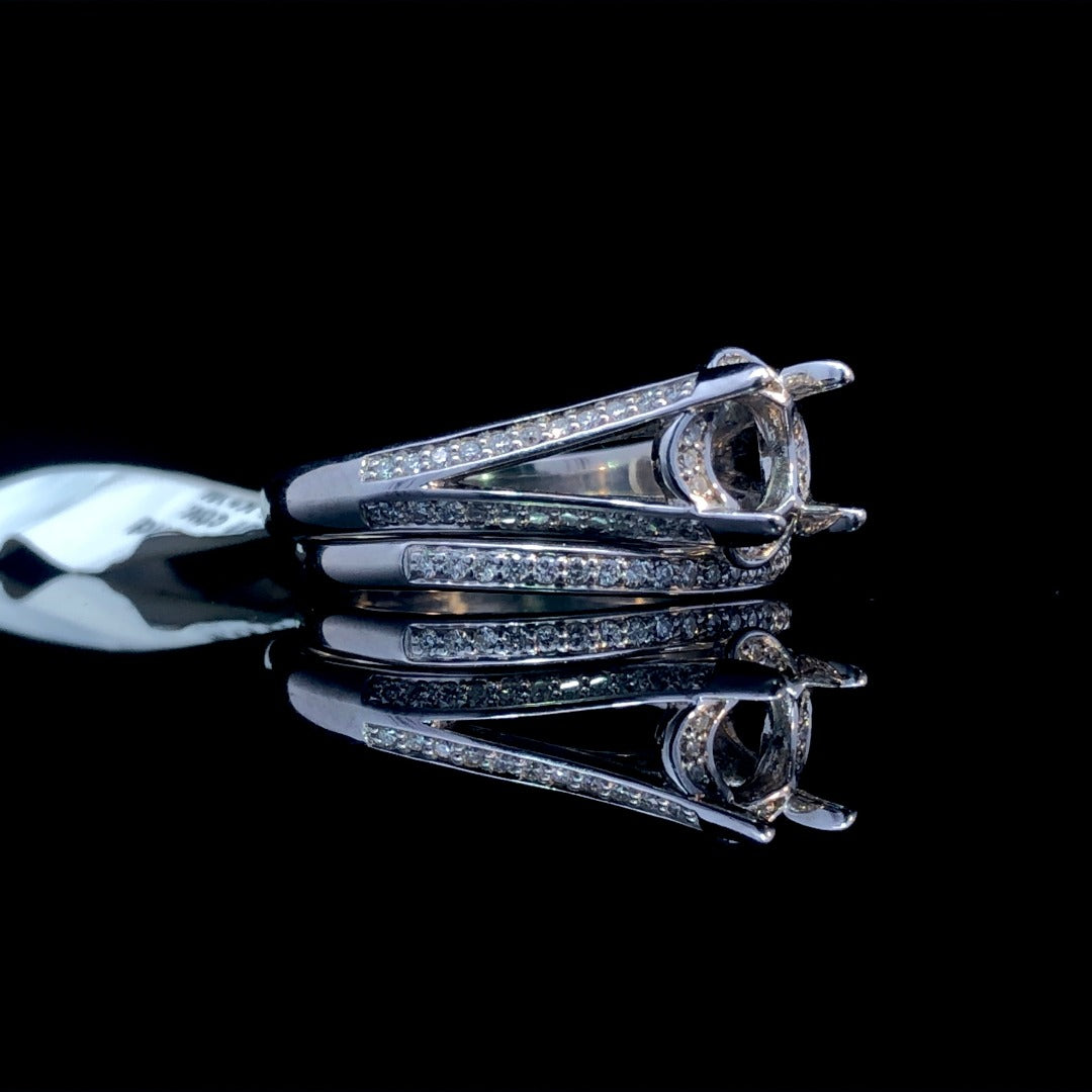 This stunning 14kt white gold diamond semi mount is perfect for creating a unique and elegant engagement ring. Its decorative halo, split shank band, and .31ctw of round diamond accents make it a show-stopping piece. Complete the set with the matching .12ctw contour band (sold separately) for a head turning set. Price is for the semi mount only. Center stone will be added at an additional cost. This ring is a size 6. If that size is not a perfect fit, first time sizing is free at the time of purchase. Additional sizing fees may apply.