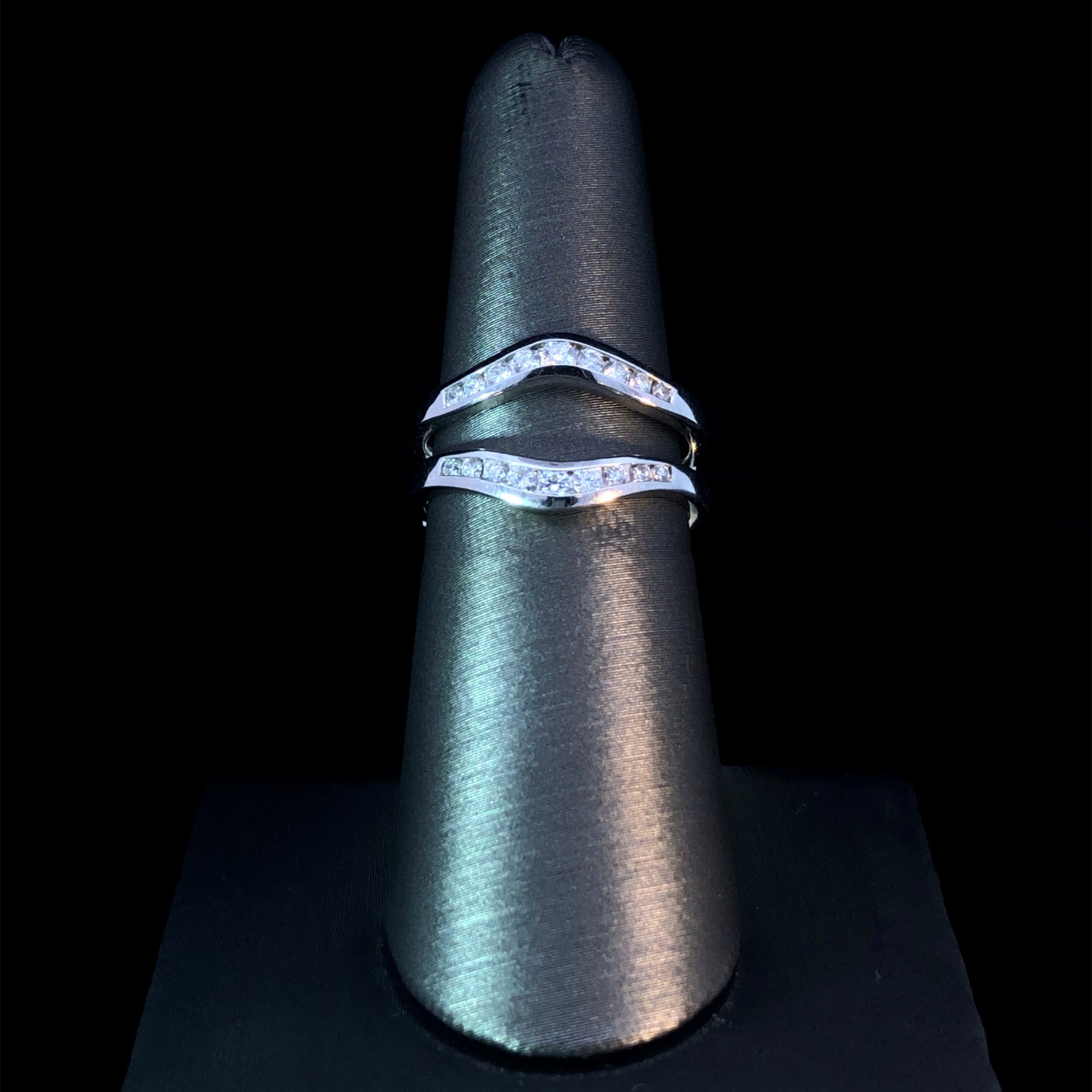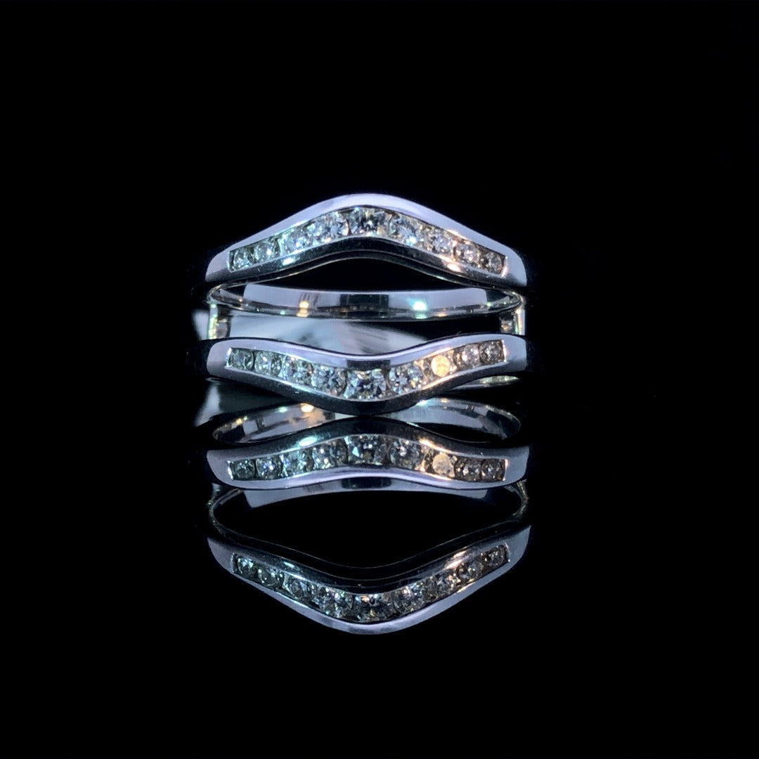 Add timeless elegance to your diamond ring with this classic diamond ring guard. Crafted from 14kt white gold, this ring guard features .48ctw of round diamonds, sparkling brilliantly in a channel-set design. Elevate your look with this sophisticated diamond ring guard. This ring is a size 7. If that size is not a perfect fit, first time sizing is free at the time of purchase. Additional sizing fees may apply.