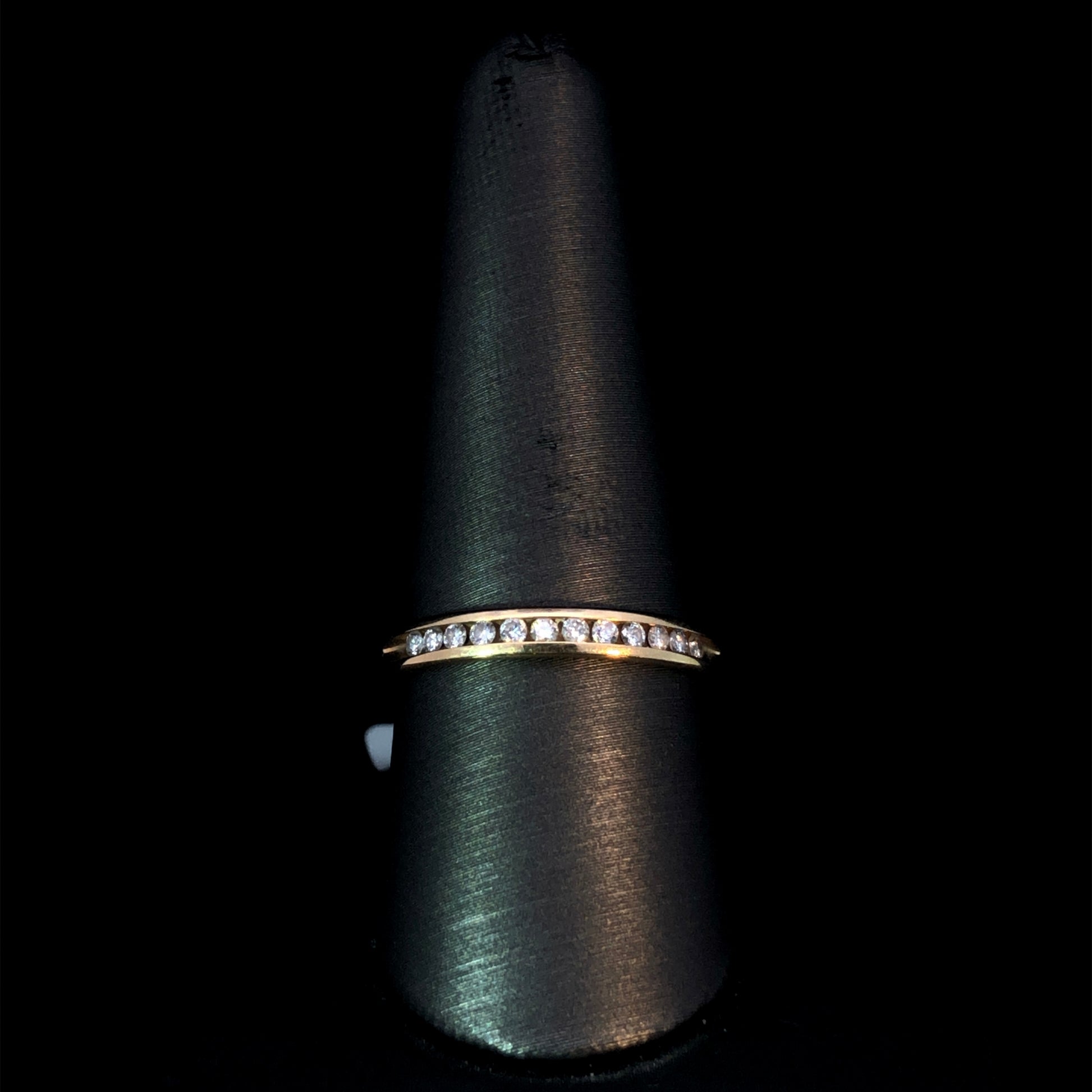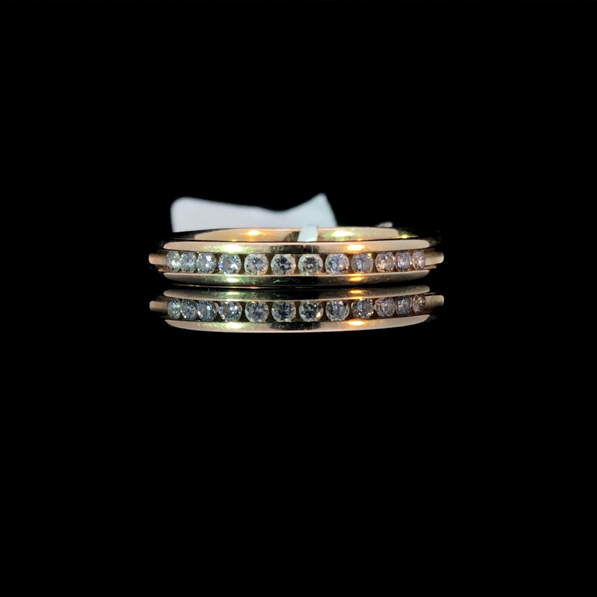 Indulge in the timeless elegance of this diamond band, featuring .25ctw of brilliant round diamonds expertly channel set in luxurious 14kt gold. This exquisite band adds a touch of sophistication to any look, making it the perfect accessory for those who appreciate the finer things in life. This ring is a size 9.5. If that size is not a perfect fit, first time sizing is free at the time of purchase. Additional sizing fees may apply.