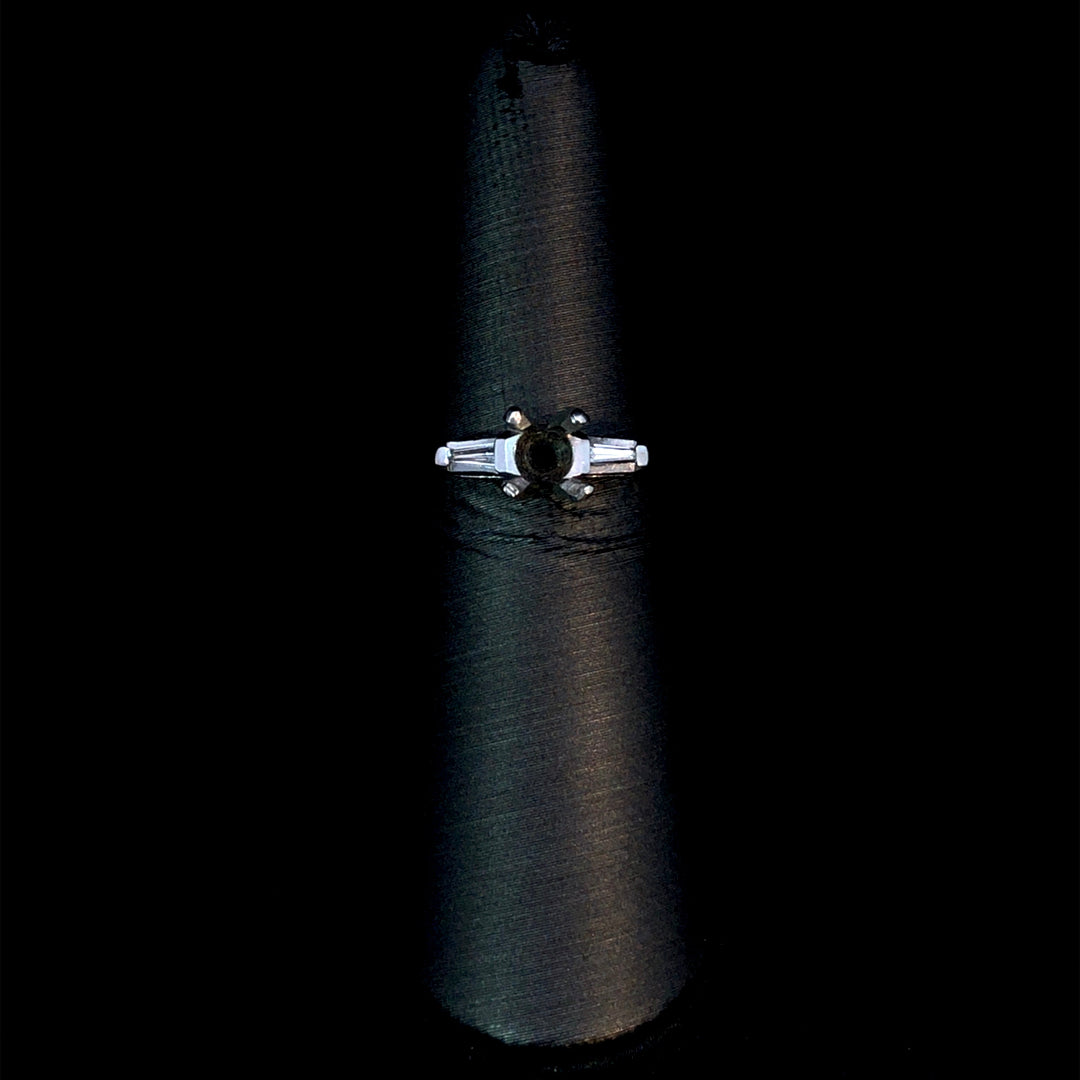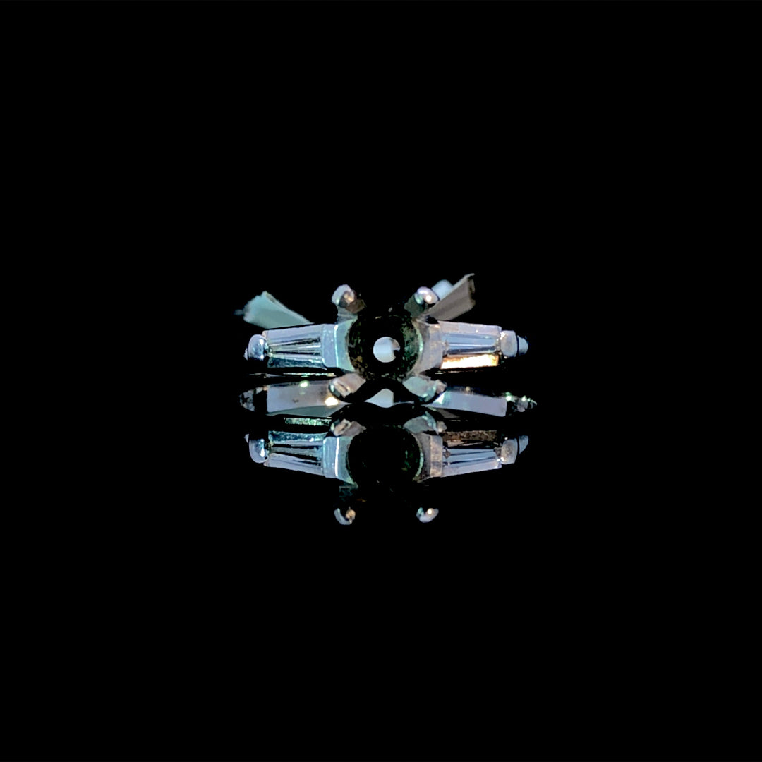 This classic diamond semi-mount showcases two baguette diamonds totaling .15ctw set in 14kt white gold. Its simple and elegant design provides a perfect frame for your chosen center stone, allowing you to personalize this beautiful piece from our extensive selection of loose diamonds. Price is for the semi mount only. Center stone will be added at an additional cost. This ring is a size 6. If that size is not a perfect fit, it can be sized up 2 sizes for free at the time of purchase. Additional sizing fees may apply.