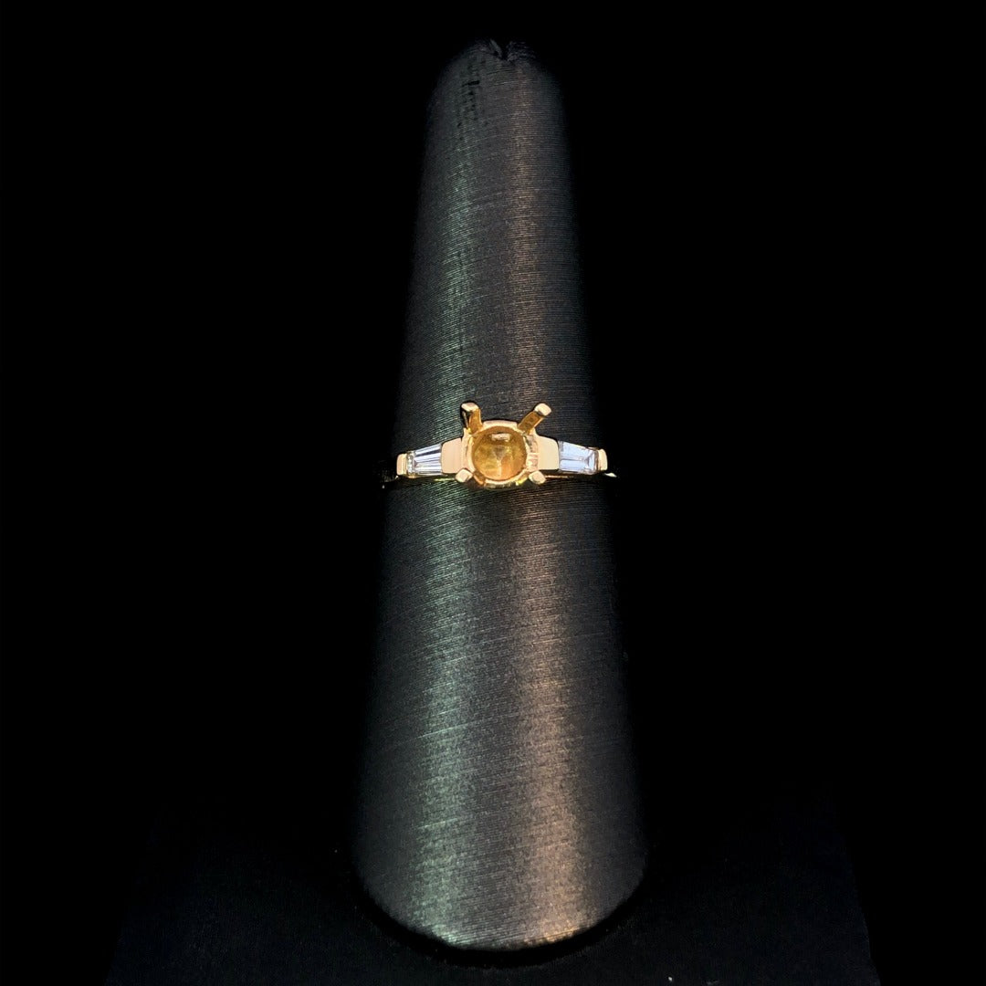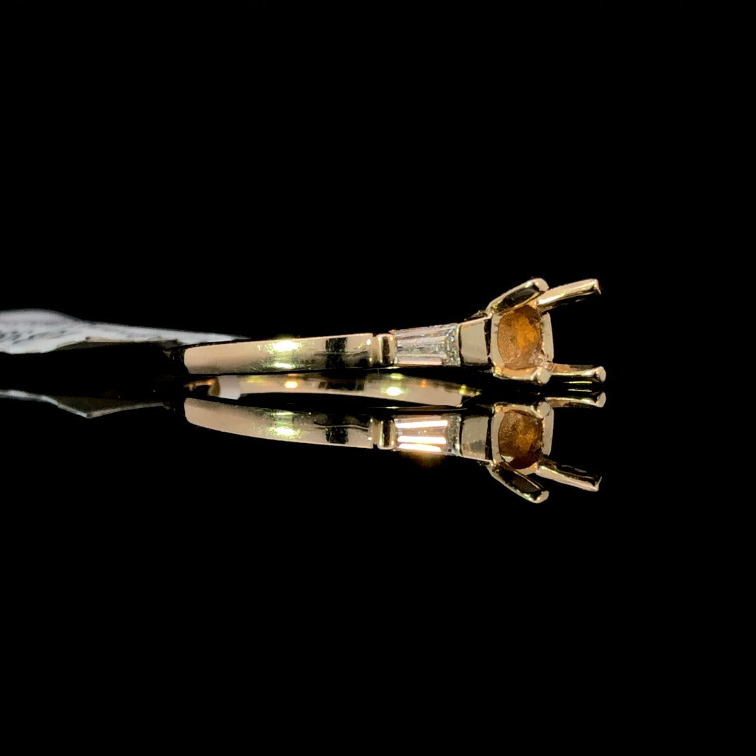This stunning 14kt yellow gold semi mount features two sparkling baguette side stones totaling .15ctw. Customize this classic piece by selecting your own center stone from our large selection. Create a timeless and unique piece of jewelry with endless options. Price is for the semi mount only. Center stone will be added at an additional cost. This ring is a size 7.25. If that size is not a perfect fit, first time sizing is free at the time of purchase. First time sizing is free at the time of purchase.