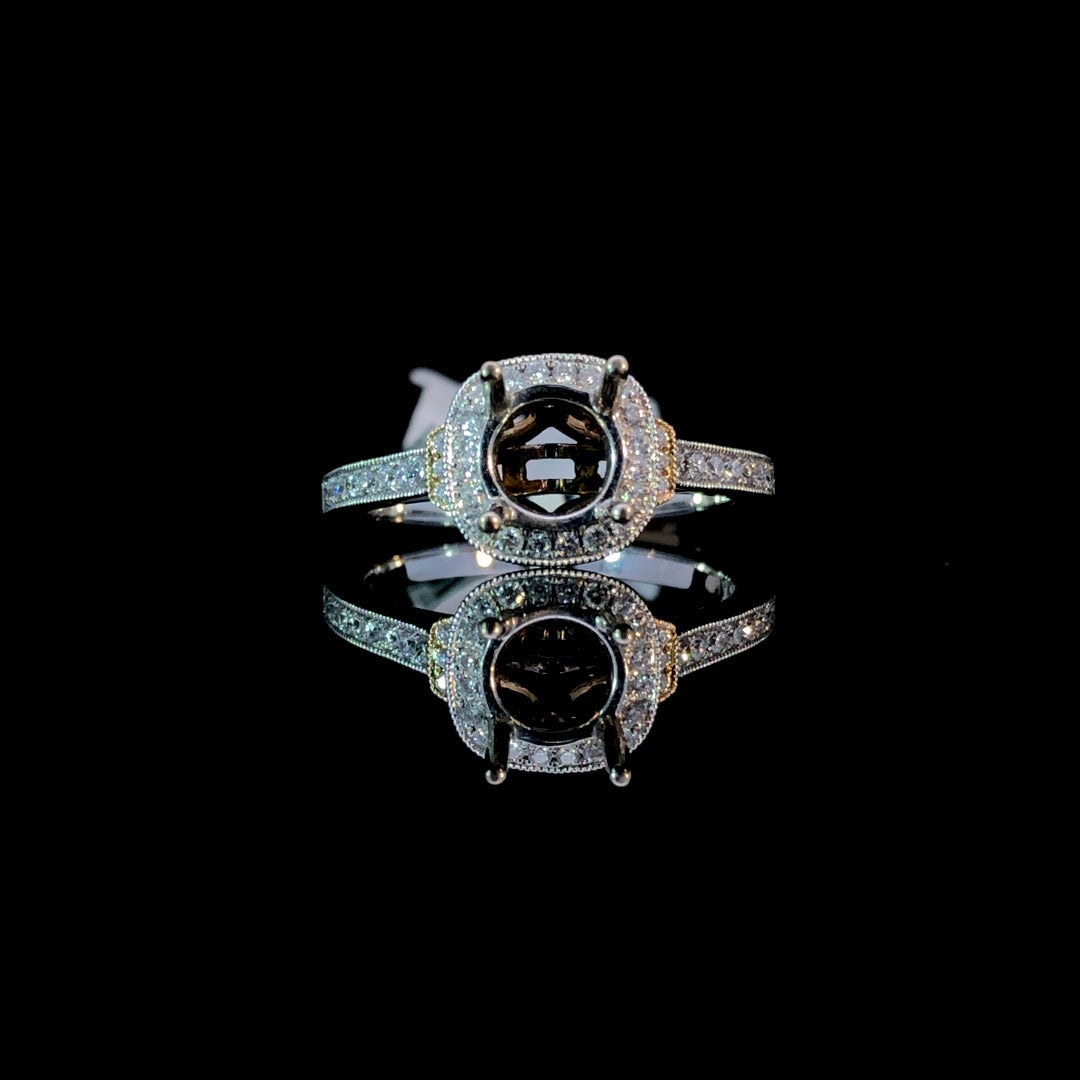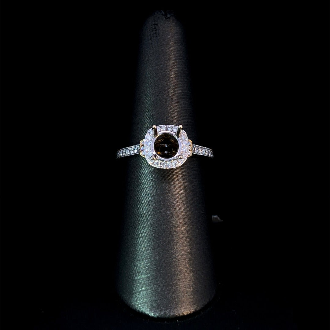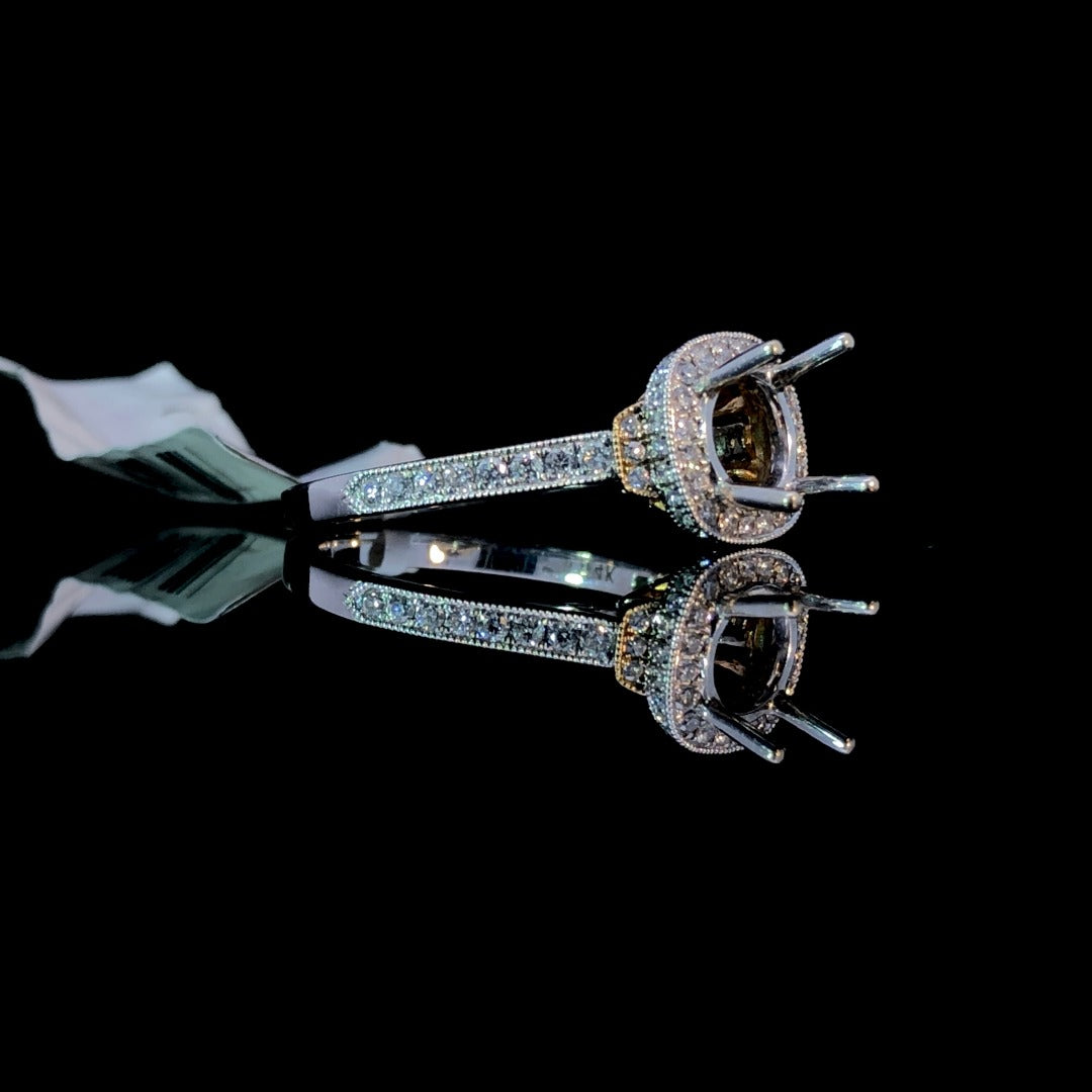 Elevate your style with our stunning diamond semi mount. The 2-tone white and yellow gold design features a cushion-shaped halo adorned with sparkling diamonds on all sides. The band is also embellished with diamonds, while yellow gold accents add a unique touch. Choose your center stone from our unmatched selection for a truly breathtaking piece. Price is for the semi mount only. Center stone will be added at an additional cost. This ring is a size 7. If that size is not a perfect fit, first time sizing is free at the time of purchase. Additional sizing fees may apply.