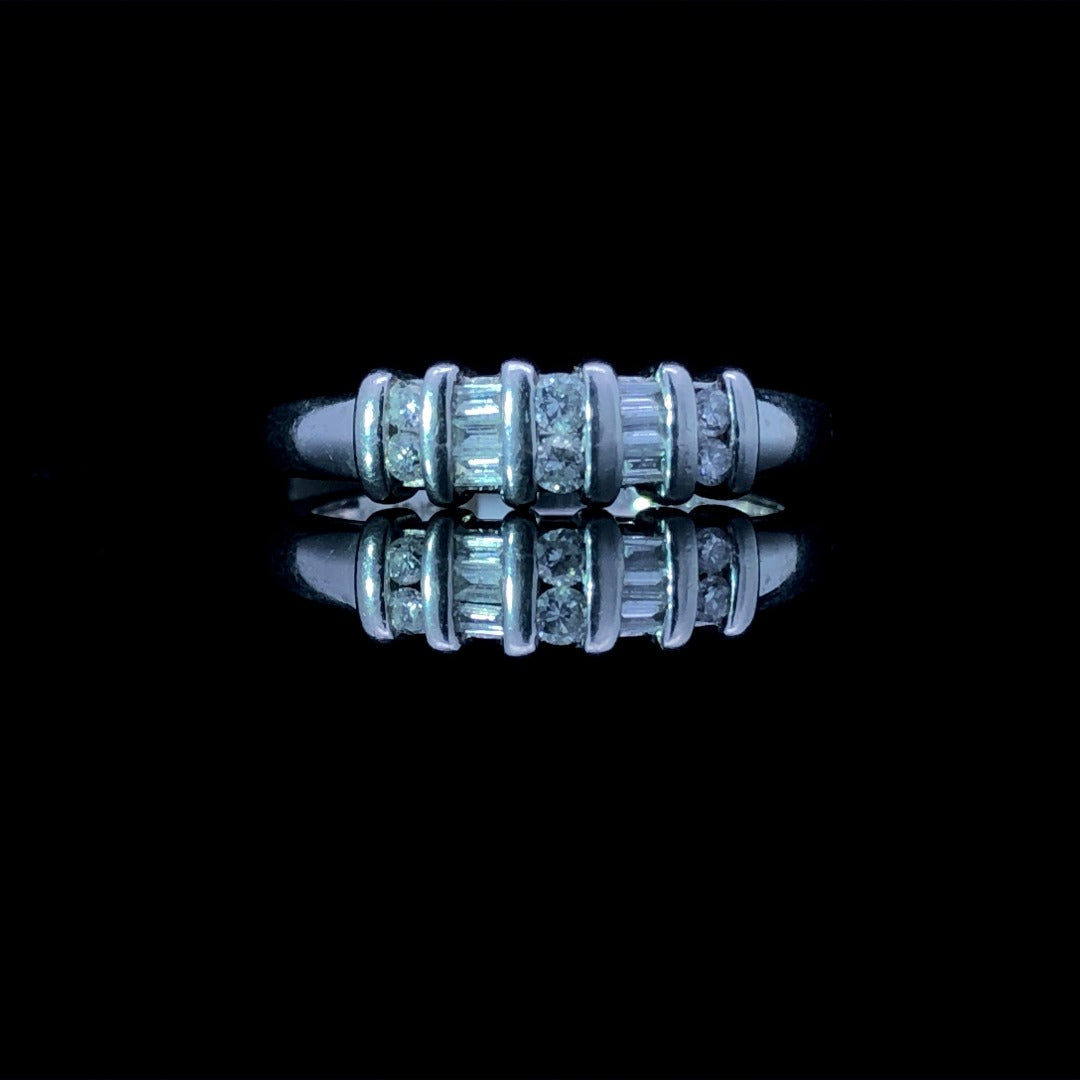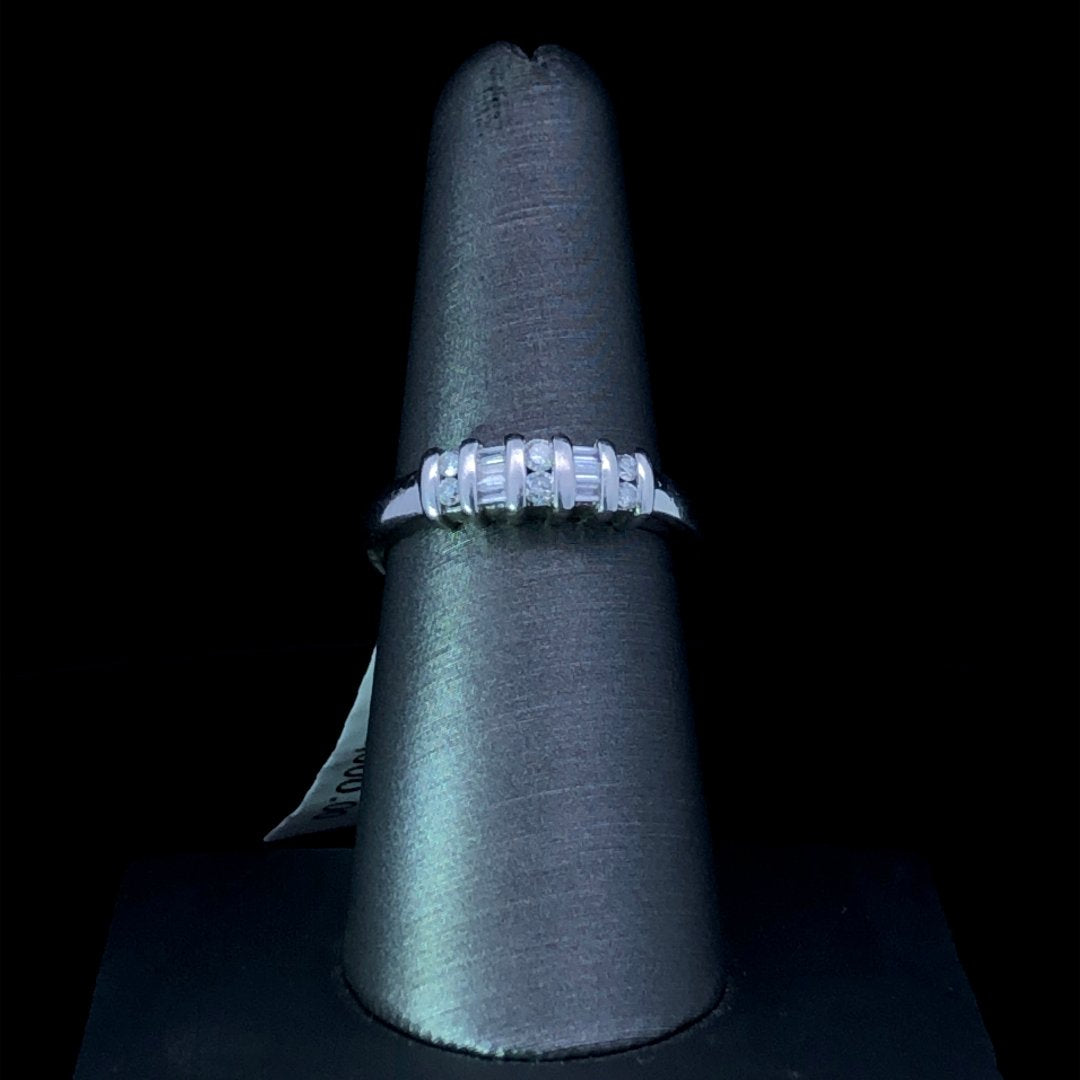 Treasured for generations, this timeless ring features .25ctw of sparkling diamonds set in luxe platinum and framed with bar accents. Exquisite and stylish, it's the perfect way to mark a special occasion. This ring is a size 7. If that size is not a perfect fit, first time sizing is free at the time of purchase. Additional sizing fees may apply.