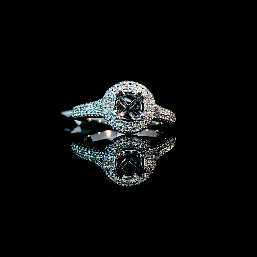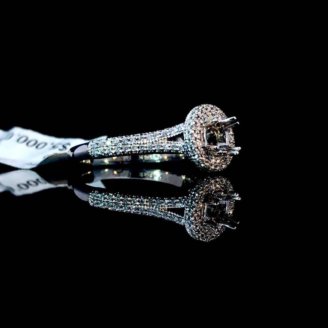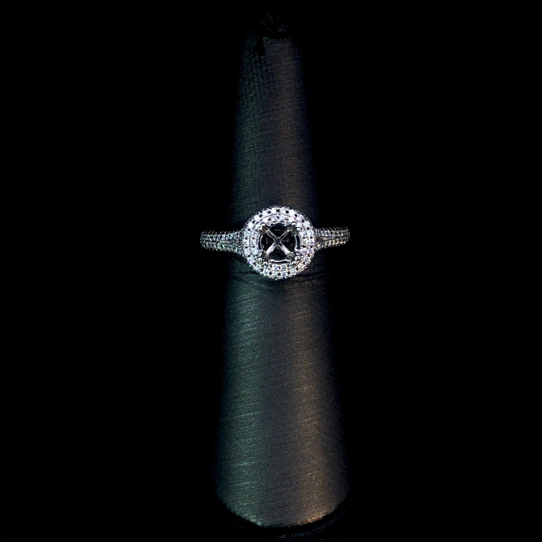 This stunning diamond semi-mount features a round halo, a split shank band adorned with diamonds, and additional diamonds along the sides for sparkle from every angle. Crafted in 14kt white gold, it showcases .55 ctw of round diamonds. Complete this exquisite ring by choosing your ideal center stone from our extensive loose stone collection, creating a personalized and radiant piece. Price is for the semi mount only. Center stone will be added at an additional cost. This ring is a size 6. If that size is not a perfect fit, first time sizing is free at the time of purchase. Additional sizing fees may apply.
