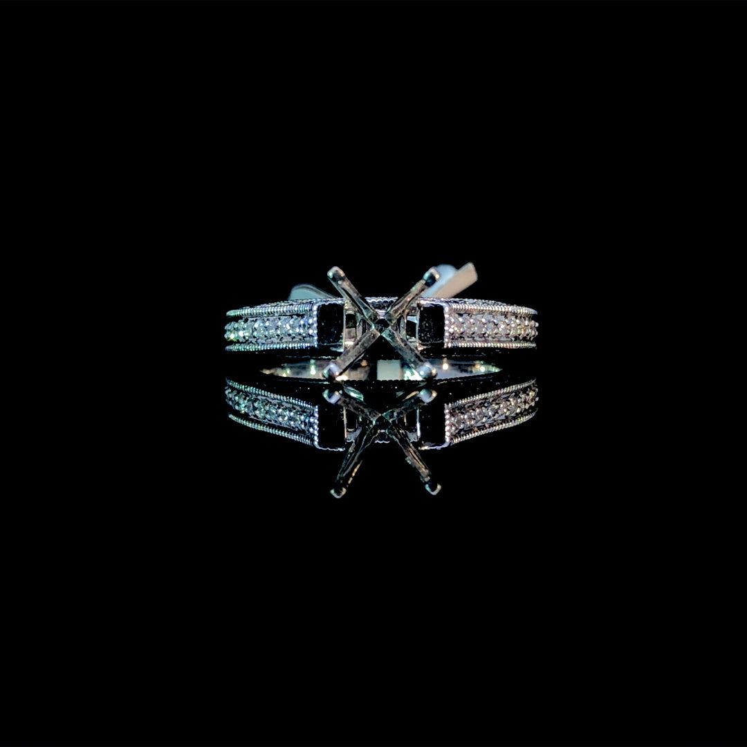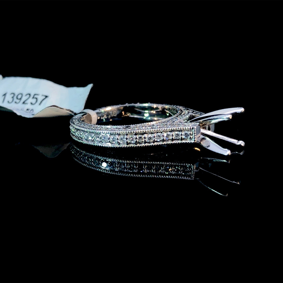 This stunning 14kt white gold semi-mount dazzles with .60ctw of round diamond accents and elegant milgrain detailing, offering sparkle from every angle. Customize this beautiful setting by selecting your perfect center stone from our collection of loose diamonds, allowing you to create a unique and cherished piece that shines with your personal style. Price is for the semi mount only. Center stone will be added at an additional cost. This ring is a size 6. If that size is not a perfect fit, first time sizing is free at the time of purchase. Additional sizing fees may apply.