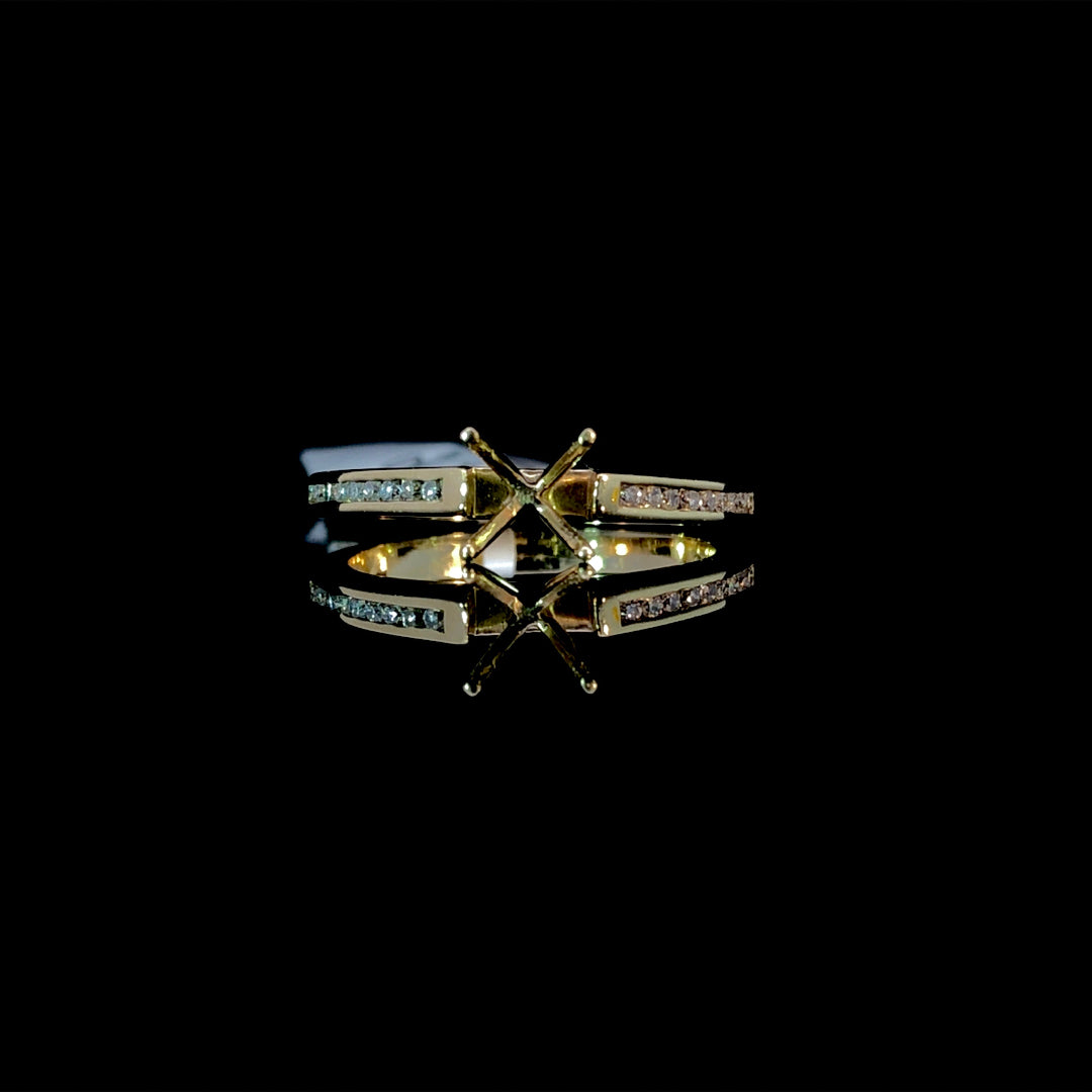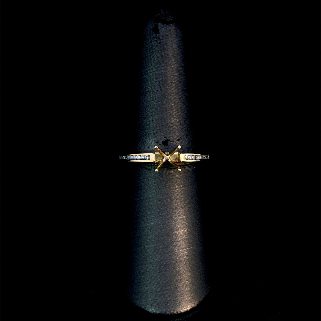 This diamond semi mount exudes timeless sophistication, featuring .15ctw of round diamonds delicately channel set within a 14kt yellow gold band. Designed to complement your unique taste, it allows you to select the perfect center stone from our exclusive collection of loose stones, creating an engagement ring that harmonizes classic elegance with personalized refinement. Price is for the semi mount only. Center stone will be added at an additional cost. This ring is a size 6.75. If that size is not a perfect fit, first time sizing is free at the time of purchase. Additional sizing fees may apply.