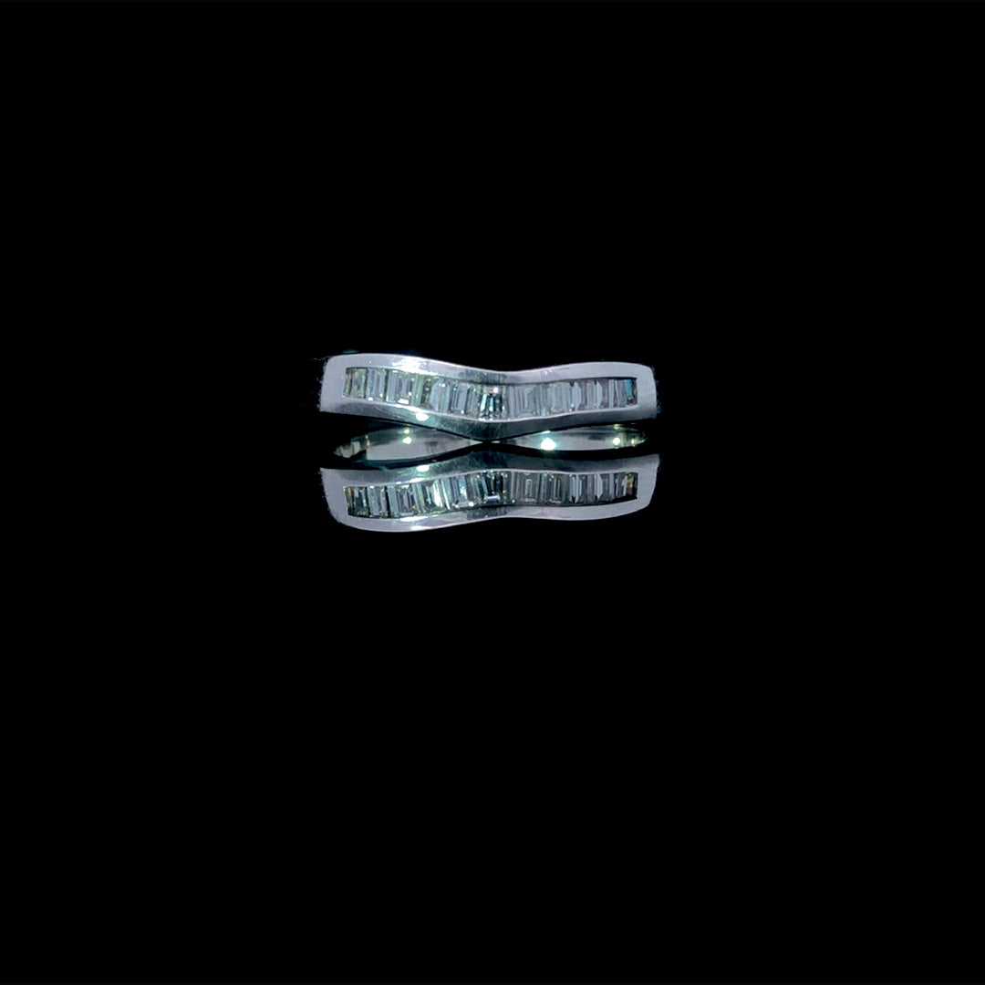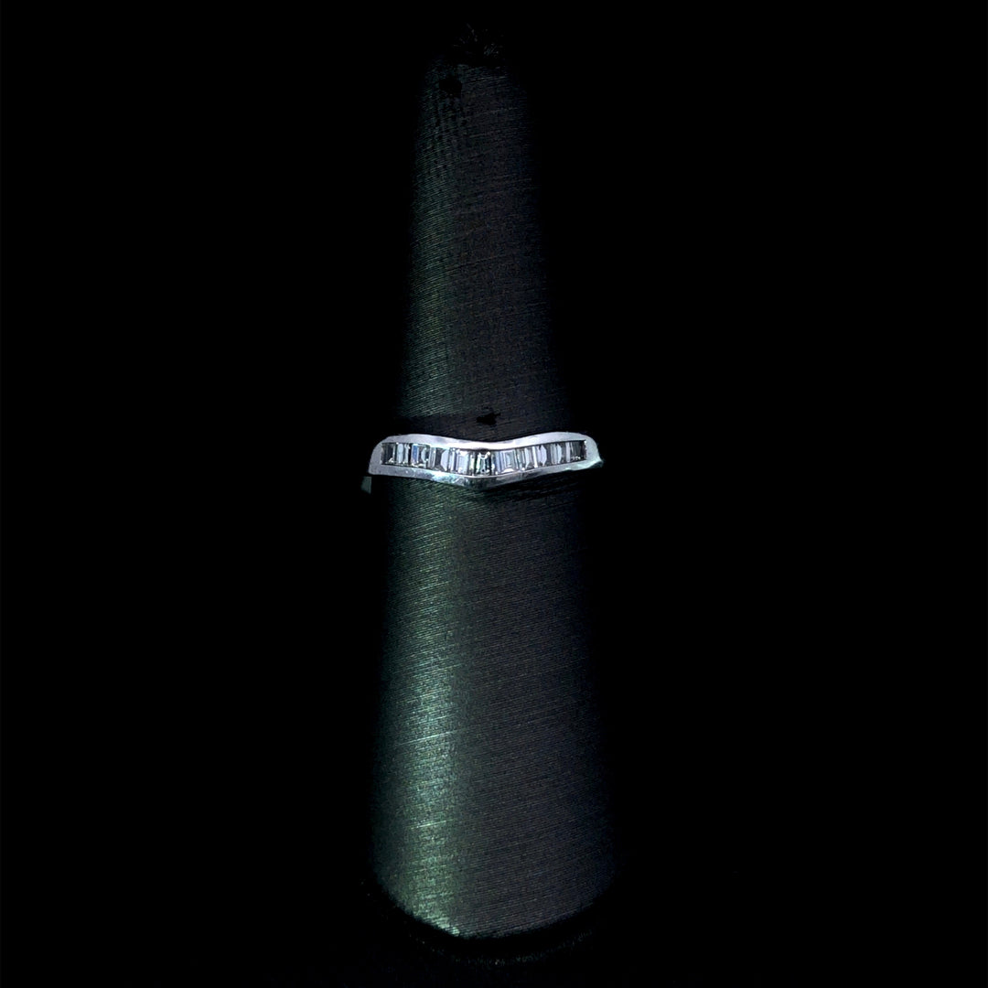 This elegant curved diamond band showcases .37ctw of baguette diamonds in a channel setting. Crafted in 14kt white gold, it adds a touch of sparkle to any ensemble. Perfect for special occasions or everyday wear, this band is a timeless addition to your jewelry collection. This ring is a size 7. If that size is not a perfect fit, first time sizing is free at the time of purchase. Additional sizing fees may apply.