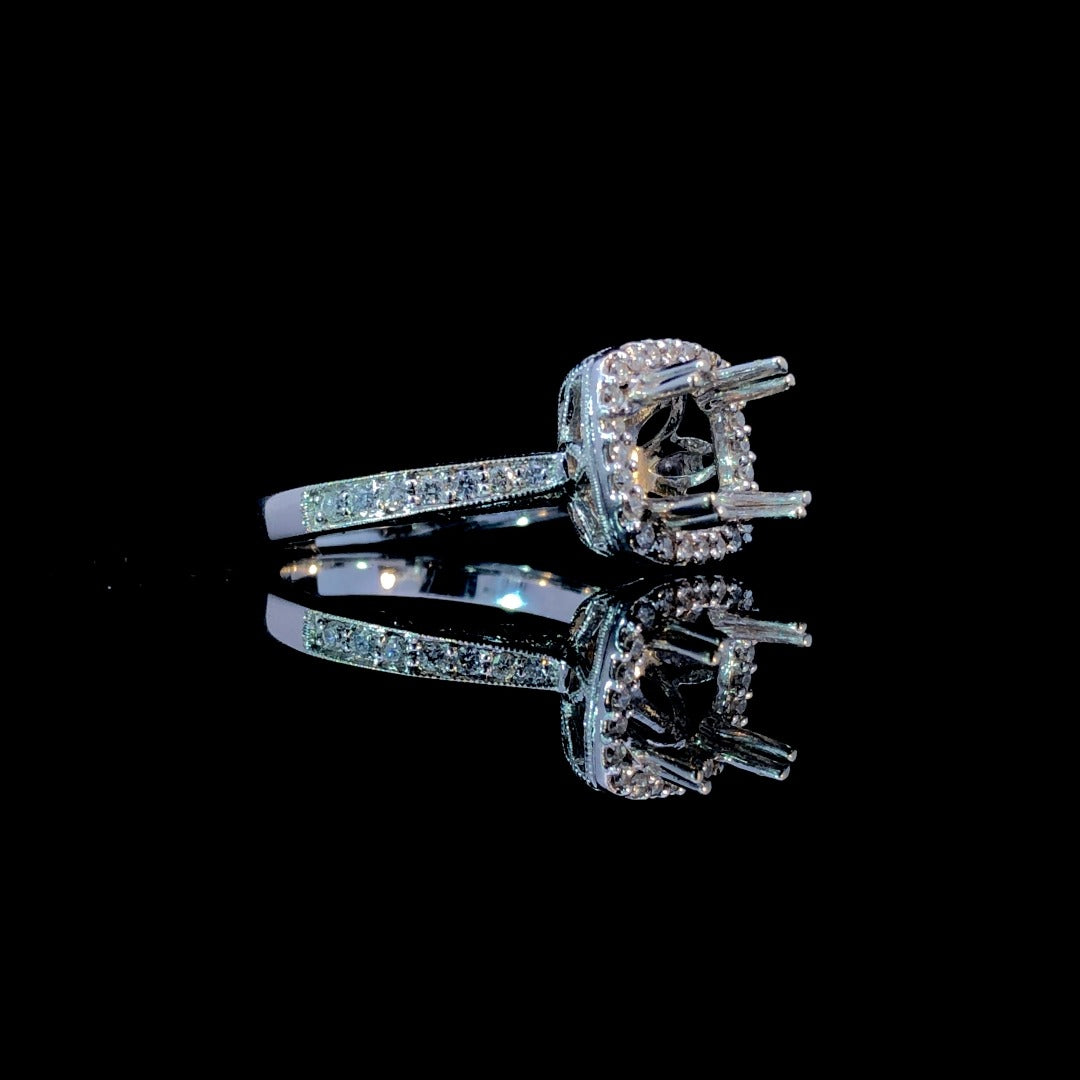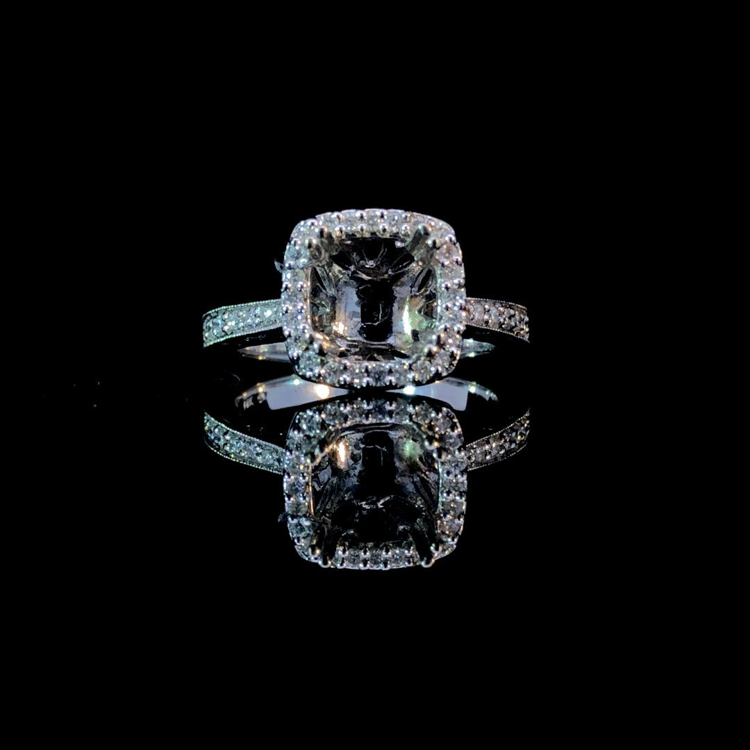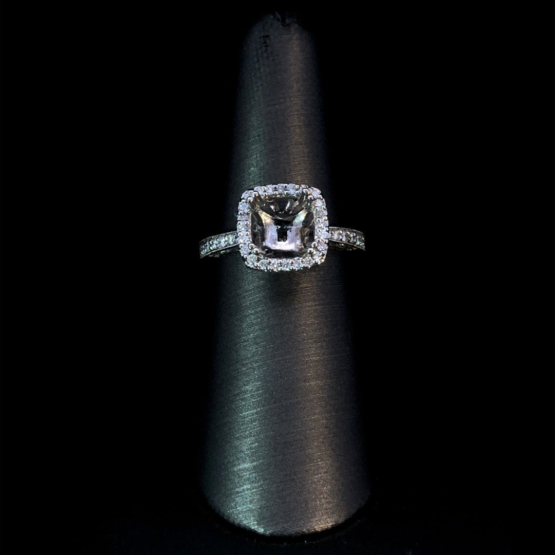 Say "yes" with this gorgeous semi mount. The halo and band, adorned with .37ctw round diamonds, surround a center stone of your choice from our exquisite selection. Handcrafted in 14kt white gold, this timeless piece exudes sophistication and grace. Create your perfect ring today. Price is for the semi mount only. Center stone will be added at an additional cost. This ring is a size 6.75. If that size is not a perfect fit, first time sizing is free at the time of purchase. Additional sizing fees may apply.