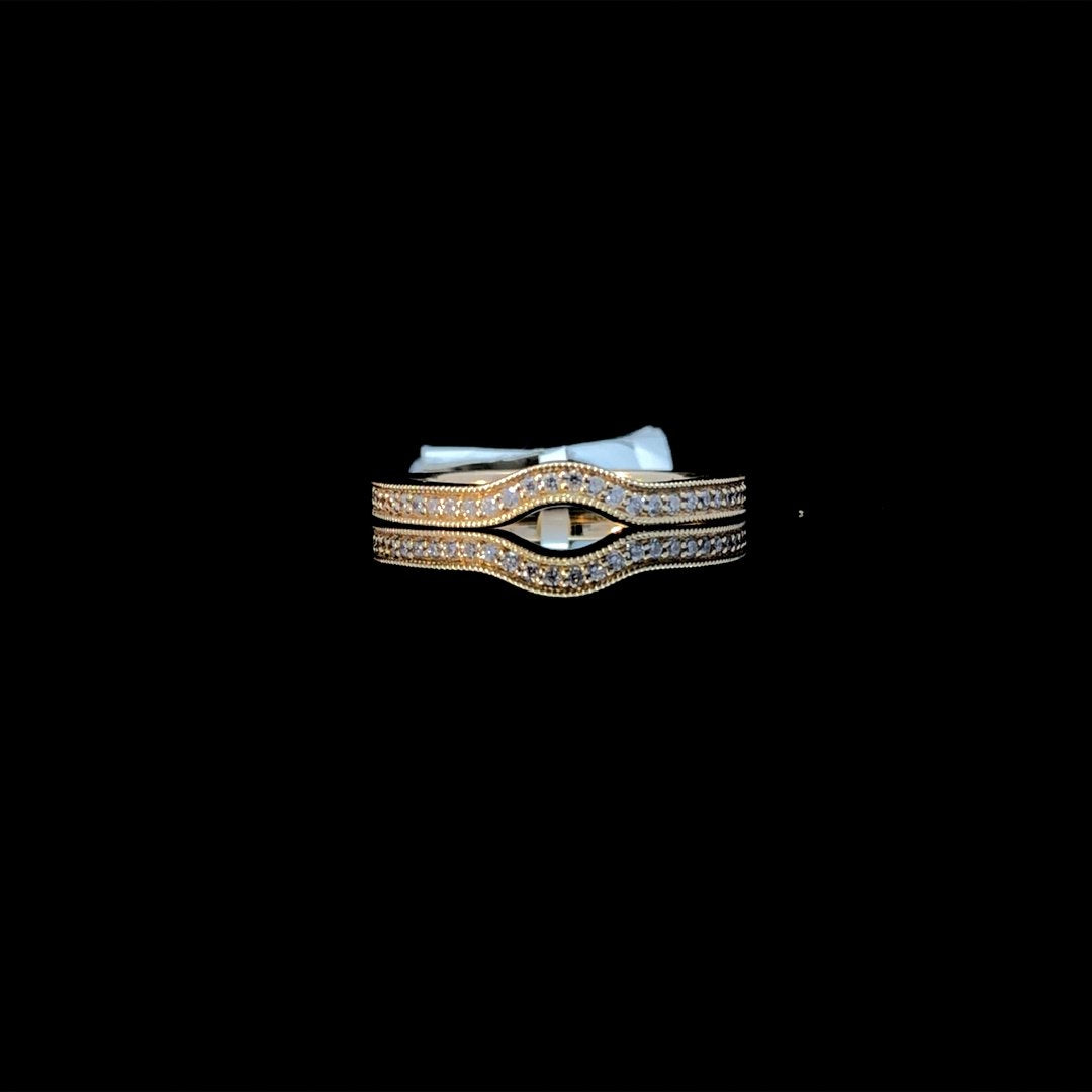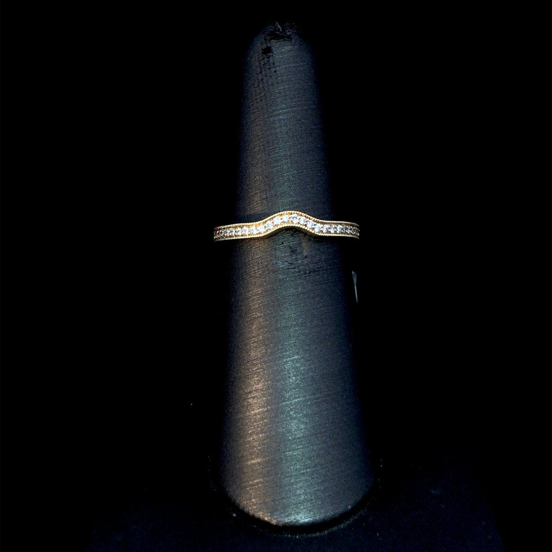 Add a touch of sparkle to your jewelry collection with this diamond contour band. Crafted in 14kt yellow gold, it features .14ctw of round diamonds and delicate milgrain detailing. A perfect combination of elegance and sophistication. This ring is a size 6. If that size is not a perfect fit, first time sizing is free at the time of purchase. Additional sizing fees may apply.