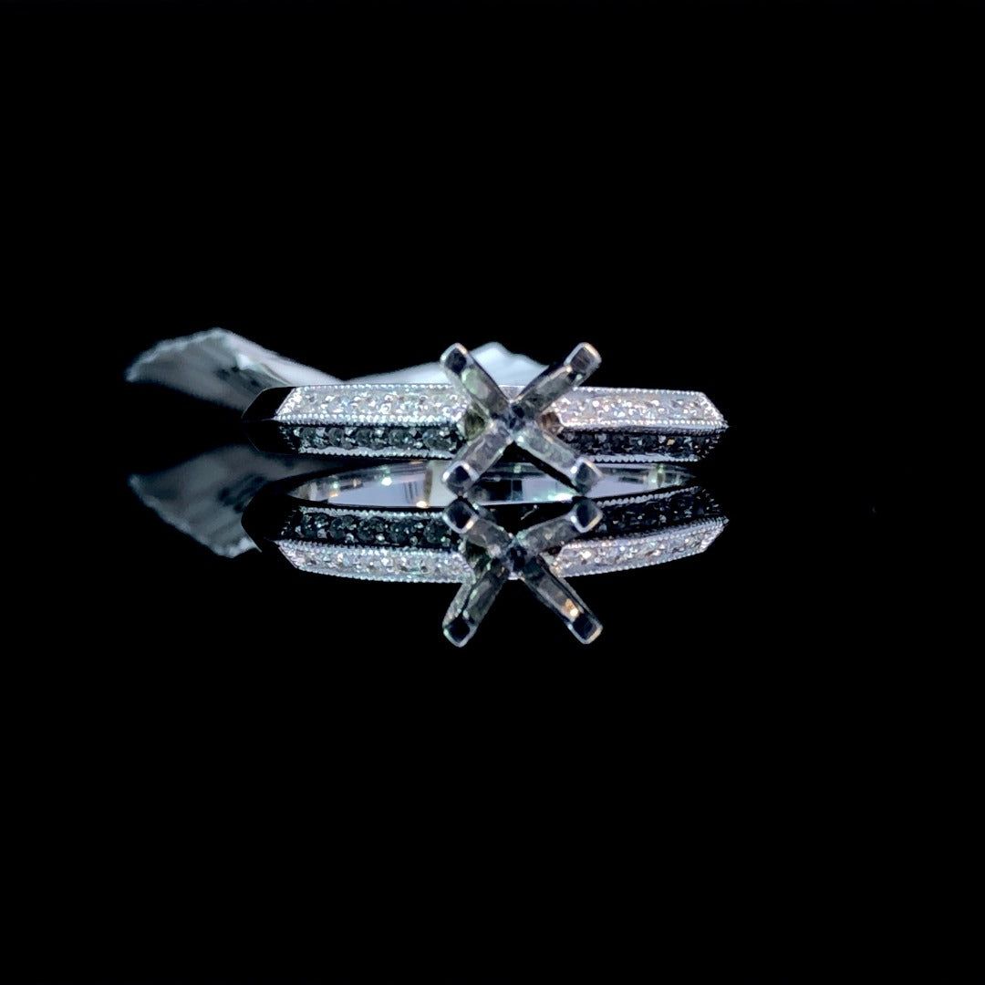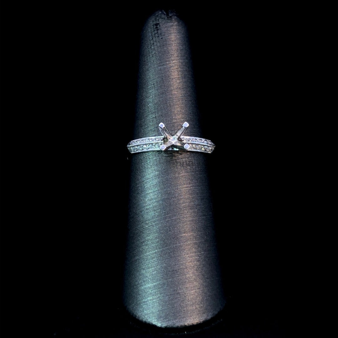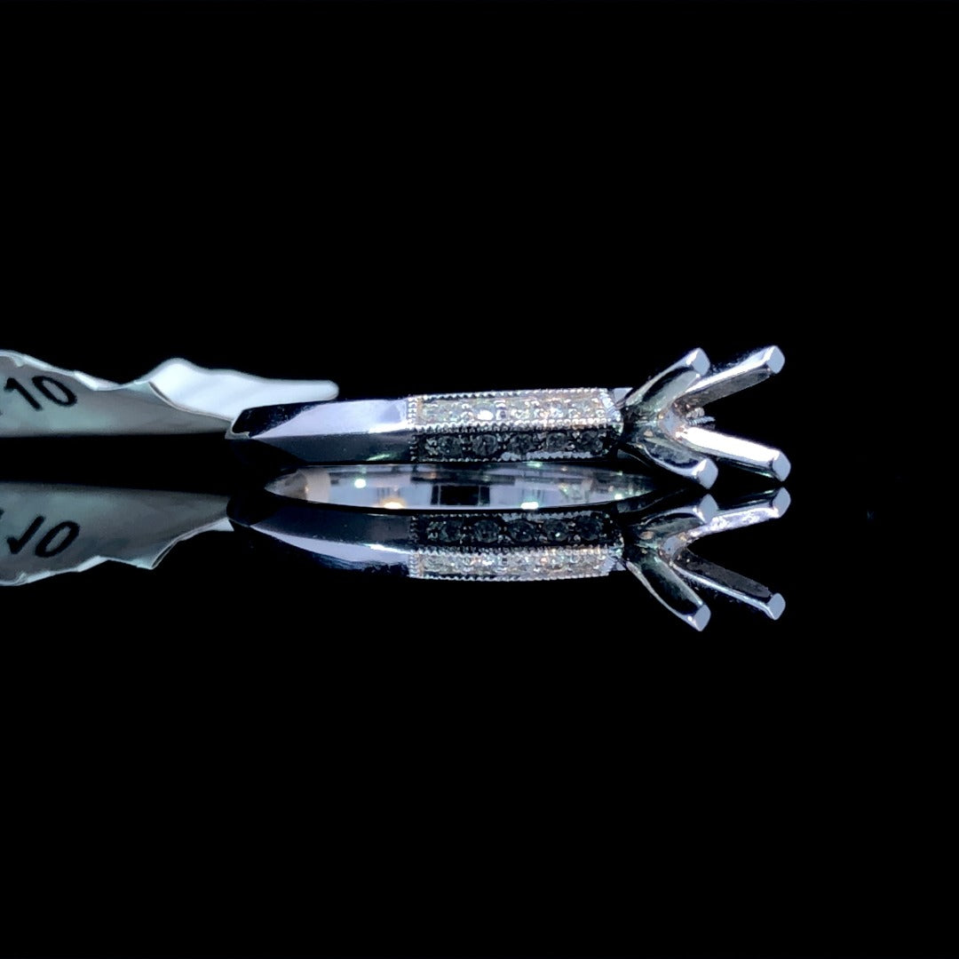 Adorn your finger with elegance and sophistication with our diamond semi-mount. The 14kt white gold knife edge band boasts .12ctw of sparkling round diamonds and delicate milgrain details. Complete this stunning piece by selecting your own center stone from our wide variety of loose stones. Price is for the semi mount only. Center stone will be added at an additional cost. This ring is a size 6.5. If that size is not a perfect fit, first time sizing is free at the time of purchase. Additional sizing fees may apply.