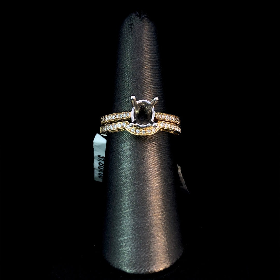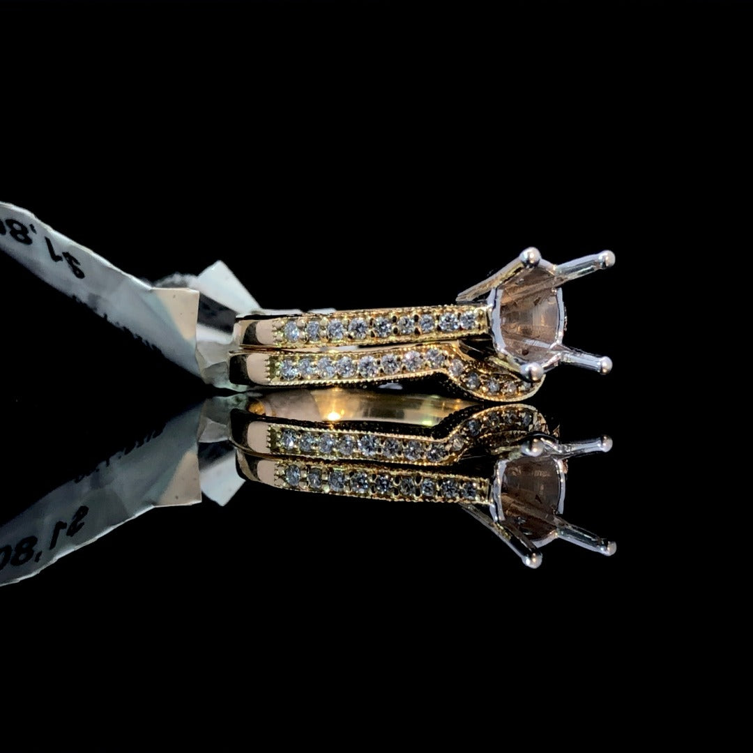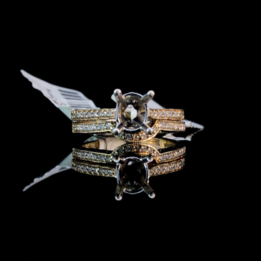 Elevate your elegance with our beautiful diamond semi mount. Crafted with a stunning 14kt 2-tone gold design, it boasts .14ctw of round diamonds, intricate filigree, and delicate milgrain details. Choose from our selection of loose stones to complete this luxurious piece. Complete the look with the matching .17ctw diamond contour band (sold separately). Price is for the semi mount only. Center stone and band will be added at an additional cost. This ring is a size 7. If that size is not a perfect fit, first time sizing is free at the time of purchase. Additional sizing fees may apply.