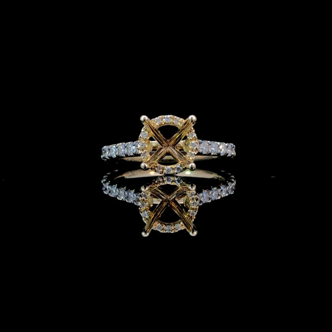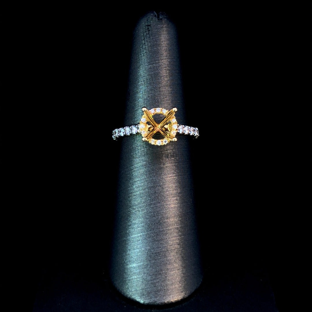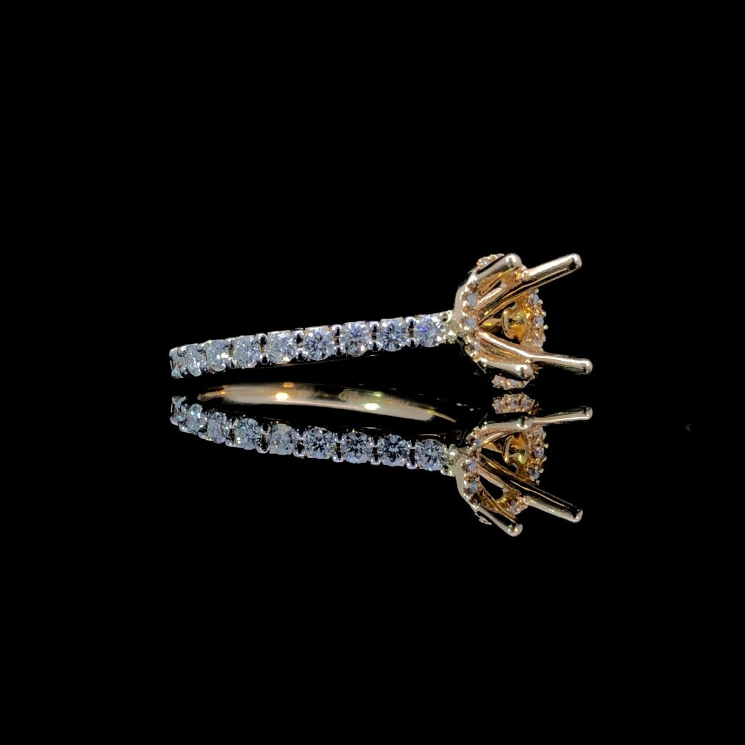 Indulge in luxury with our stunning semi mount. The classic round halo design is adorned with .59ctw of round diamonds, adding a touch of sparkle. Crafted in 14kt yellow gold, this timeless piece is a perfect choice for showcasing your chosen round center stone from our exclusive collection. Elevate your style and make a statement with this exquisite piece. Price is for the semi mount only. Center stone will be added at an additional cost. This ring is a size 6. If that size is not a perfect fit, first time sizing is free at the time of purchase. Additional sizing fees may apply.