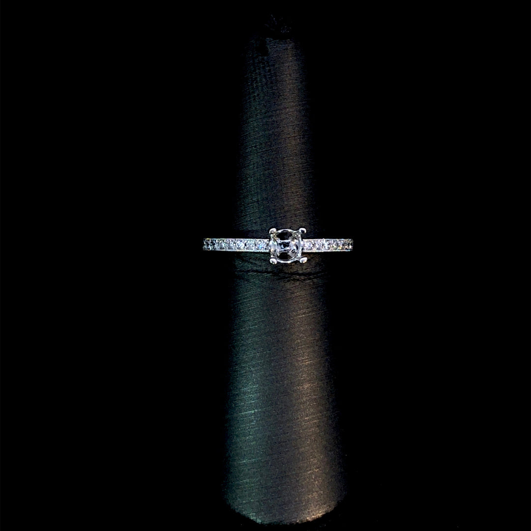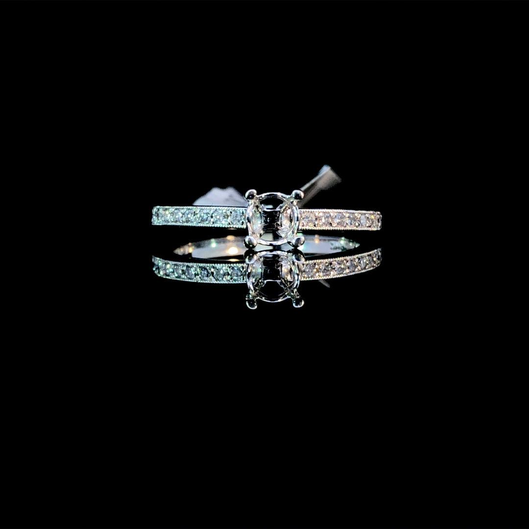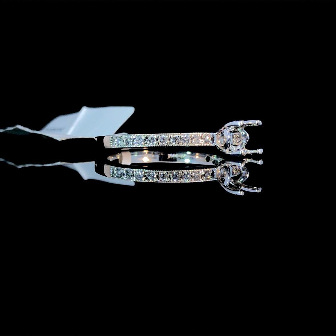 This elegant 14kt white gold semi mount is adorned with .17ctw of round diamonds that gracefully cascade along the band, enhanced by delicate milgrain details. Designed to let you personalize, it allows you to select a center stone from our extensive collection of loose diamonds, creating a unique and meaningful piece that matches your style perfectly. Price is for the semi mount only. Center stone will be added at an additional cost. This ring is a size 6.5. If that size is not a perfect fit, it can be sized up 2 sizes for free at the time of purchase. Additional sizing fees may apply.