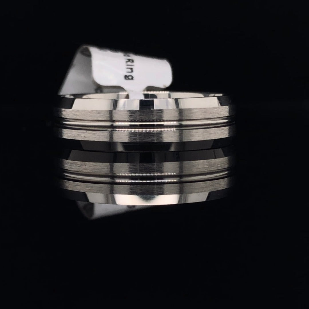 6mm beveled edge concave satin finish 10 kt white gold. This ring is a finger size 10 .If that size is not a perfect fit contact us to price your size. Additional sizing fees may apply.
