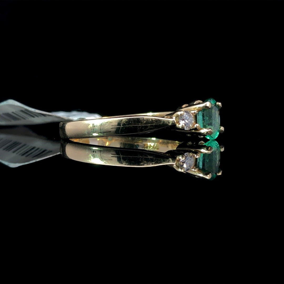 Add a touch of elegance to any outfit with this beautiful ring! Featuring a stunning 6x4 oval shaped Emerald at its center and 2 round diamond side stones totaling .14ctw, this classic ring is the perfect combination of timeless design and luxurious materials. Crafted in 14kt yellow gold, it's a must-have for any jewelry collection. This ring is a size 7. If that size is not a perfect fit, first time sizing is free at the time of purchase. Additional sizing fees may apply.