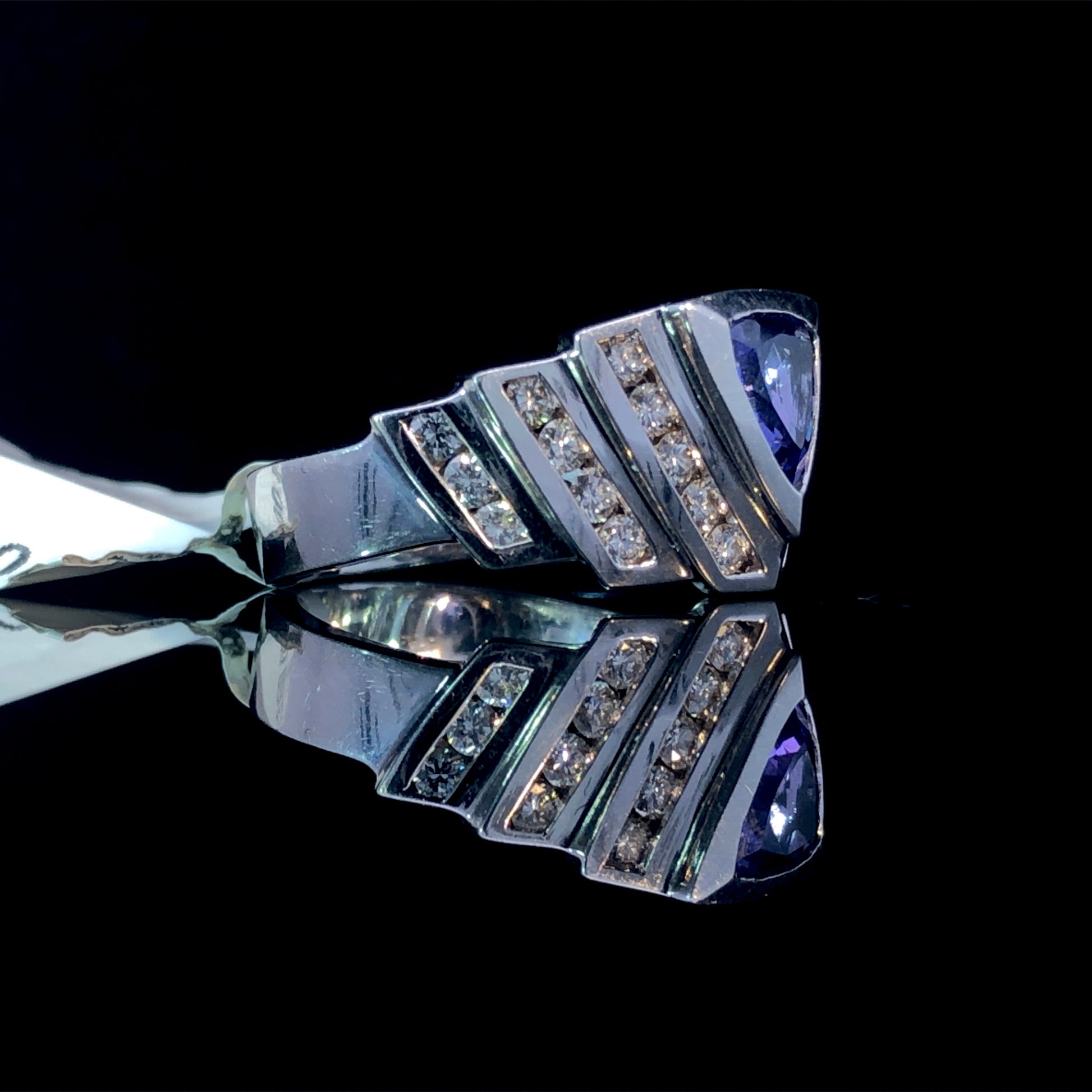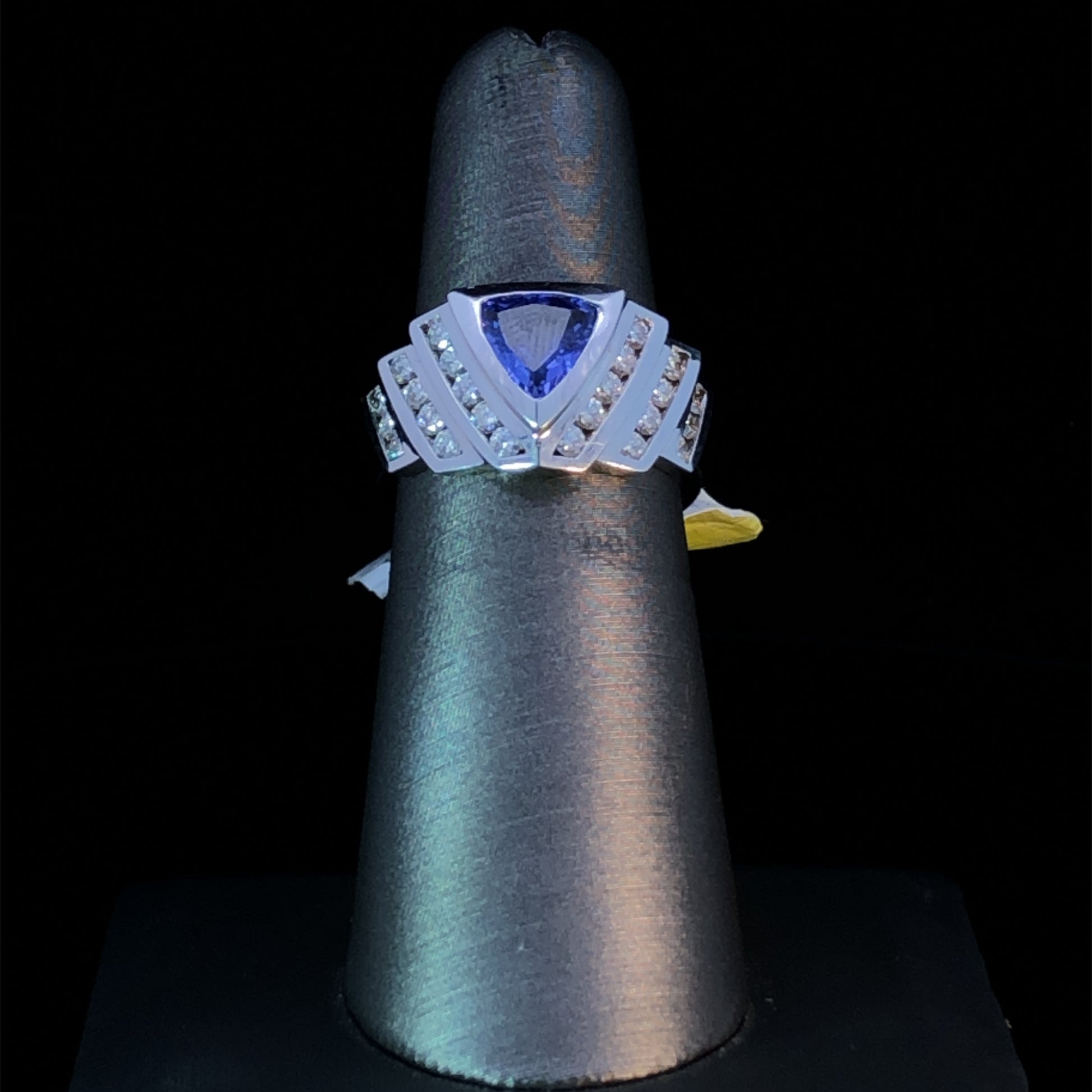 This 1.90 ctw Tanzanite and diamond ring is an absolute showstopper. A semi-mount of 1.20 ctw round channel-set diamonds in 14 kt white gold supports a beautiful .70ct trillion cut Tanzanite, creating a captivating contrast and a mesmerizing sparkle. Unleash your inner radiance with this remarkable ring! This ring is a size 6. If that size is not a perfect fit, first time sizing is free at the time of purchase. Additional sizing fees may apply.
