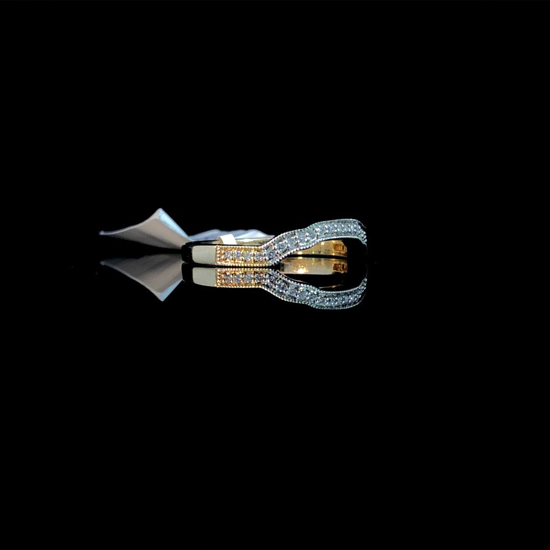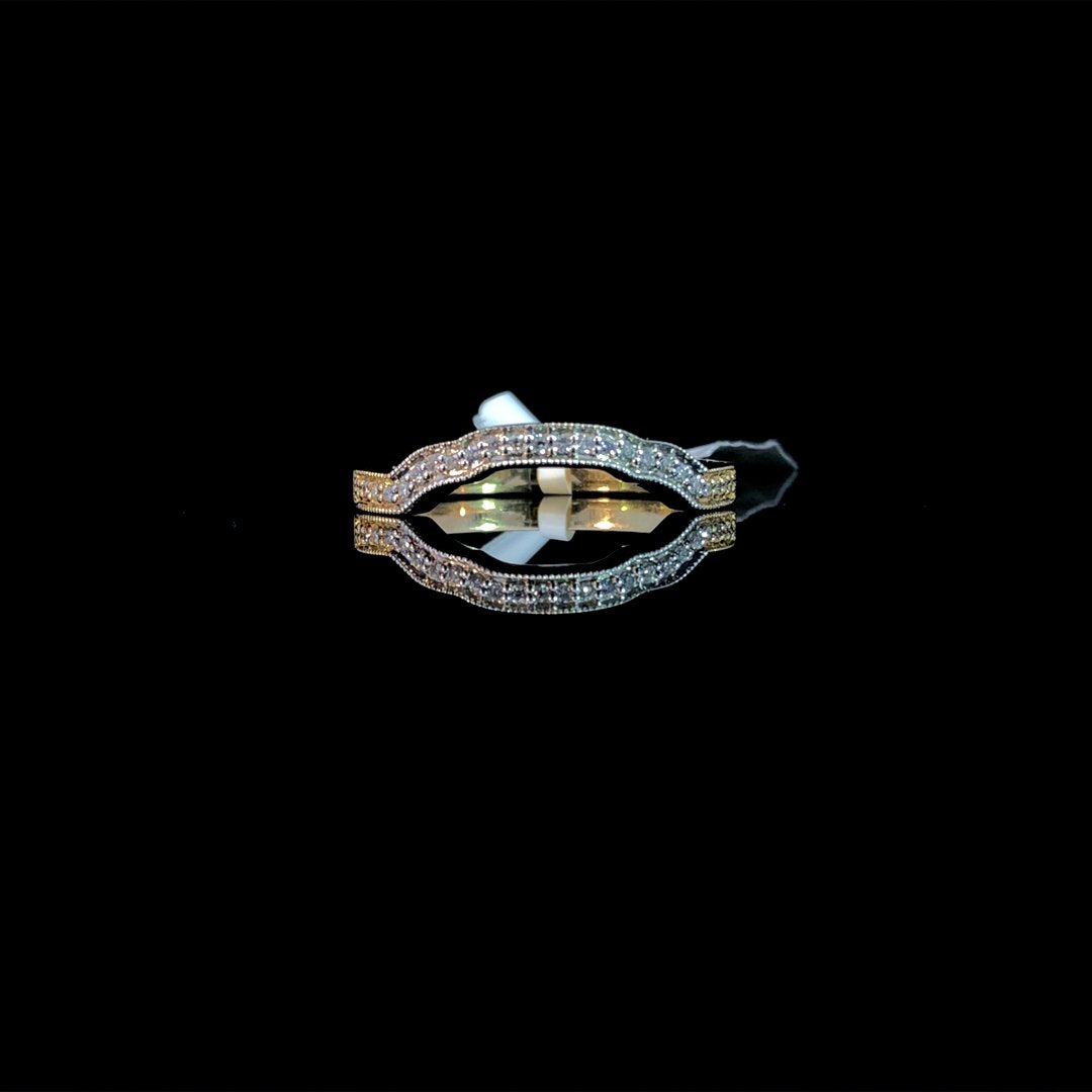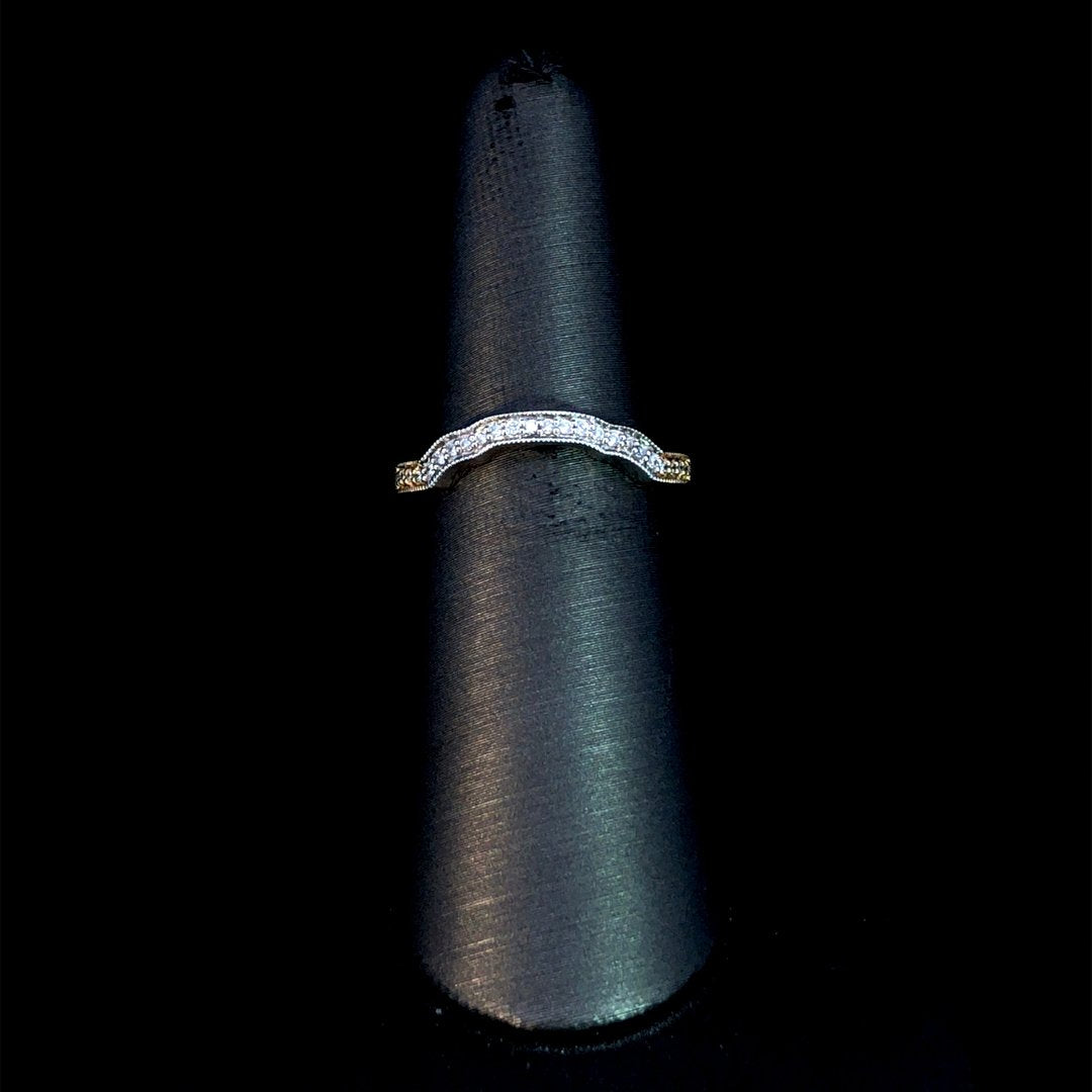 Enhance the look of your engagement ring with this diamond contour band. Featuring .10ctw of round diamonds and a 14kt 2-tone gold design, this band is specifically designed to fit perfectly against certain contours for a flush look. Elevate your ring and add a touch of sparkle with our expertly crafted band. This ring is a size 6. If that size is not a perfect fit, first time sizing is free at the time of purchase. Additional sizing fees may apply.