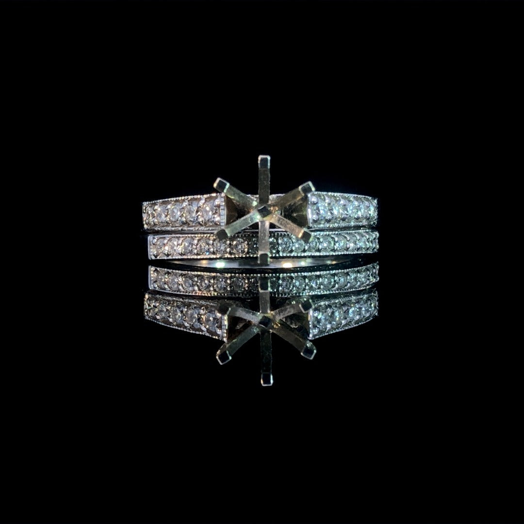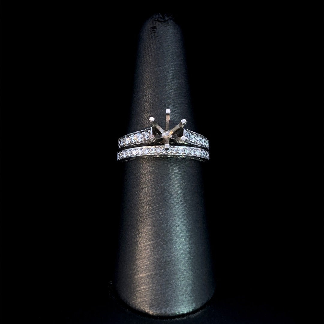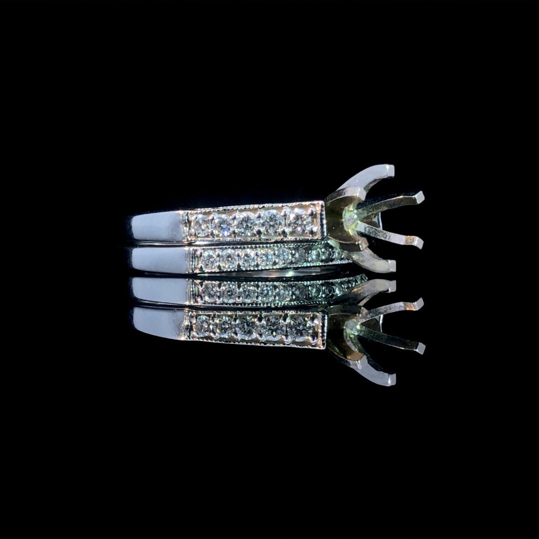 This stunning diamond semi mount showcases a timeless design with .26ctw of round diamonds and intricate milgrain details on a 14kt white gold band. Select your preferred loose stone from our unmatched collection to set at the center. Complete the look with the matching .15ctw diamond band (sold separately) for a classic bridal set. Price is for the semi mount only. Center stone and band will be added at an additional cost. This ring is a size 7. If that size is not a perfect fit, first time sizing is free at the time of purchsase. Additional sizing fees may apply.
