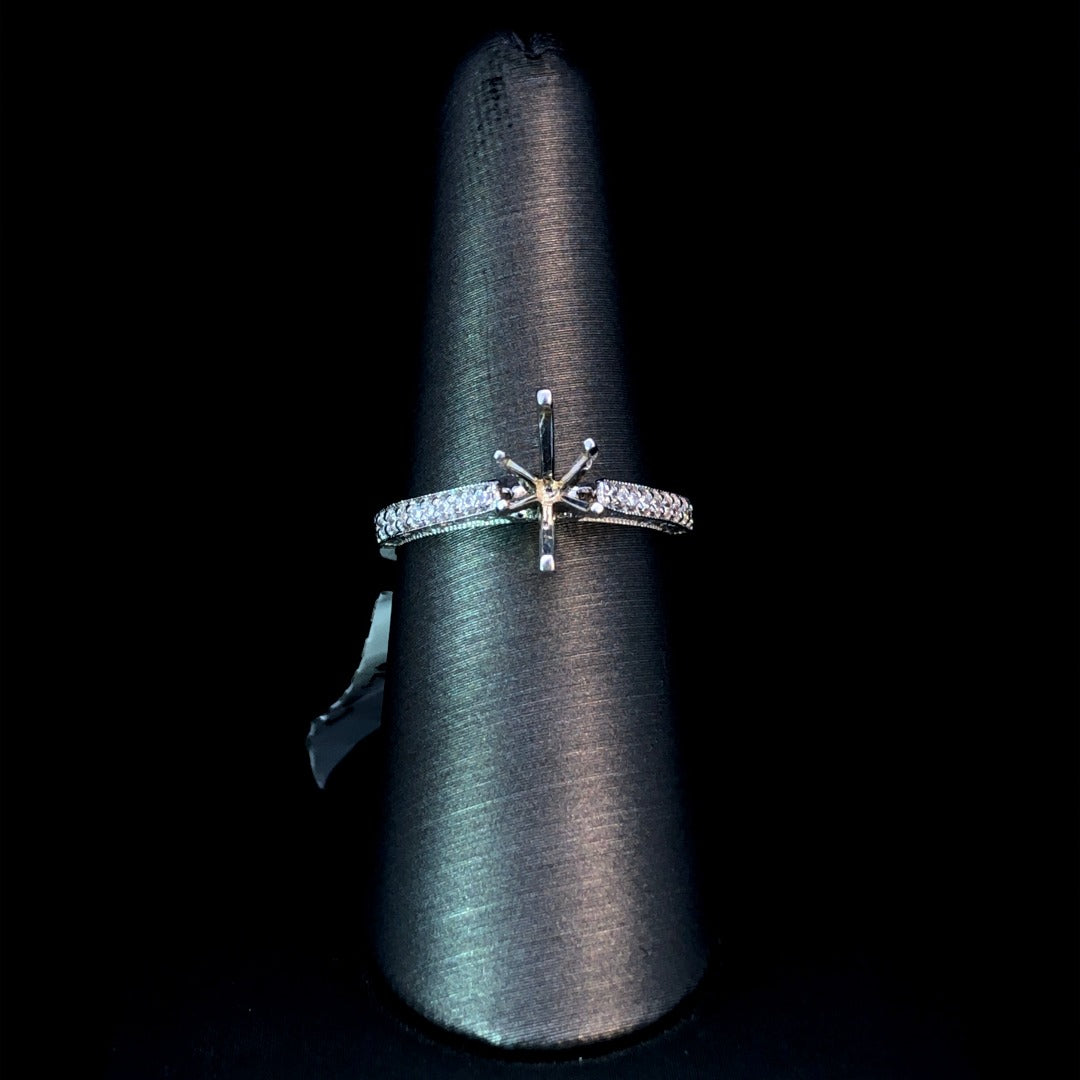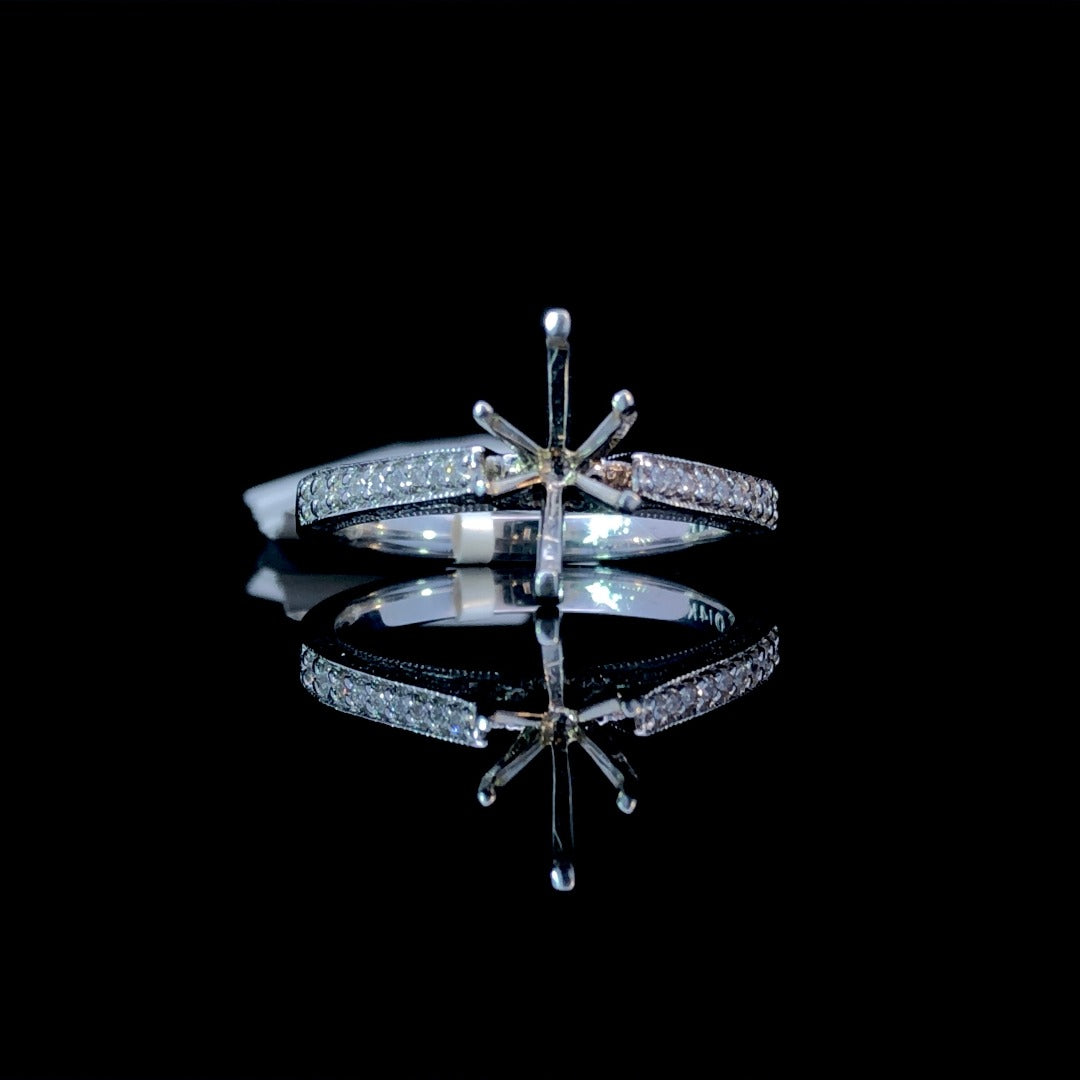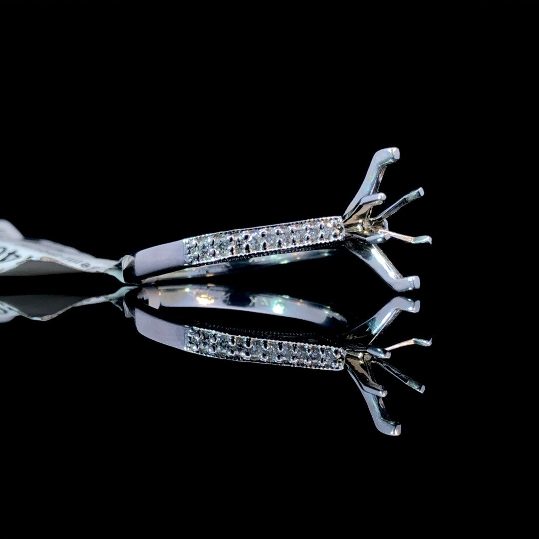 Adorn yourself with our exquisite 14kt white gold diamond semi mount, adorned with .14ctw of sparkling round diamonds. The classic design is elevated with intricate milgrain detailing and delicate filigree on the sides. Choose from our unmatched selection of loose stones to complete this luxurious piece. Shine in sophistication for years to come. Price is for the semi mount only. Center stone will be added at an additional cost. This ring is a size 7. If that size is not a perfect fit, first time sizing is free at the time of purchase. Additional sizing fees may apply.