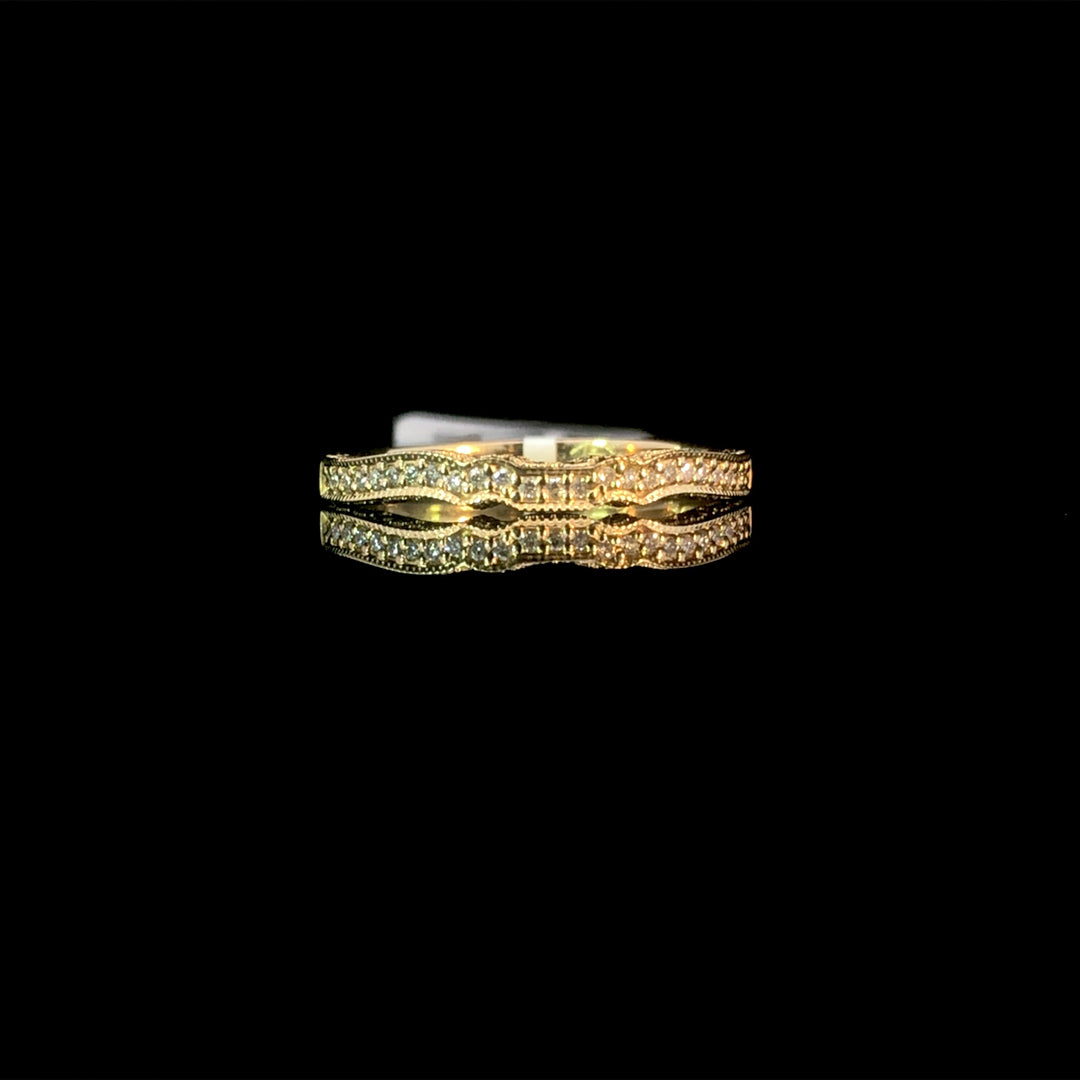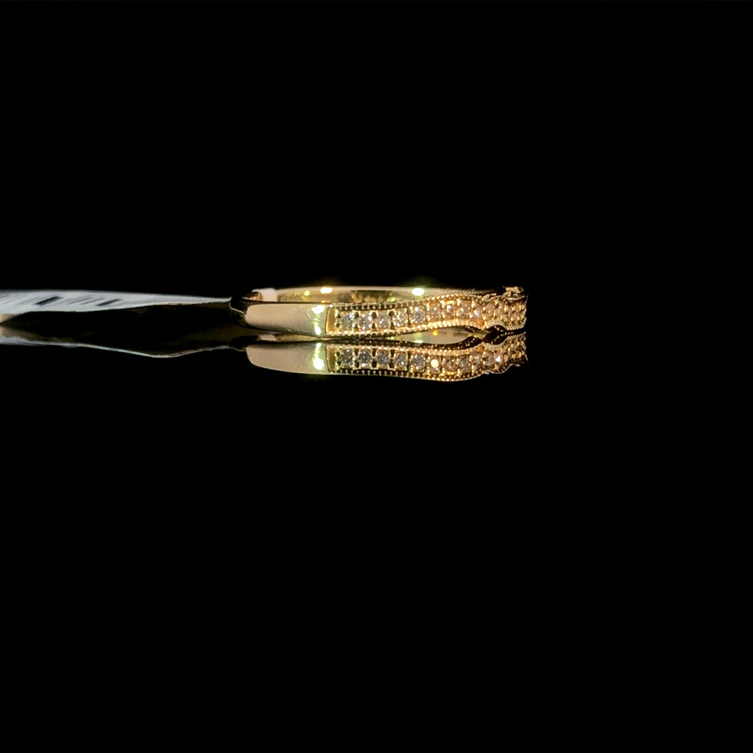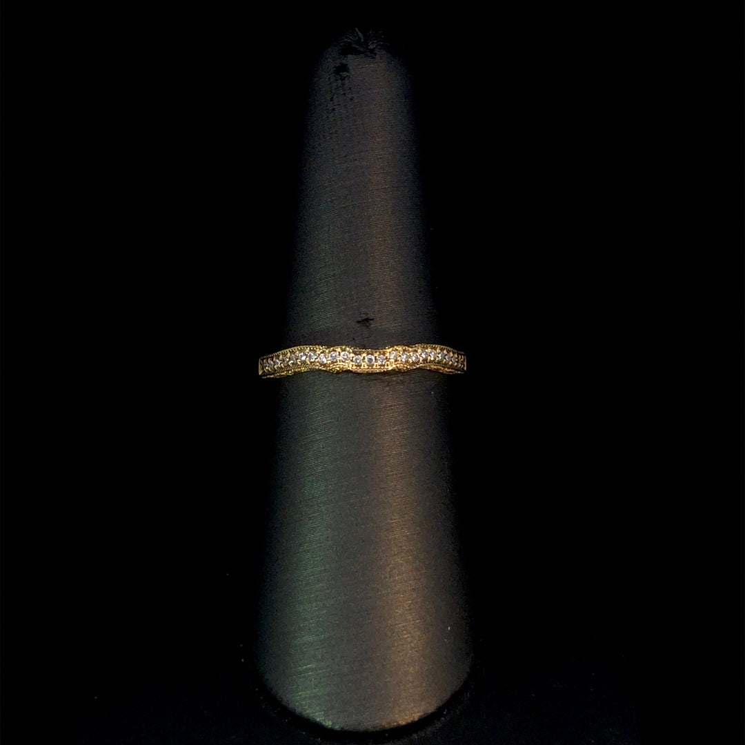 This stunning diamond contour band boasts .13ctw of brilliant round diamonds and intricate details in 14kt yellow gold. Enhance the beauty of your existing jewelry collection with this elegant addition that will surely catch the eye. This ring is a size 7. If that size is not a perfect fit, first time sizing is free at the time of purchase. Additional sizing fees may apply.