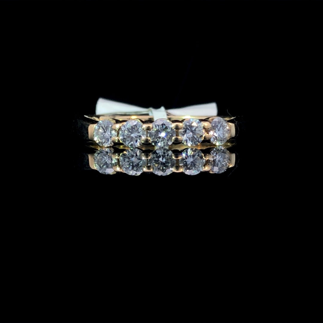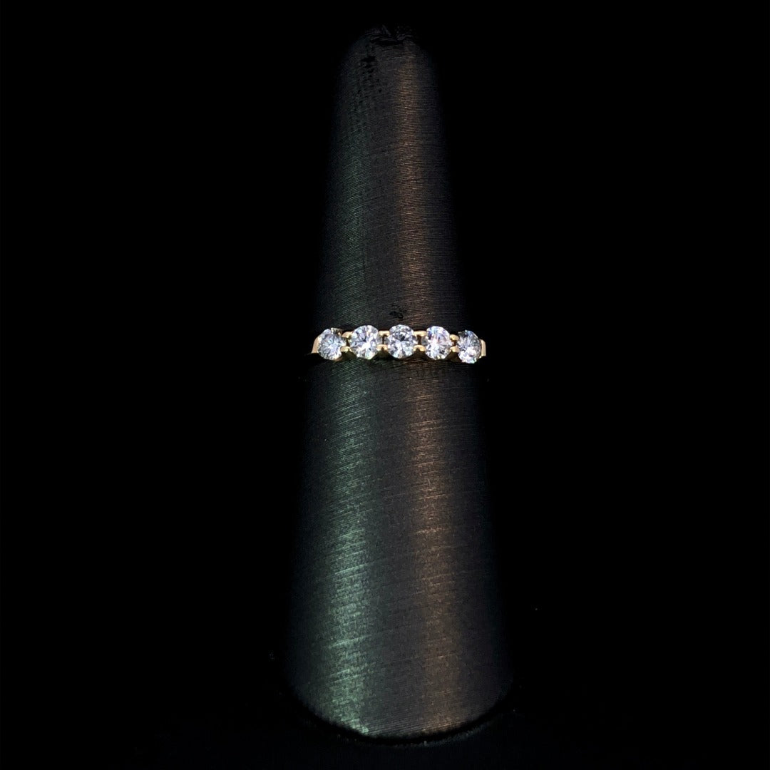 Introducing our stunning diamond band, crafted with 14kt yellow gold and 5 exquisite round cut diamonds totaling .50ctw. This timeless piece exudes luxury and elegance, making it the perfect addition to any fine jewelry collection. Elevate your style with this classic and sophisticated diamond band. This ring is a size 7. If that size is not a perfect fit, first time sizing is free at the time of purchase. Additional sizing fees may apply.