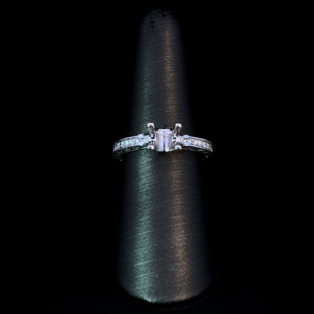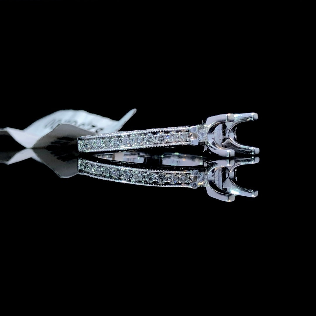 Elevate your style with our stunning diamond semi mount. Featuring .44ctw of round diamonds and intricate milgrain detailing, this piece exudes opulence. With diamonds cascading down the band and a scalloped design on the sides, this ring is sure to make a statement. Choose your perfect center stone from our exquisite selection. Price is for the semi mount only. Center stone will be added at an additional cost. This ring is a size 7. If that size is not a perfect fit, first time sizing is free at the time of purchase. Additional sizing fees may apply.