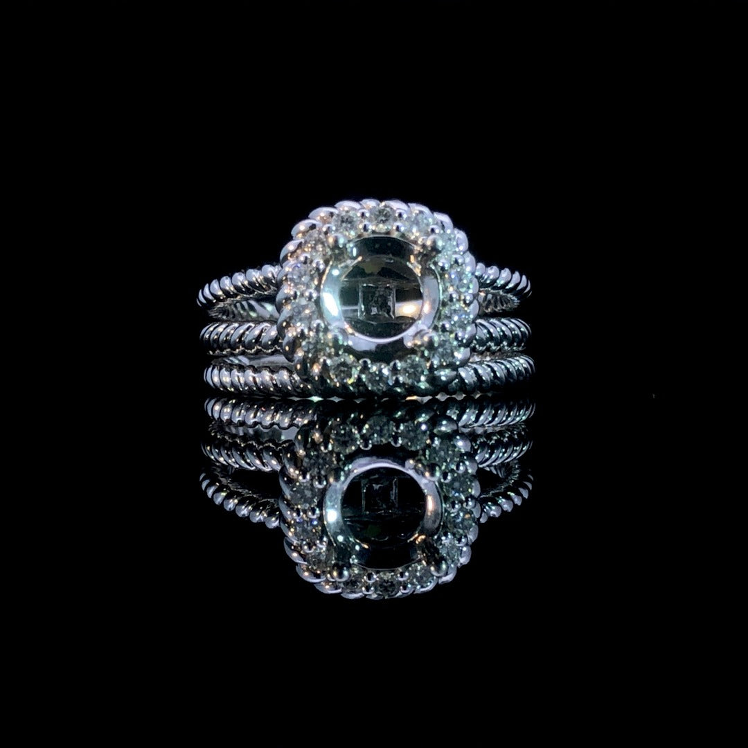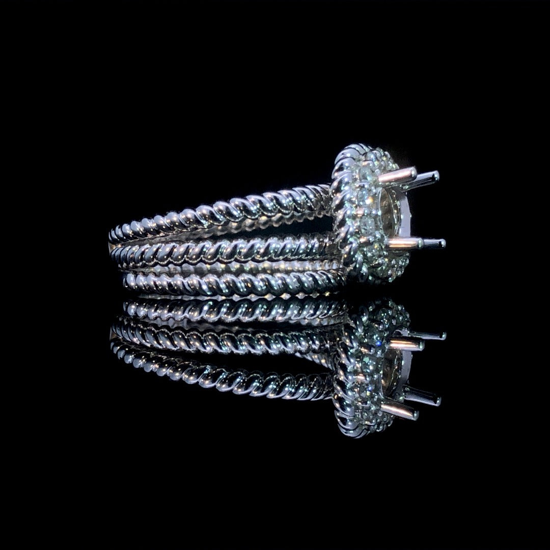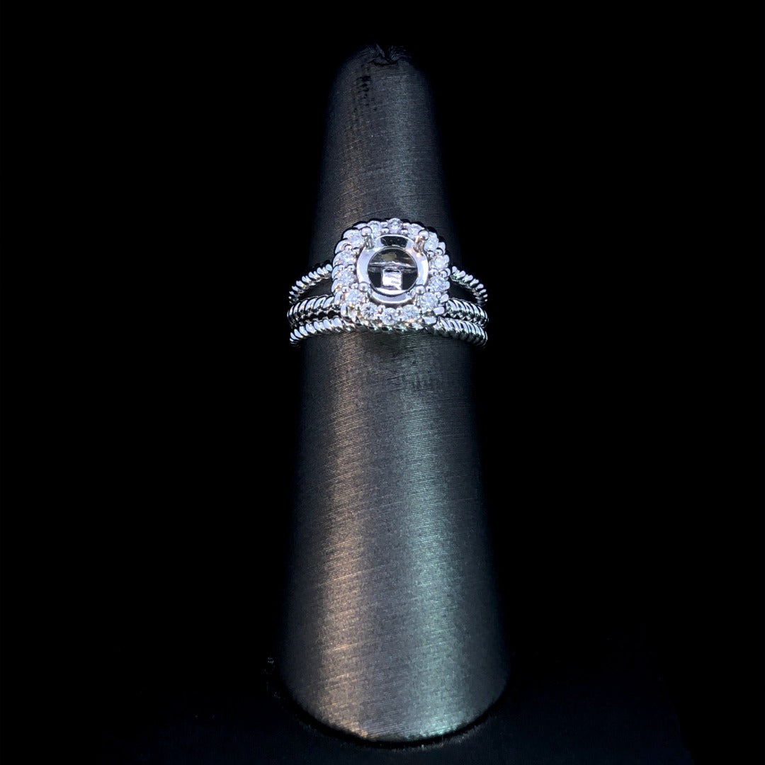 Create a stunning look with our unique diamond semi mount. Featuring an eye-catching cushion shaped diamond halo and a split shank with a delicate rope design, this 14kt white gold piece will accentuate your chosen center from our collection. Complete the set with our matching rope style band (sold separately). Add a touch of elegance and sparkle to your jewelry collection now! Price is for the semi mount only. Center stone and band will be added at an additional cost. This ring is a size 6. If that size is not a perfect fit, first time sizing is free at the time of purchase. Additional sizing fees may apply.