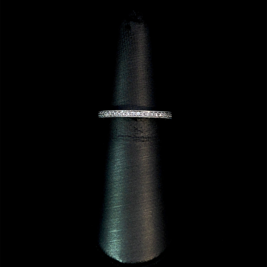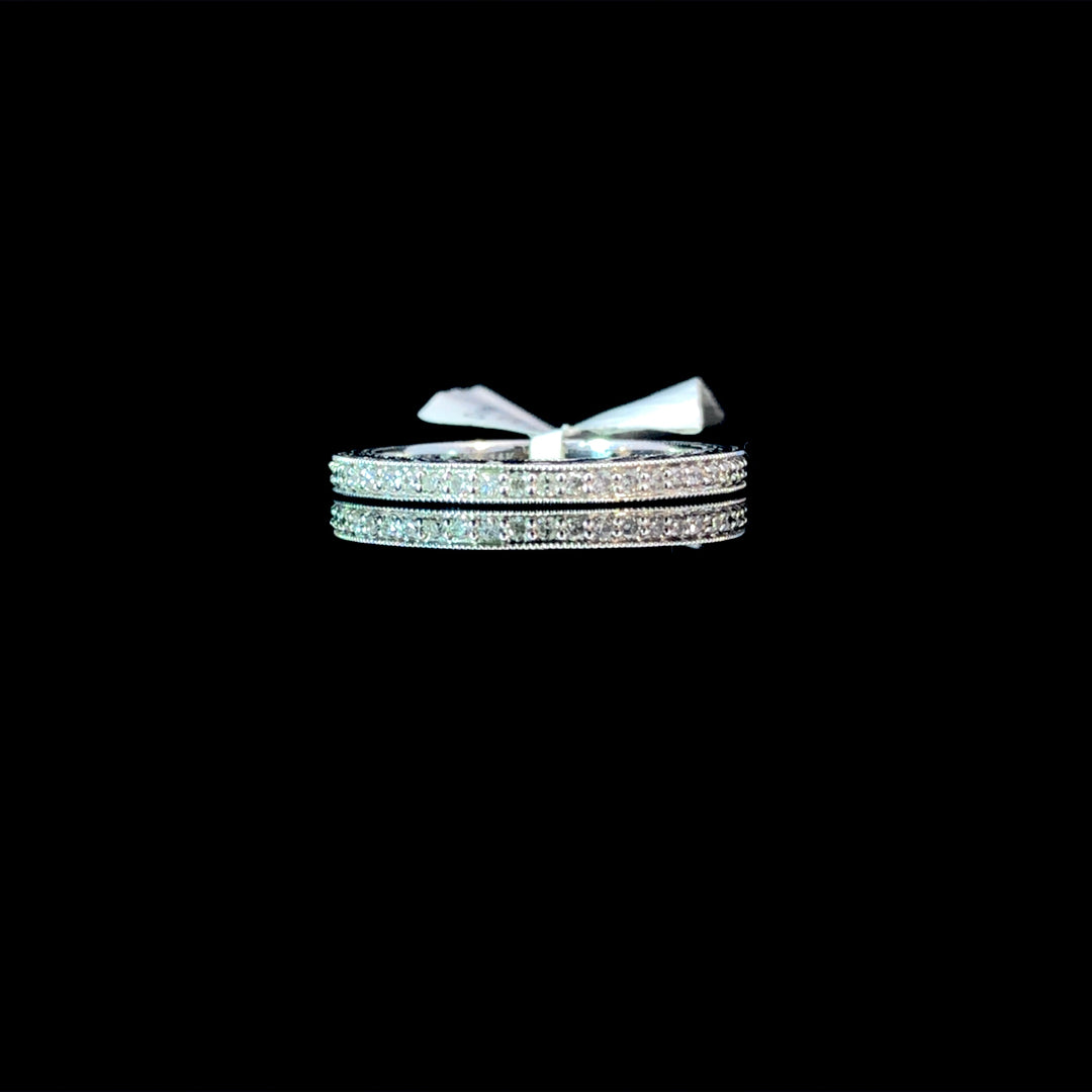 Crafted in 14kt white gold, this band boasts intricate engravings and delicate milgrain details. Adorned with sparkling .25ctw round diamonds, this band will add a touch of elegance to any ensemble. Shop now and shine bright. This ring is a size 6. If that size is not a perfect fit, first time sizing is free at the time of purchase. Additional sizing fees may apply.
