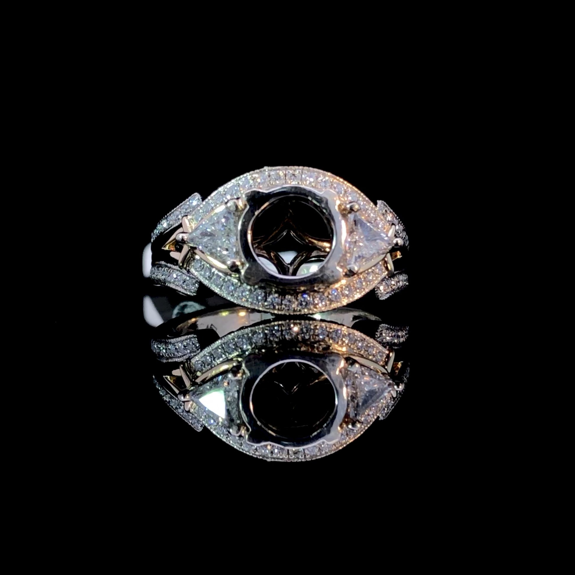 Indulge in luxury with our elegant 14kt 2-tone gold semi mount, featuring 2 trillion shape diamond side stones and round diamond accents. Choose from our selection of gorgeous round center stones to create a stunning statement piece. The perfect foundation for your unique and extravagant jewelry collection. Price is for the semi mount only. Center stone will be added at an additional cost. This ring is a size 7. If that size is not a perfect fit, first time sizing is free at the time of purchase. Additional sizing fees may apply.