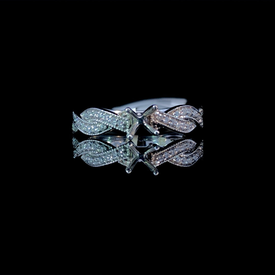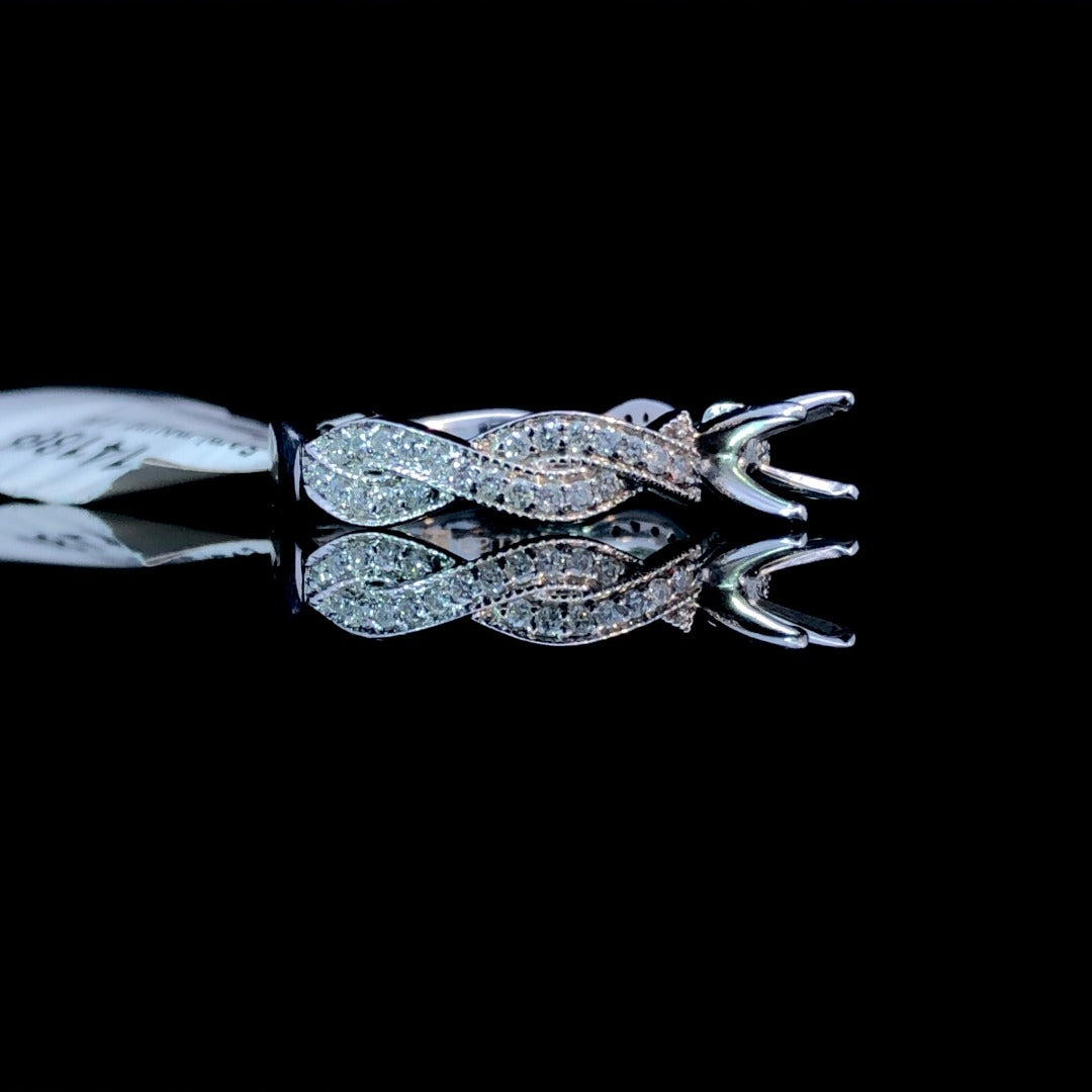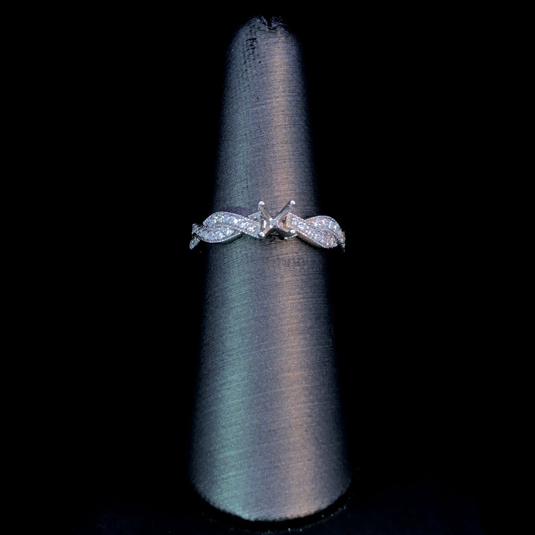 Elevate your style with this beautiful diamond semi mount ring. With a twisted band adorned with .23ctw of sparkling round diamonds, this 14kt white gold piece exudes elegance. Personalize it by choosing your own center stone from our wide range of loose stones. Complete your perfect look with this chic and versatile ring. Price is for the semi mount only. Center stone will be added at an additional cost. This ring is a size 6.5. If that size is not a perfect fit, first time sizing is free at the time of purchase. Additional sizing fees may apply.