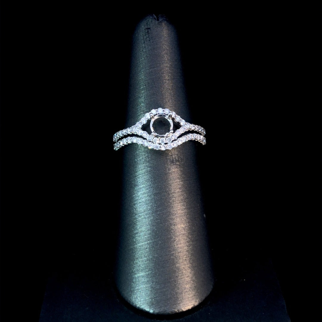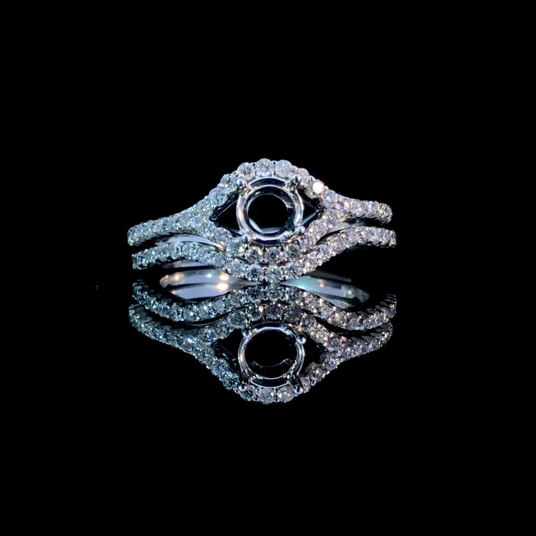 Indulge in elegance with this stunning diamond semi mount. The split shank halo design, round diamond accents, and curved contour band create a total carat weight of .59ctw in 14kt white gold. Personalize your piece with a center stone from our vast selection for a truly unique look. Price is for the semi mount only. Center stone will be added at an additional cost. This ring is a size 6.5. If that size is not a perfect fit, first time sizing is free at the time of purchase. Additional sizing fees may apply.
