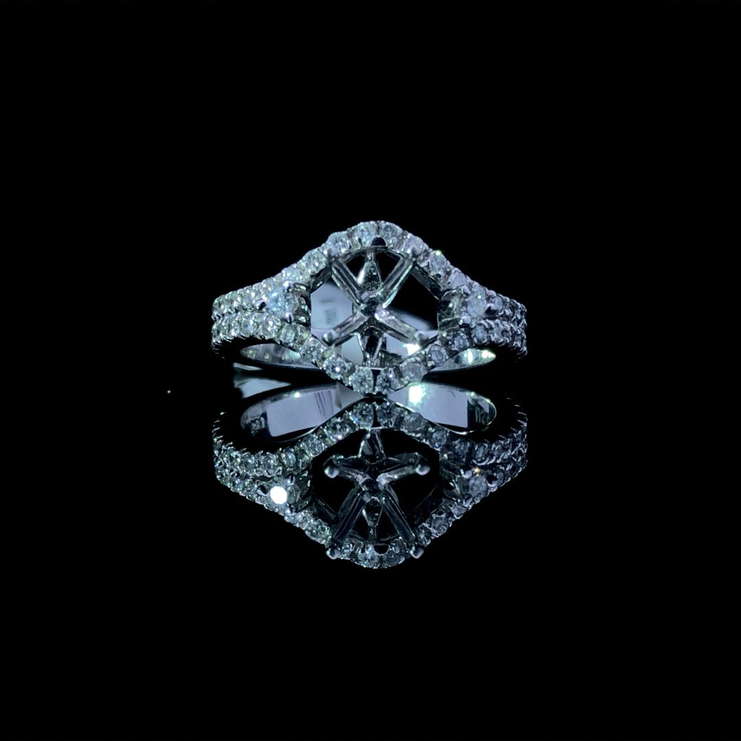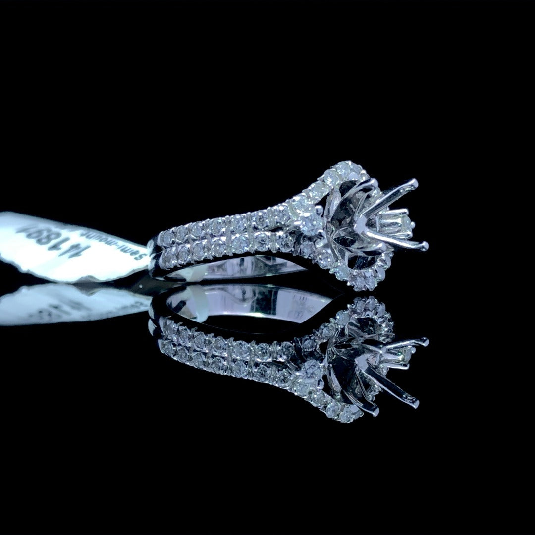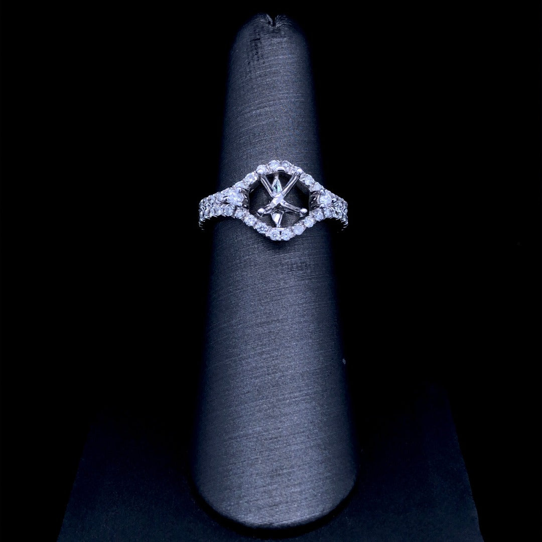 Fall in love with this stunning diamond semi-mount! Featuring a mesmerizing halo design and two raised side stones, it boasts a total weight of .50ctw, all set in luxurious 14kt white gold. Top it off with your perfect center stone from our wide range of loose stones. Price is for the semi mount only. Center stone will be added at an additional cost. This ring is a size 5.75. If that size is not a perfect fit, first time sizing is free at the time of purchase. Additional sizing fees may apply.
