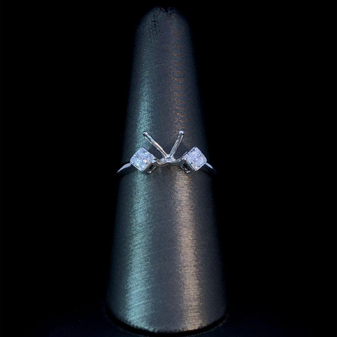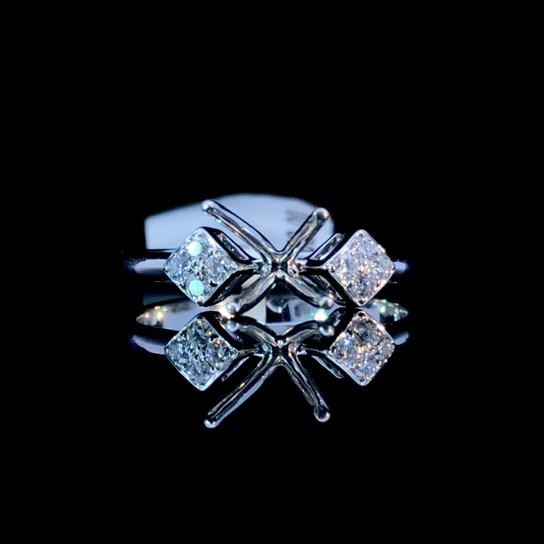 This stunning 14kt white gold semi mount sparkles with .14ctw of diamonds adorning its side clusters. Perfect for exhibiting the center stone of your choice, it offers luxury and elegance in one piece of jewelry. Price is for the semi mount only. Center stone will be added at an additional cost. This ring is a size 7.75. If that size is not a perfect fit, first time sizing is free at the time of purchase. Additional sizing fees may apply.