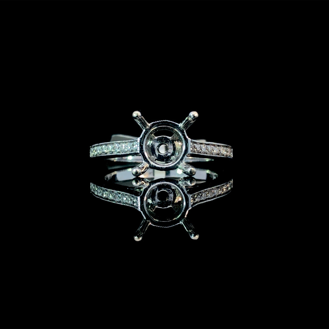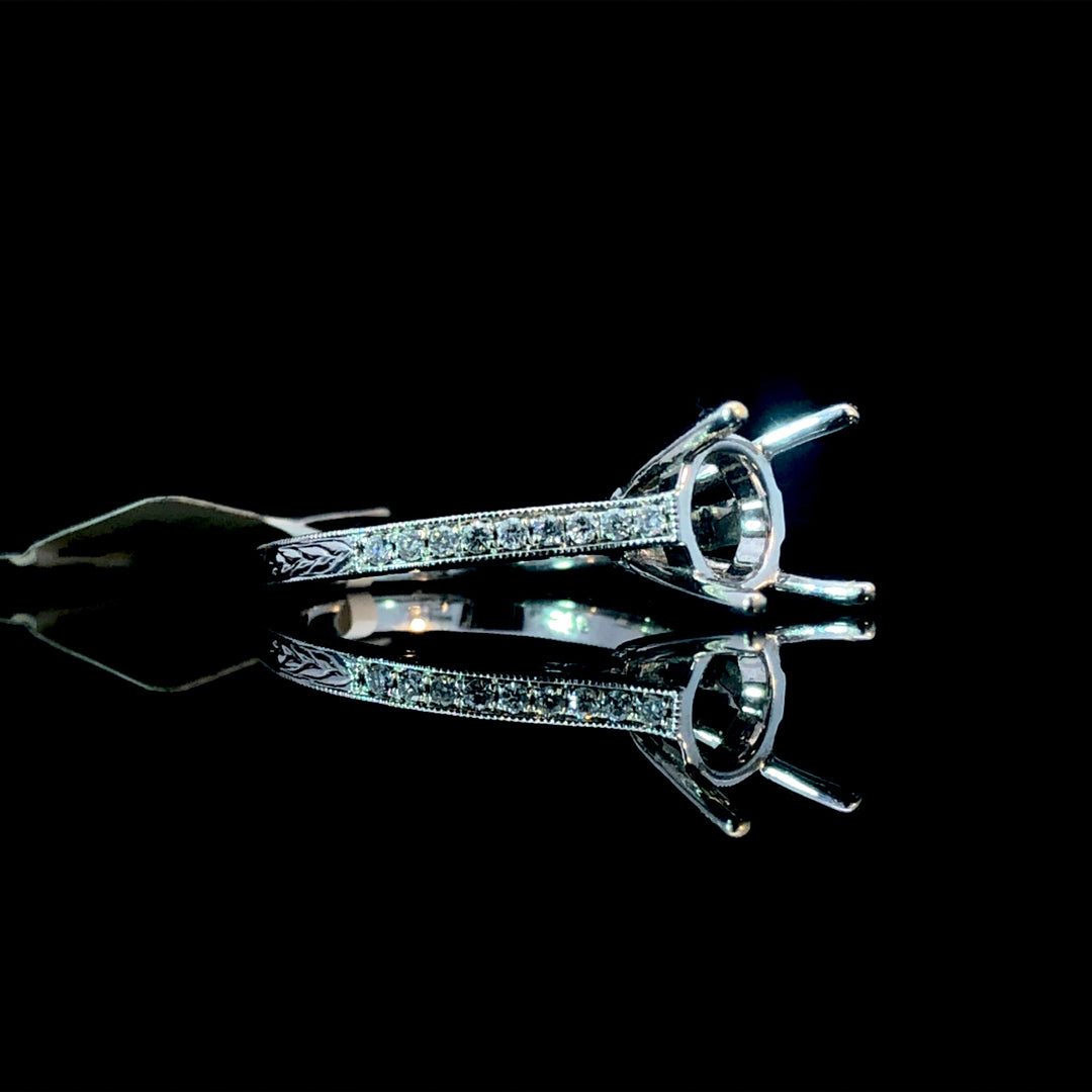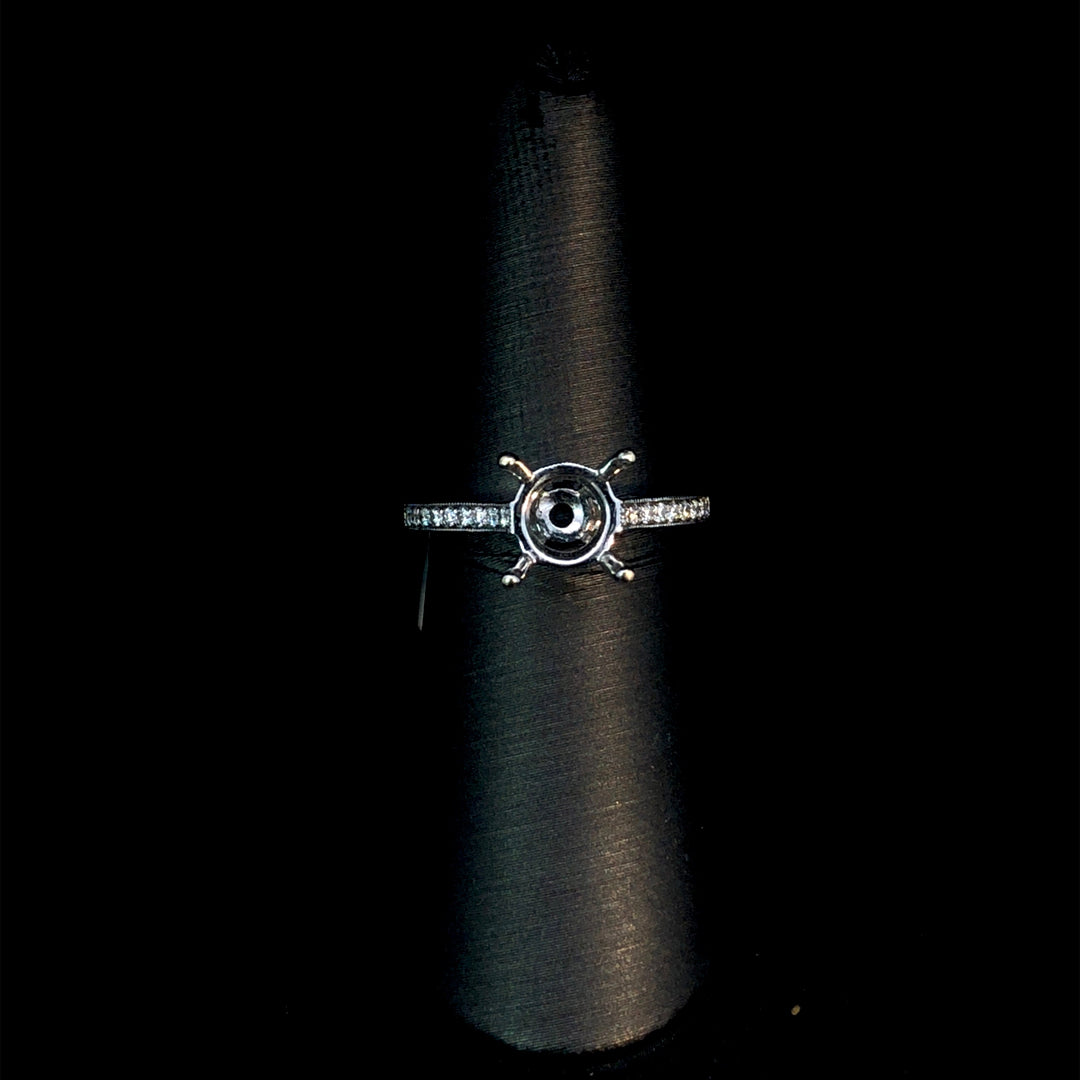 This elegant semi mount showcases the timeless appeal of a classic design crafted in 14kt white gold. The band features .18ctw of sparkling round diamonds complemented by delicate milgrain detailing and intricately engraved accents that add depth and character. Perfect for those who want to personalize their engagement ring, this semi mount allows you to select your own center stone from our curated collection of loose diamonds and gemstones. Create a truly one-of-a-kind piece that reflects your unique style and vision. Price is for the semi mount only. Center stone will be added at an additional cost. This ring is a size 6.5. If that size is not a perfect fit, first time sizing is free at the time of purchase. Additional sizing fees may apply.