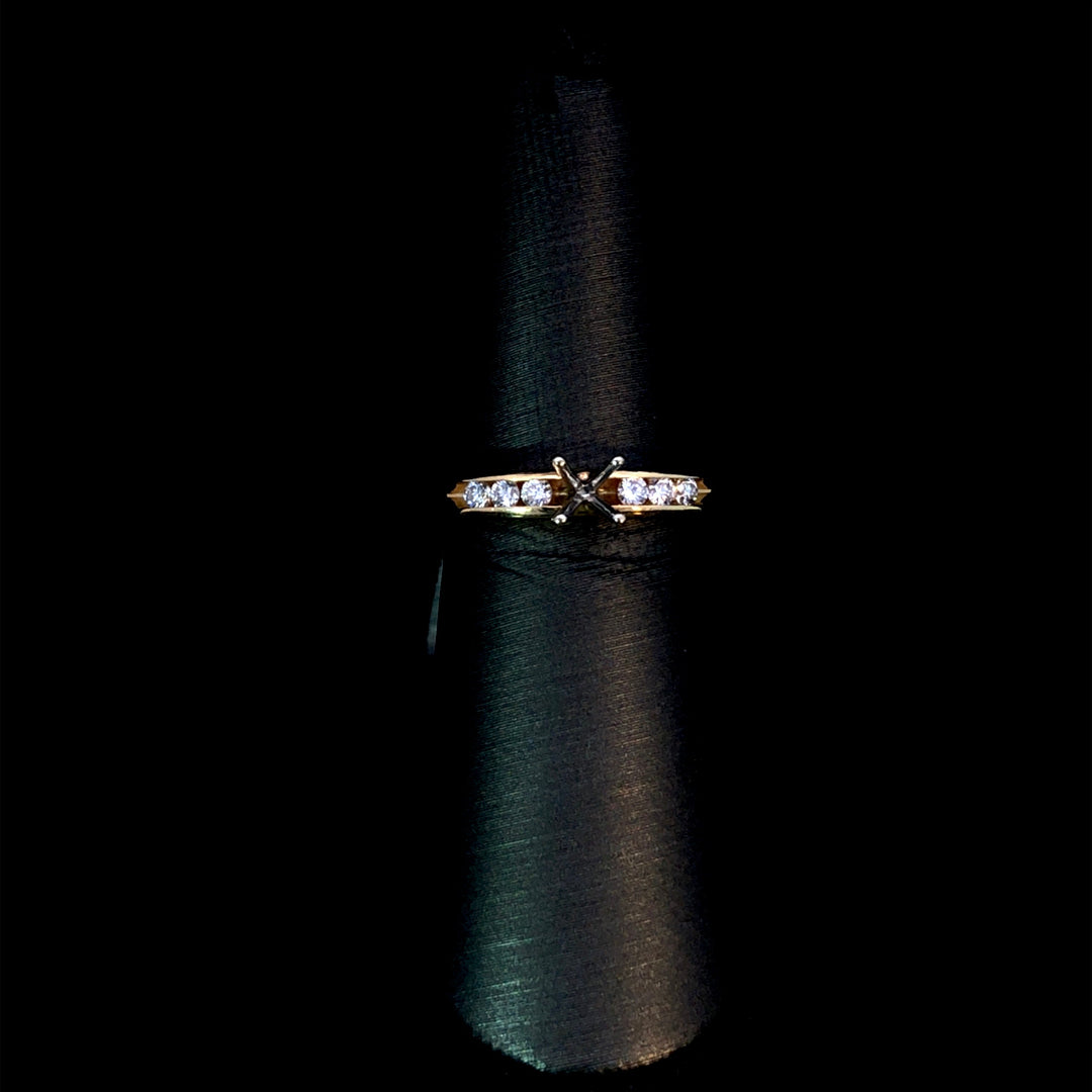 This elegant semi mount in 14kt yellow gold showcases .18ctw of round diamonds set in a secure channel setting. Designed to complement your choice of center stone, it offers a perfect foundation to create a personalized and timeless piece that celebrates your unique style. Price is for the semi mount only. Center stone will be added at an additional cost. This ring is a size 6.5. If that size is not a perfect fit, first time sizing is free at the time of purchase. Additional sizing fees may apply.