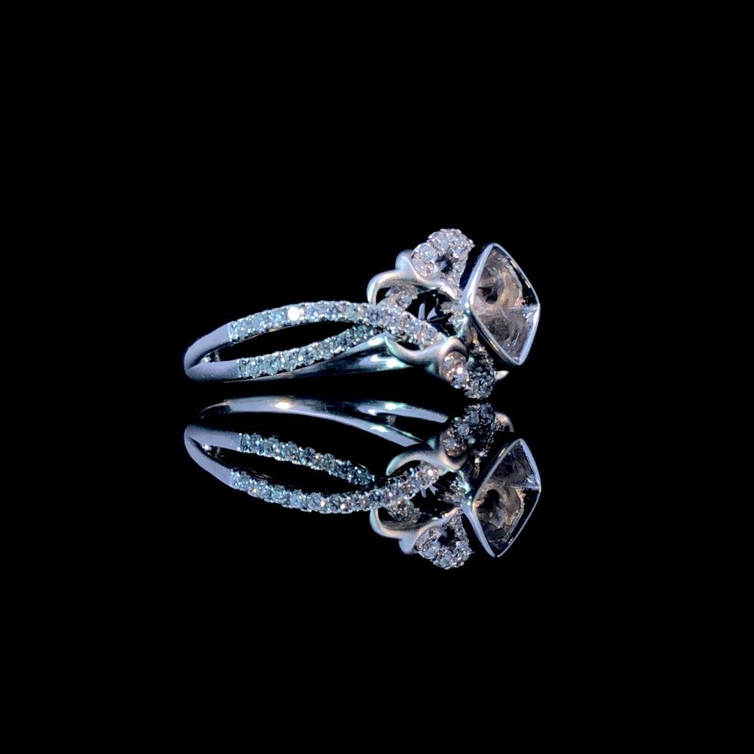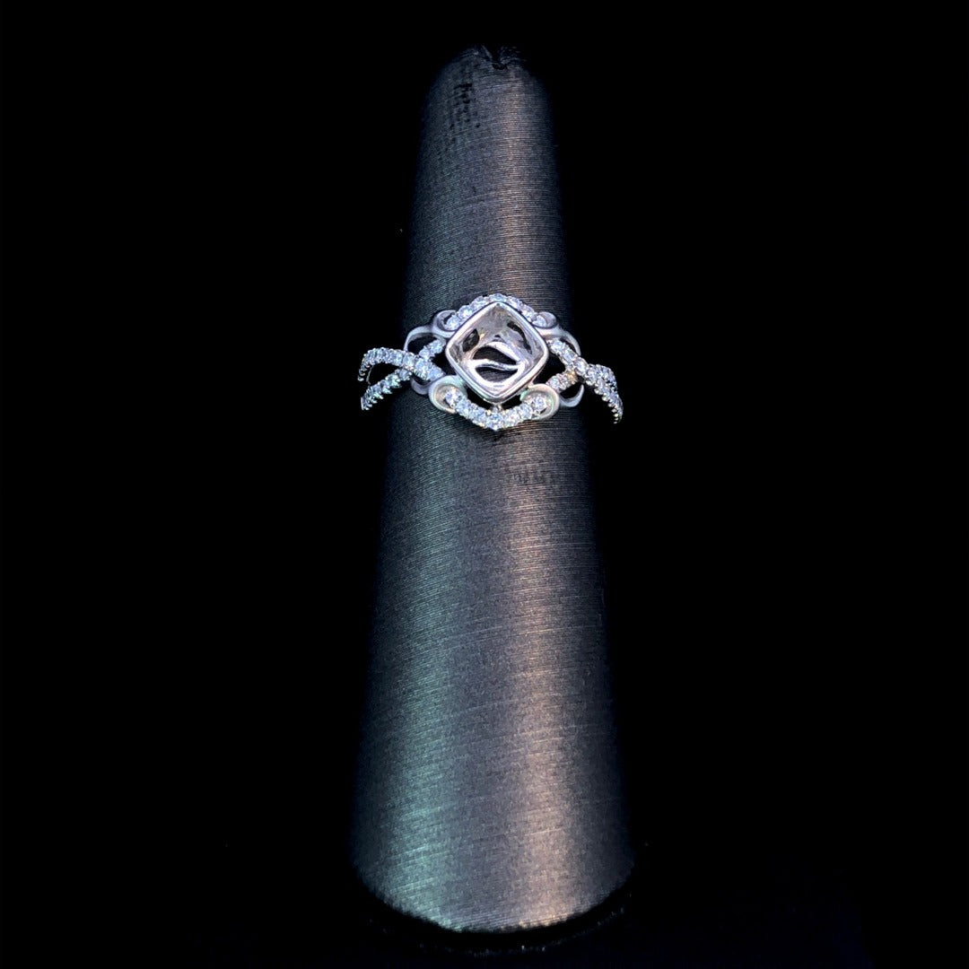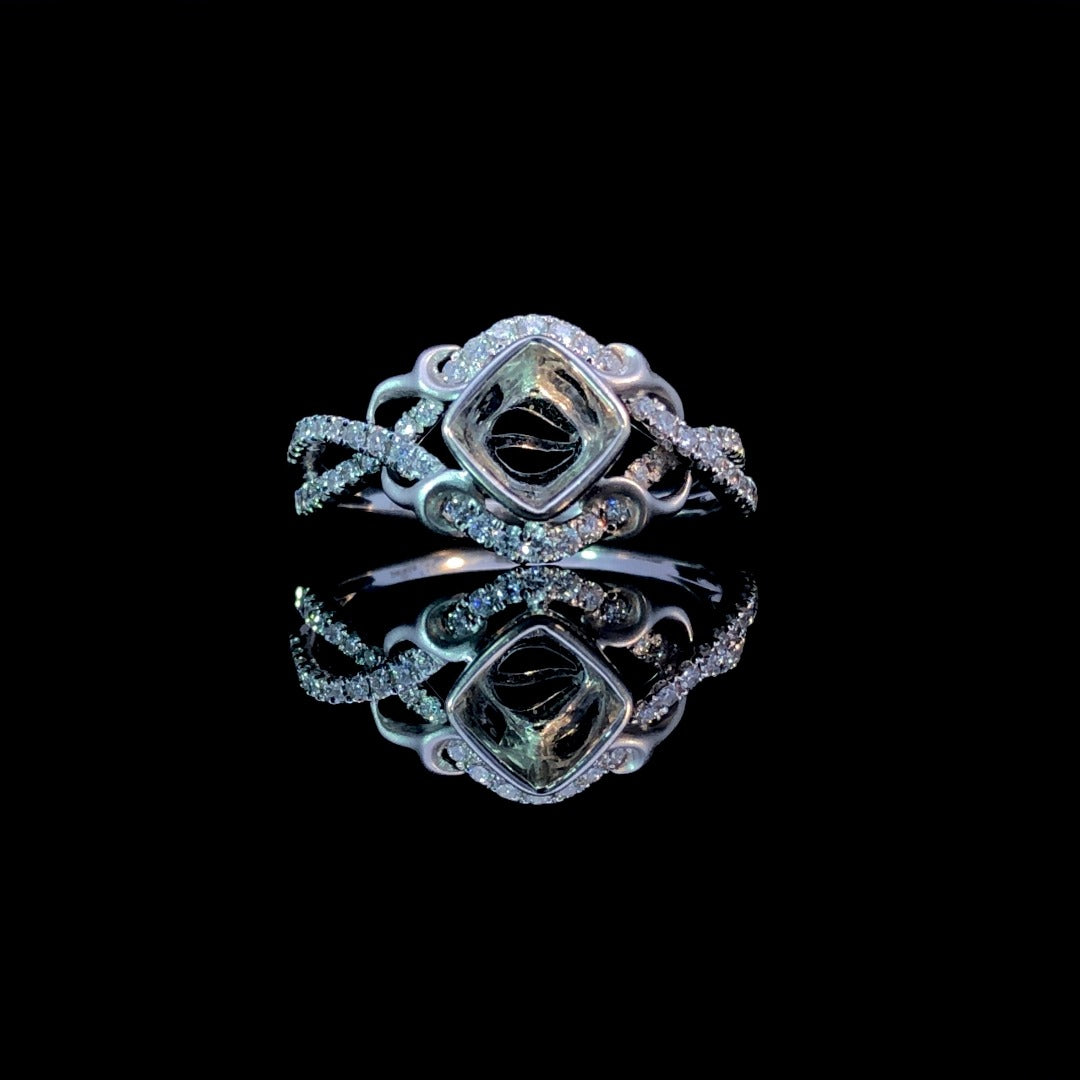 This stunning diamond semi mount features a unique crisscross shank design and .26ctw of sparkling round diamond accents. The 14kt white gold with a satin finish adds even more detail to this eye-catching ring. Choose from our wide selection of loose stones to complete your perfect ring. Price is for the semi mount only. Center stone will be added at an additional cost. This ring is a size 6. If that size is not a perfect fit, first time sizing is free at the time of purchase. Additional sizing fees may apply.