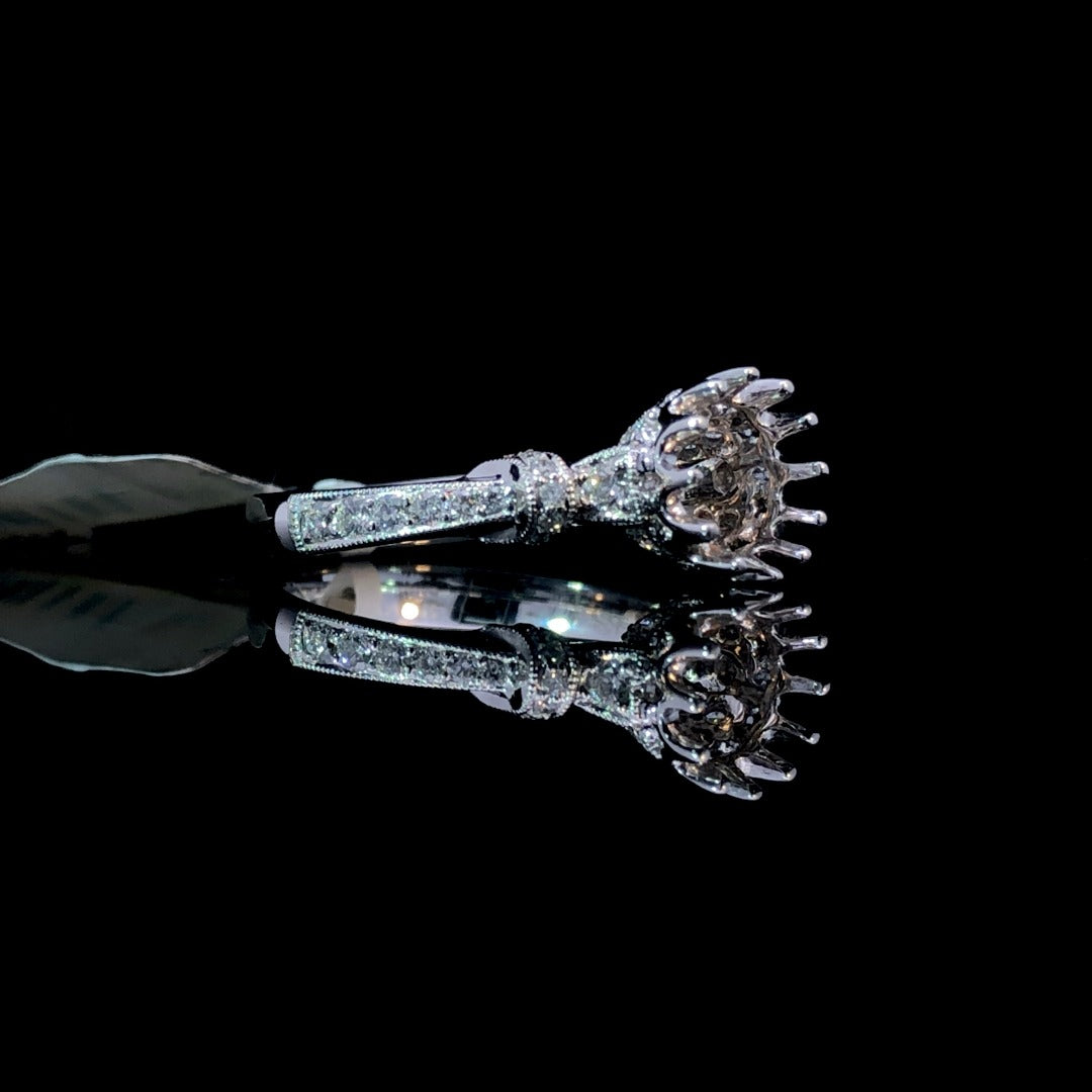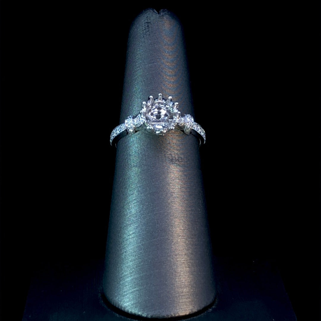 This exquisite semi-mount ring is a luxurious choice for a special occasion. Crafted with a crown-style head and intricately detailed loop designs along the shank, this 14kt white gold ring sparkles with .30ctw of round diamonds. The perfect setting for a precious center stone of your choosing, it will make any day a treasured memory. Price is for the semi mount only. Center stone will be added at an additional cost. This ring is a size 6. If that size is not a perfect fit, first time sizing is free at the time of purchase. Additional sizing fees may apply.